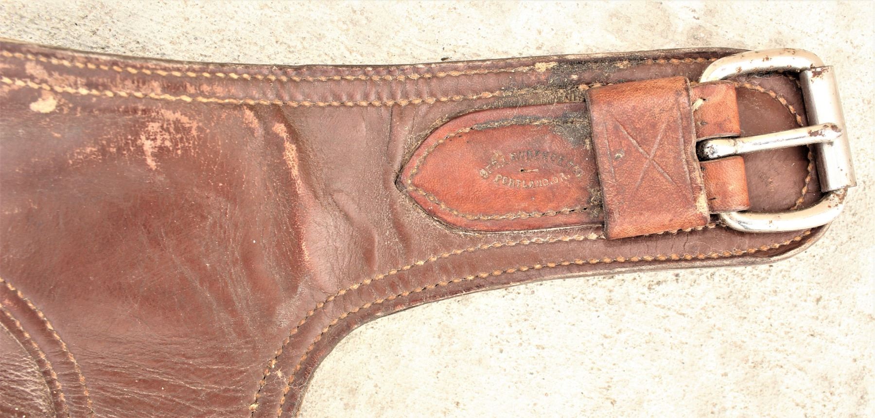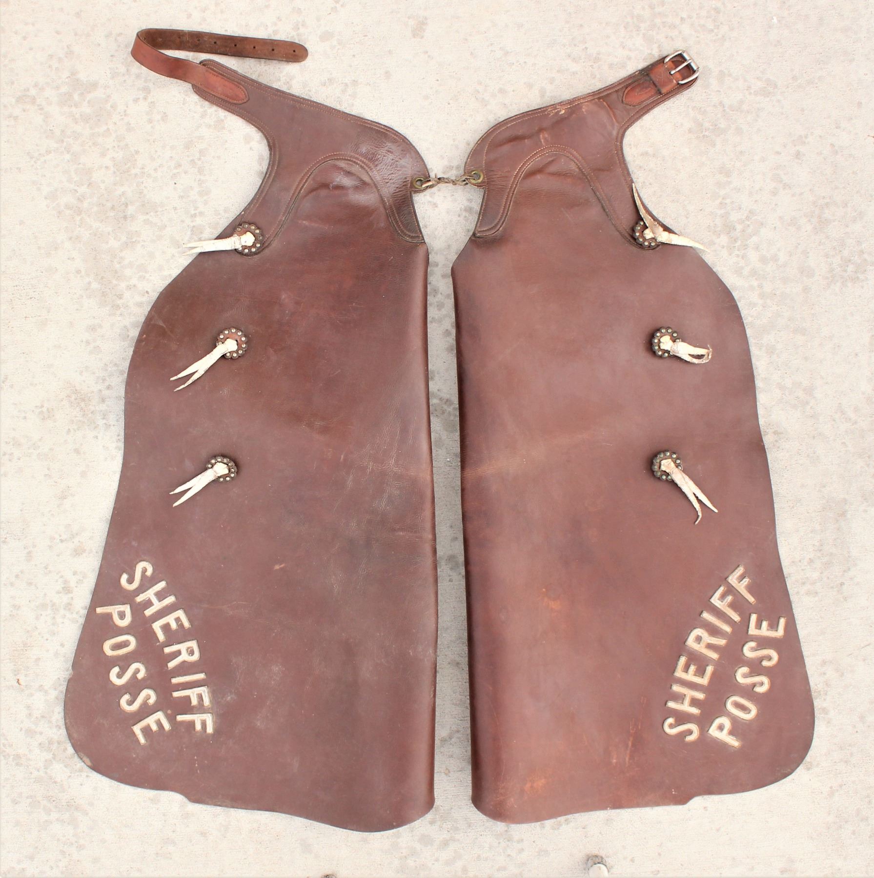 Large pair chocolate leather batwing chaps with oversized wings, decorative saddlestring rosettes, overlaid "Sheriff Posse" in the lower corners, and nice makers mark.