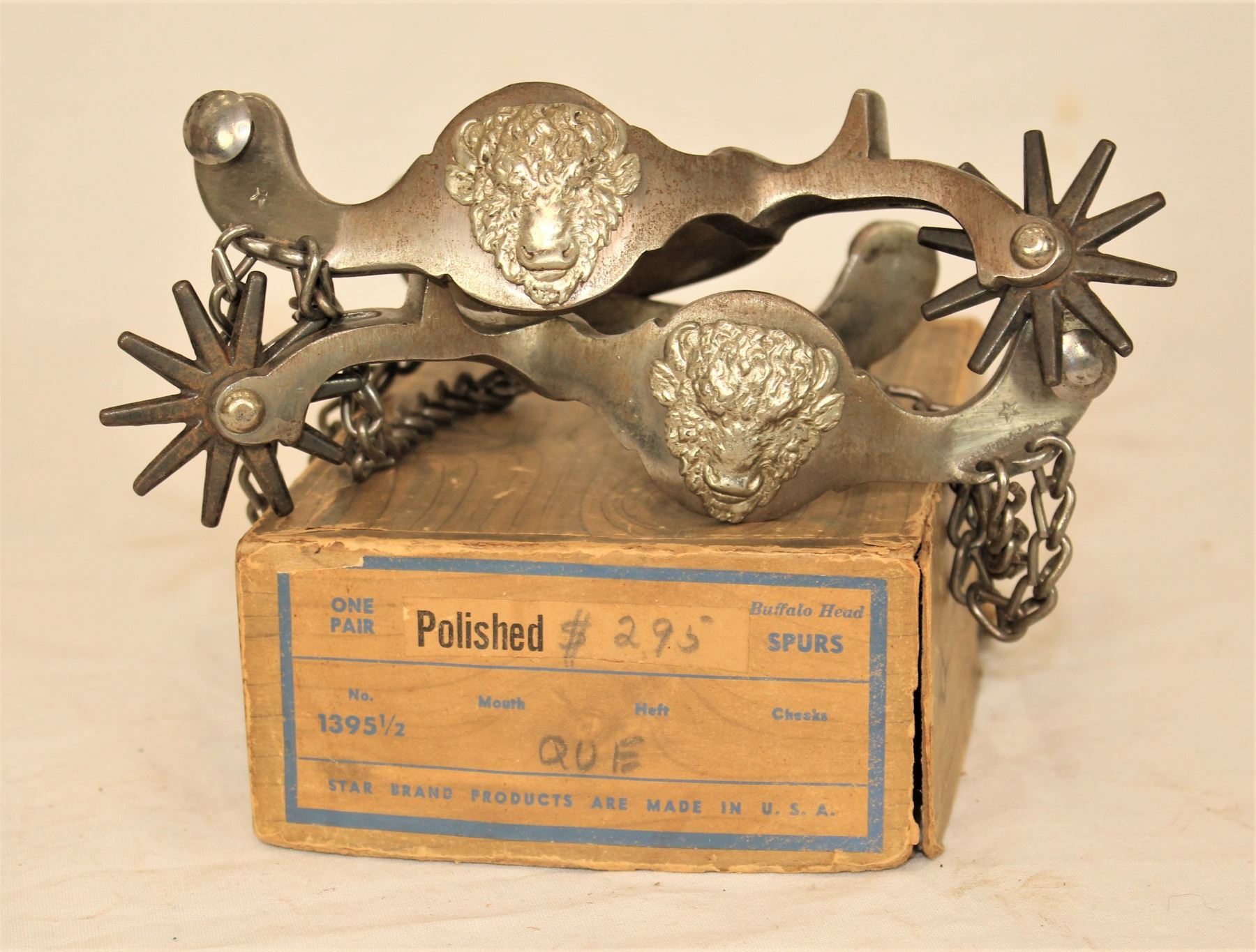 Amazingly rare, a pair of crisp iron buffalo head spurs with Star AB marks, accompanied by their original retail box.