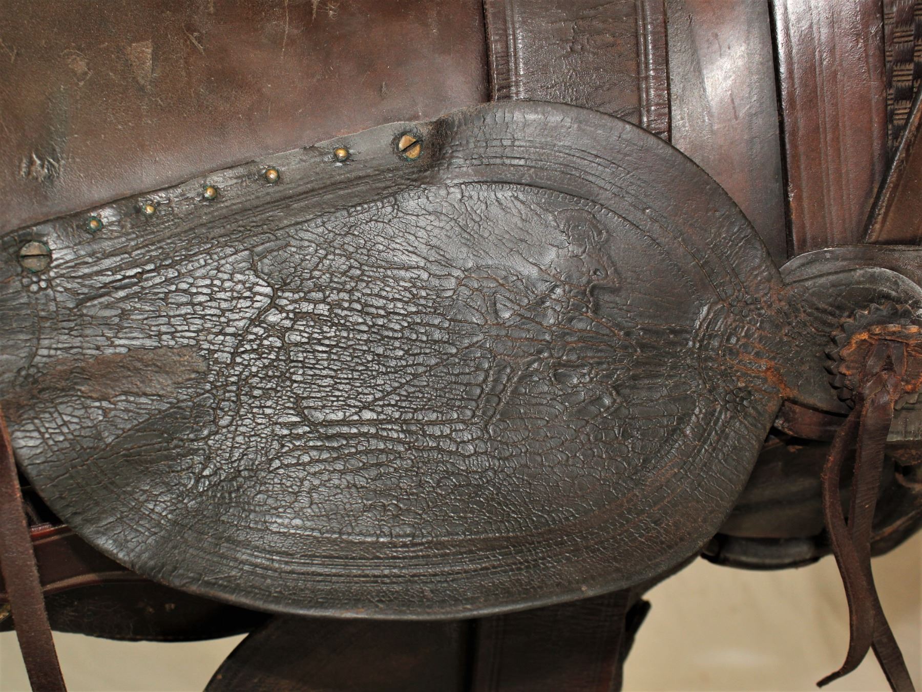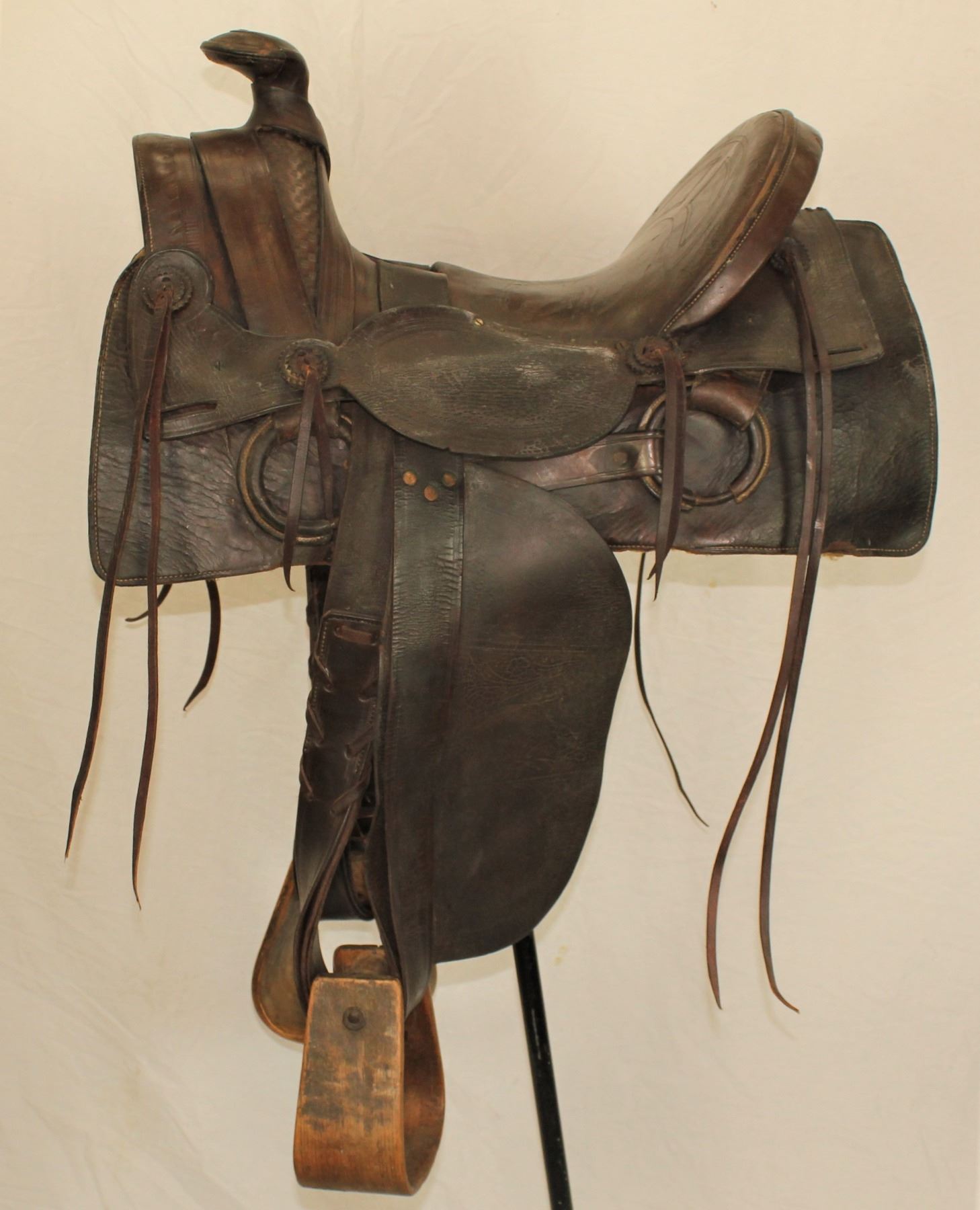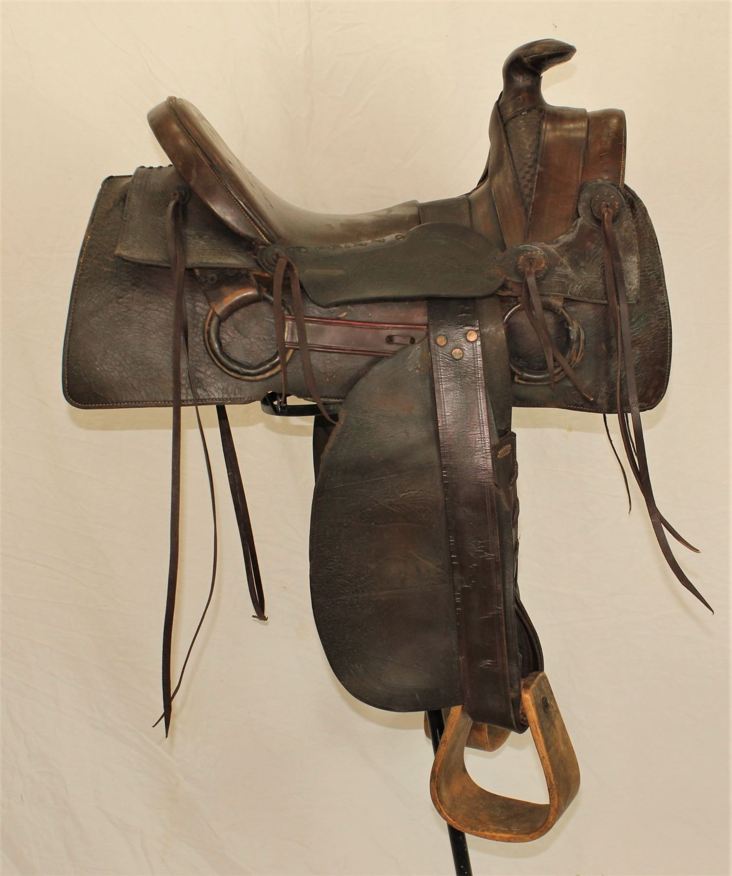 Large loop seat saddle with square skirts, Cheyenne rolled cantle, and SamStagg rigged slick fork front end, from one of the most desirable makers of western memorabilia.
