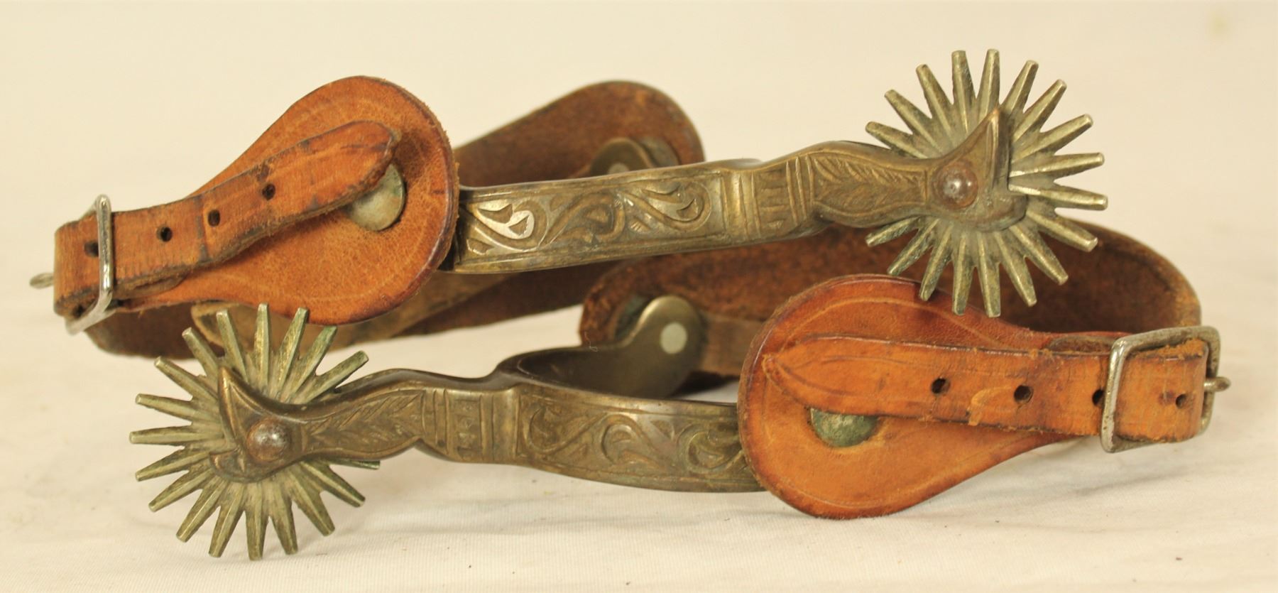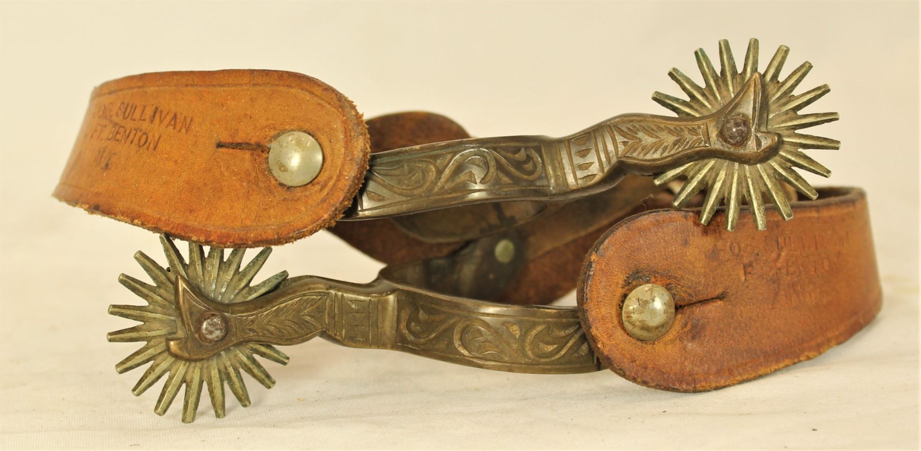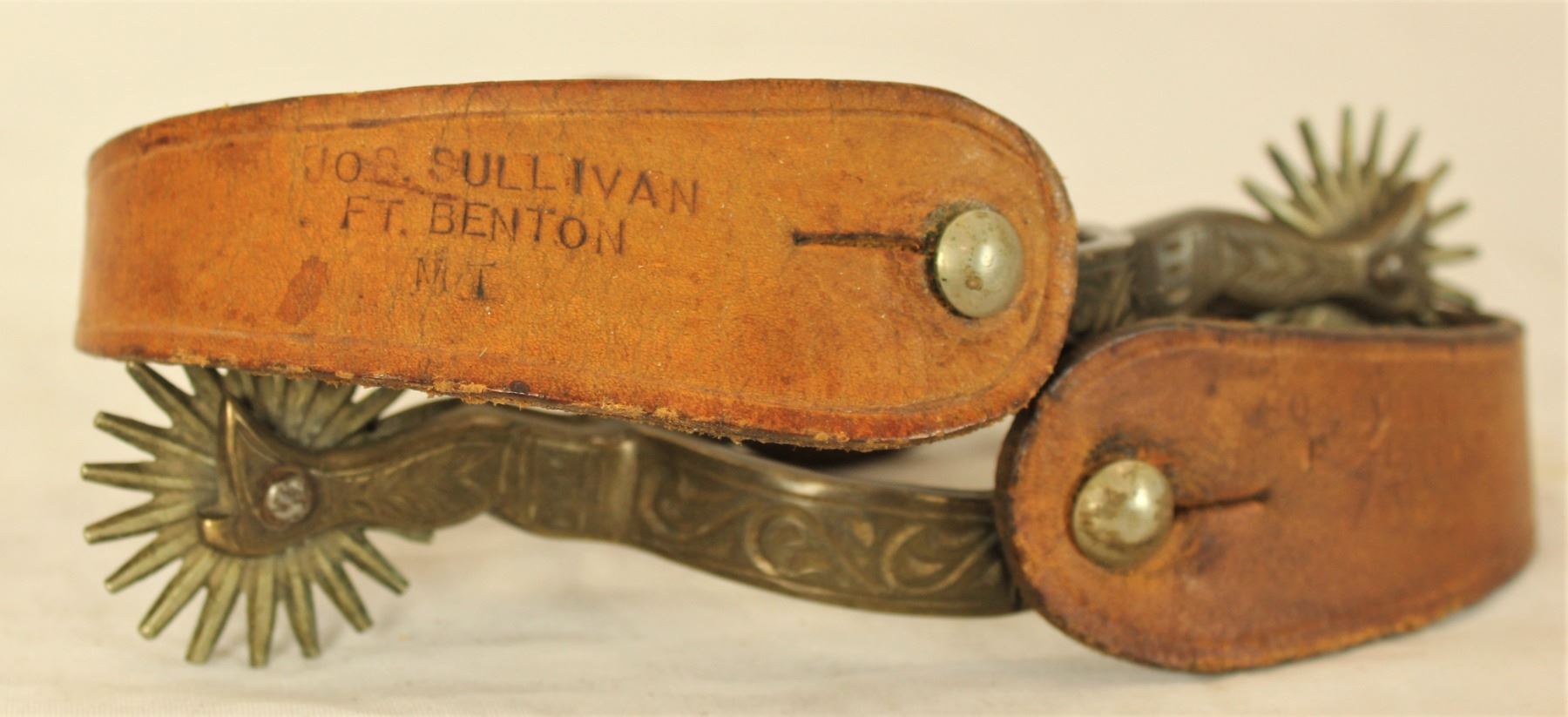 Incredibly rare ladies size early AB Star marked hercules bronze lady leg spurs with deeply engraved heelbands and huge multi-point rowels, accompanied by a super scarce pair of Ft Benton, Montana Territory, Joseph Sullivan marked strap and heel straps. All in near mint condition.