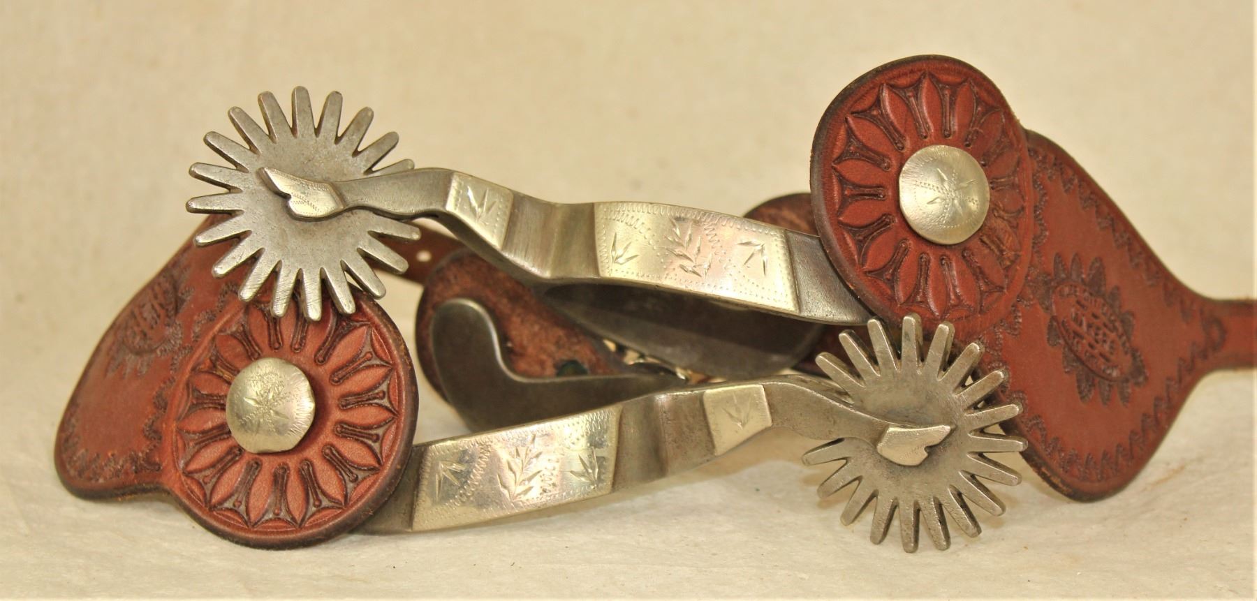 Good looking single mounted lady leg spurs with large rowels and maker's mark under the button. Roger Wilmot Collection