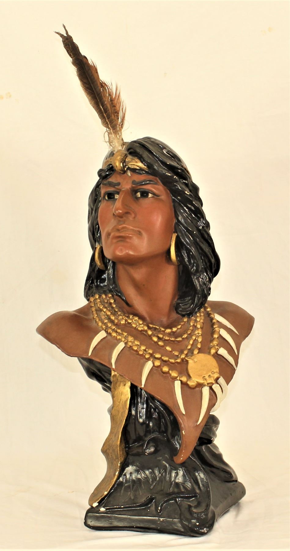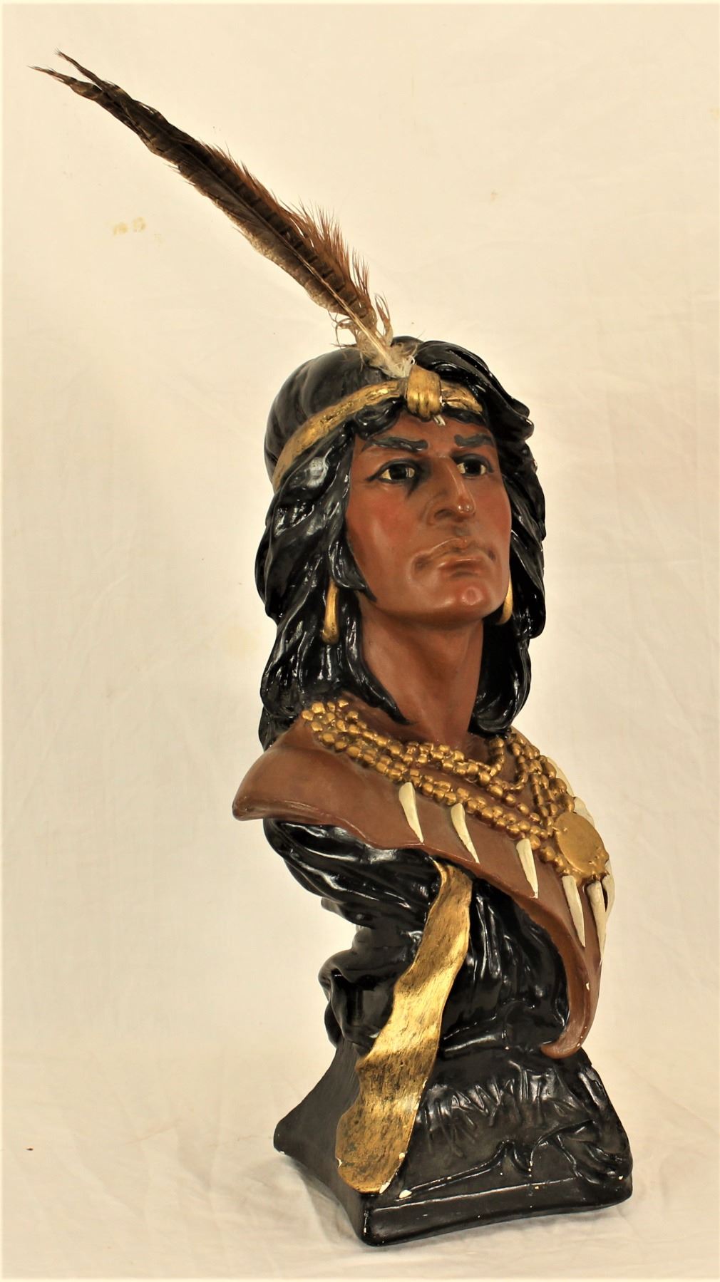 Appealing 20" tall chalk bust of an Indian brave for countertop cigar store display.