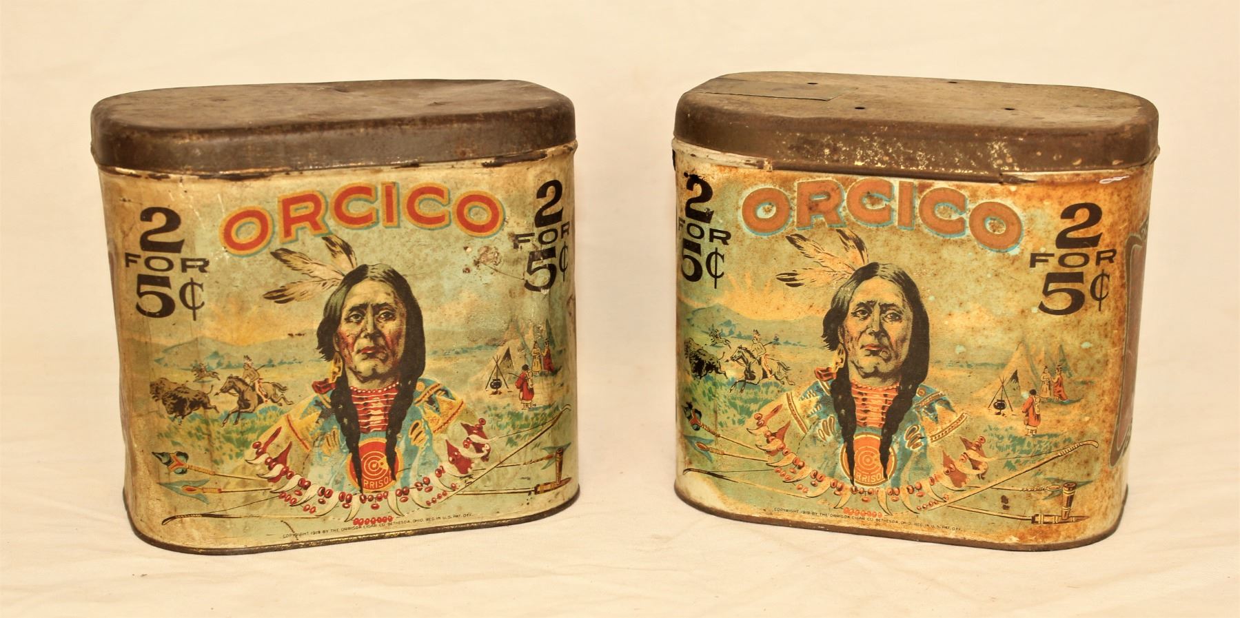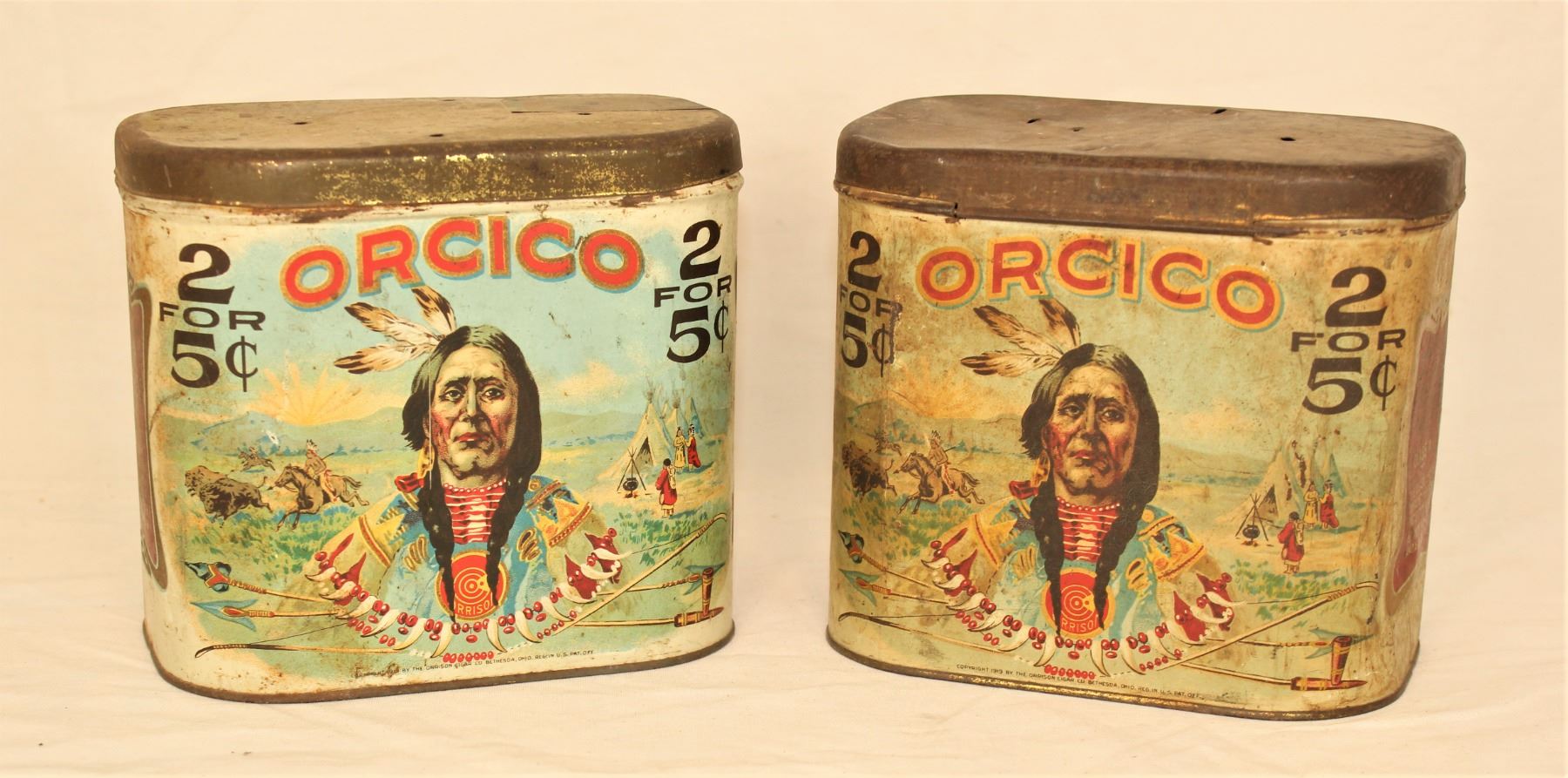 Grouping of two desirable Orcico Cigar tins, with Indian motif and great colors.