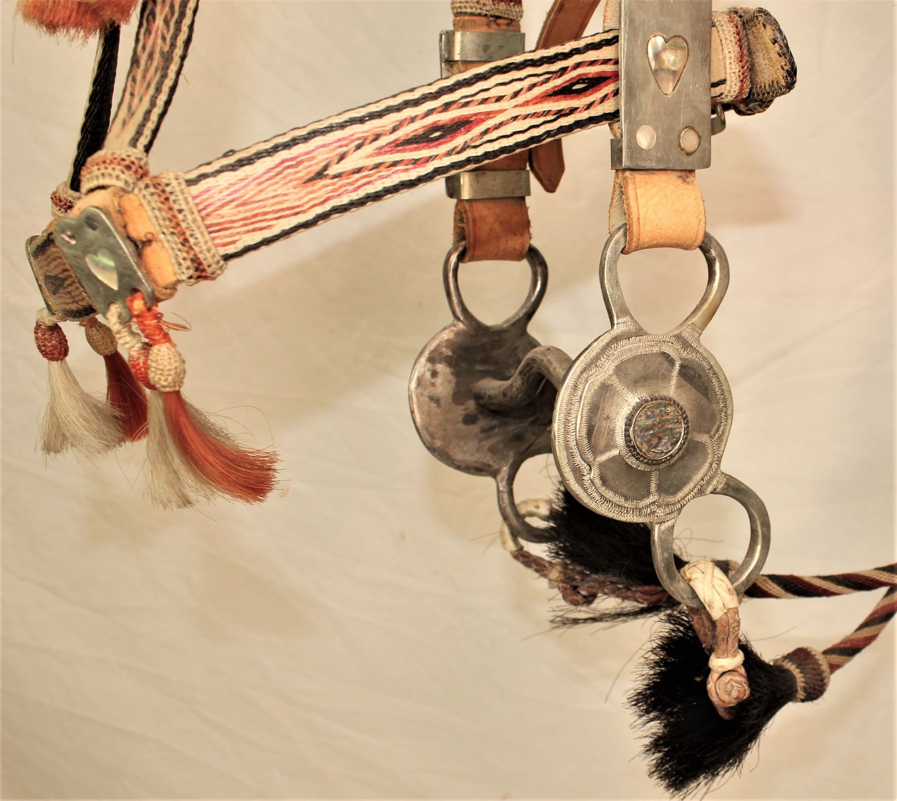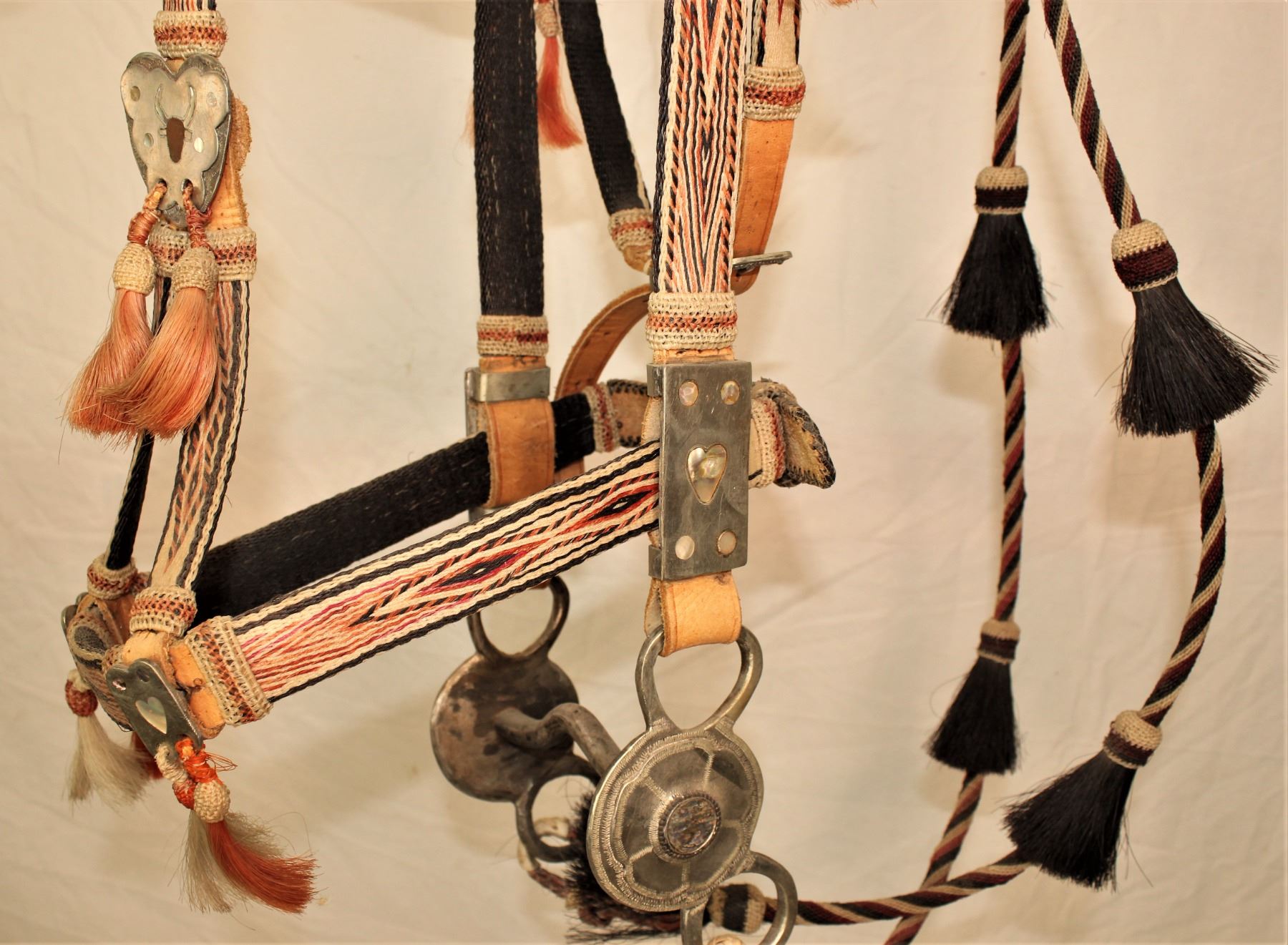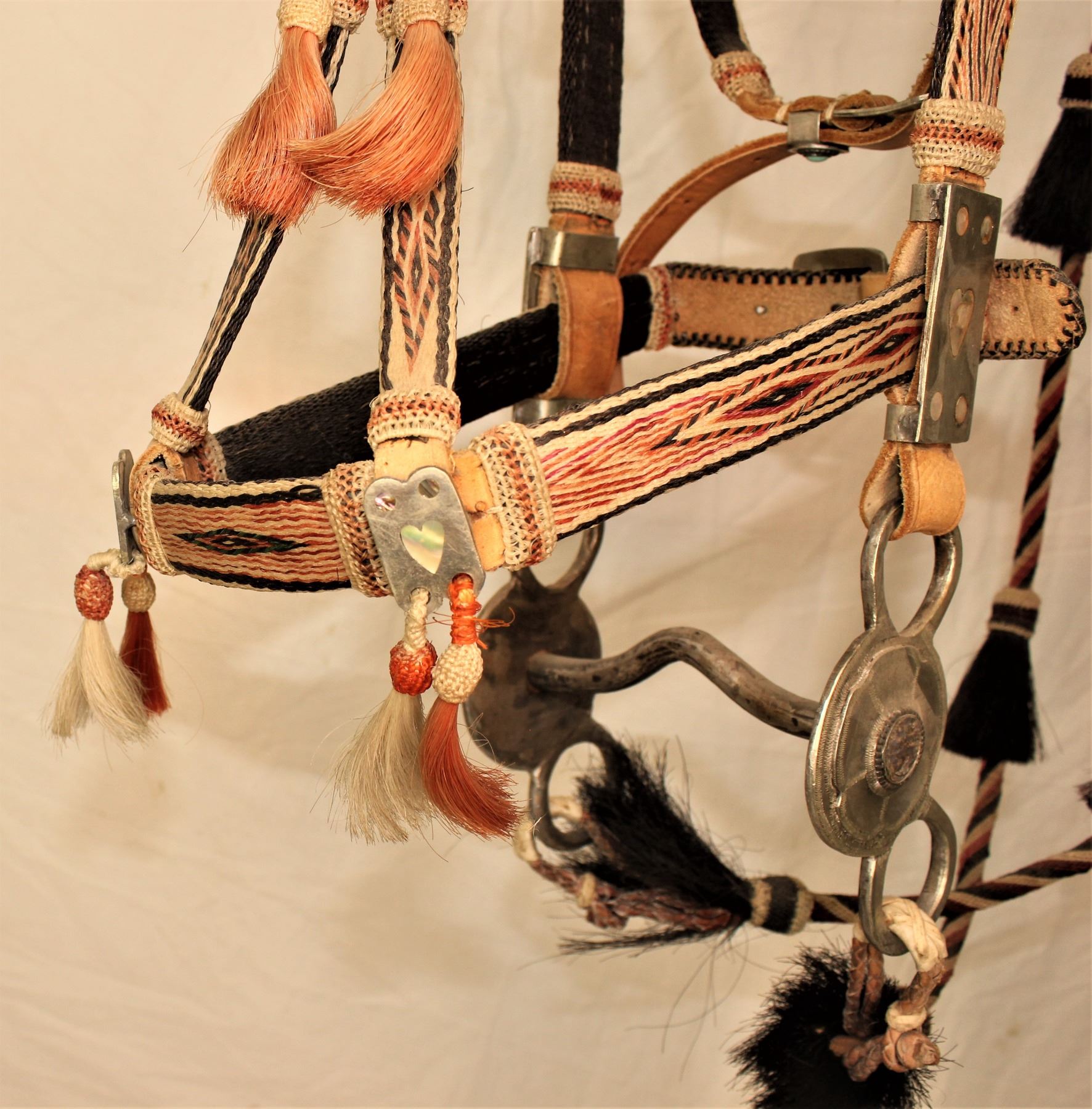 Very unique four colored hitched horsehair bridle, mounted with decorative mother of pearl inlaid silver that includes pictorial steerhead. Roger Wilmot Collection