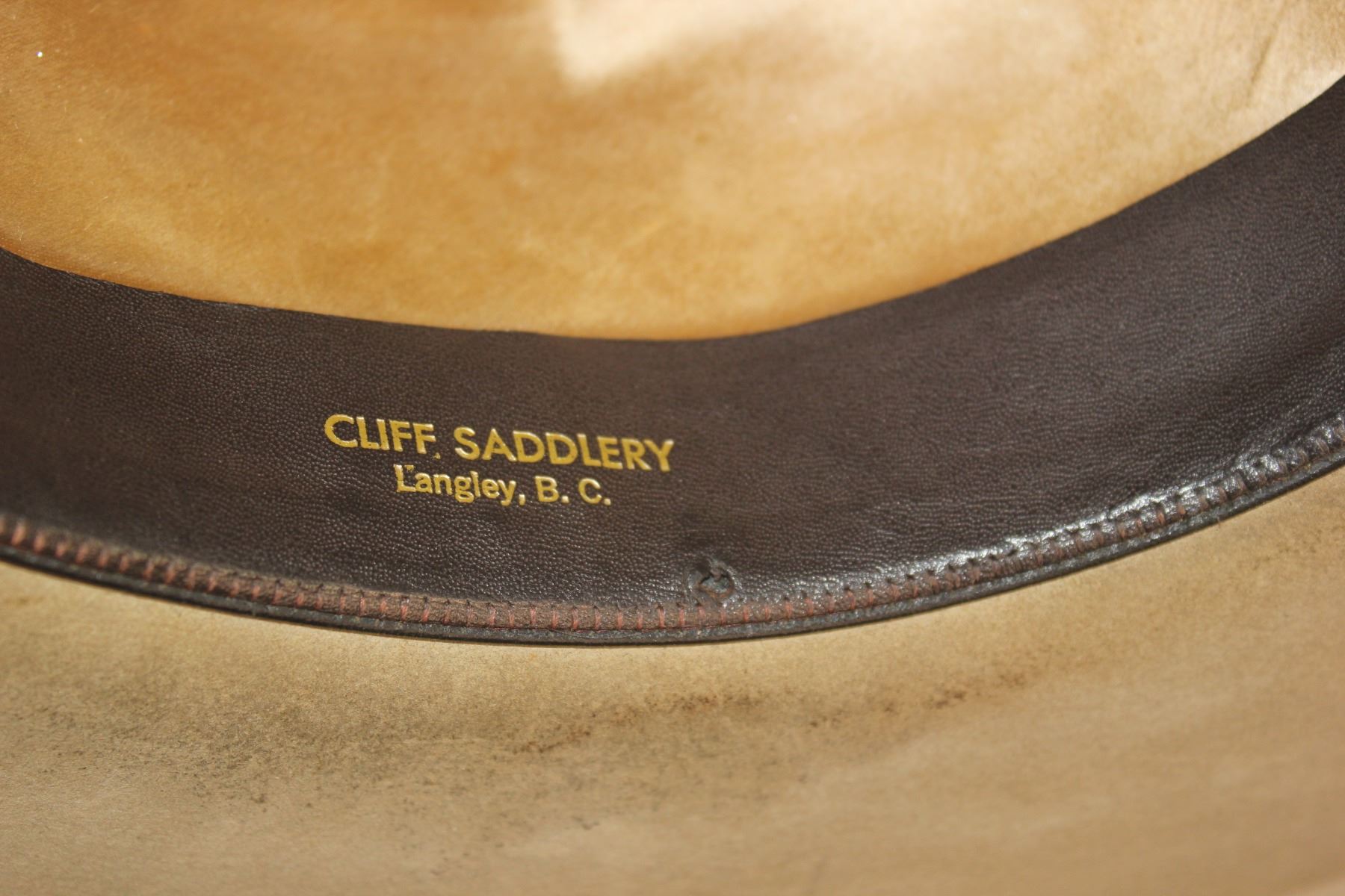 Interesting hat sold by Cliff Saddlery of Calgary, that is accompanied by a homemade wooden hat holder that preserves its shape.