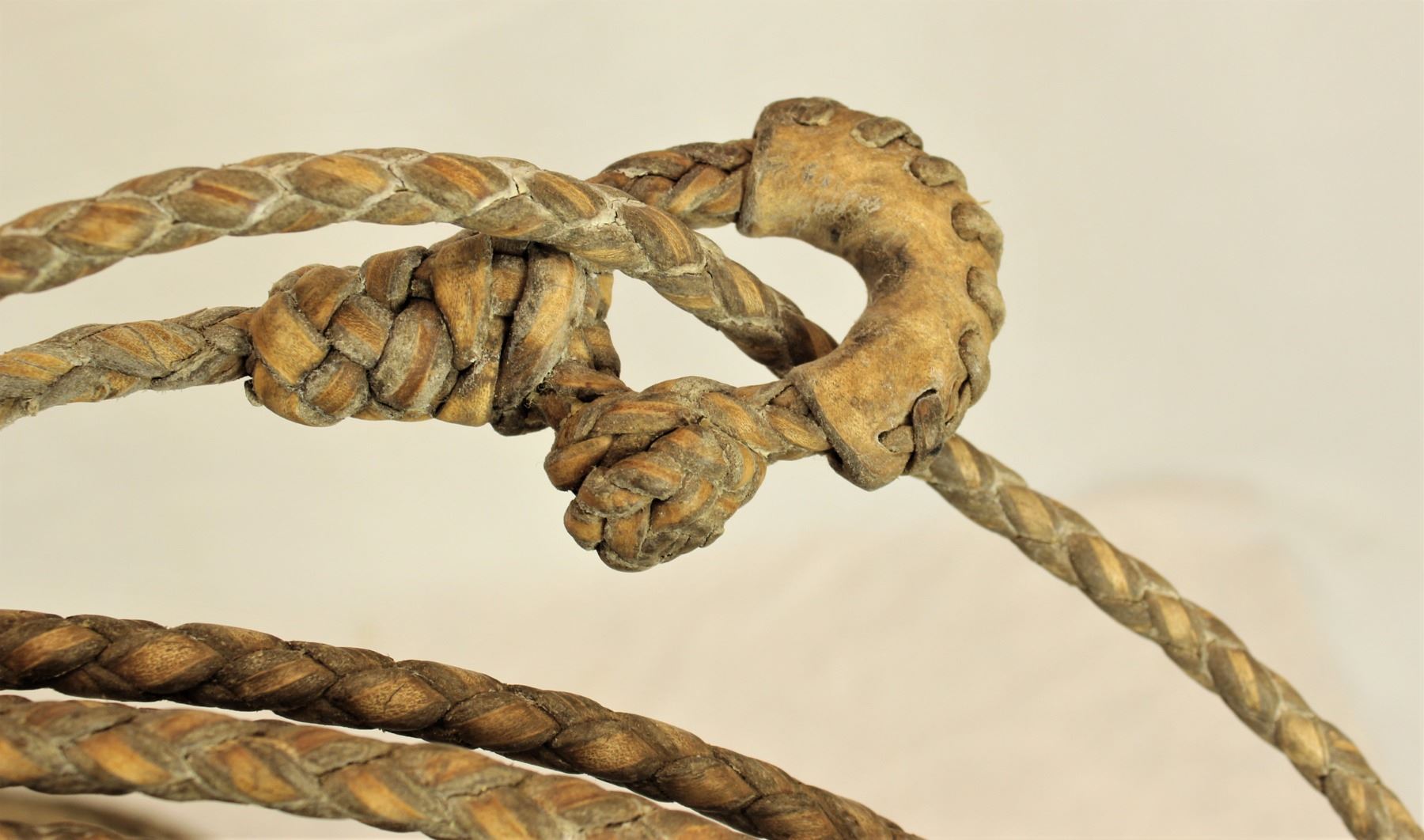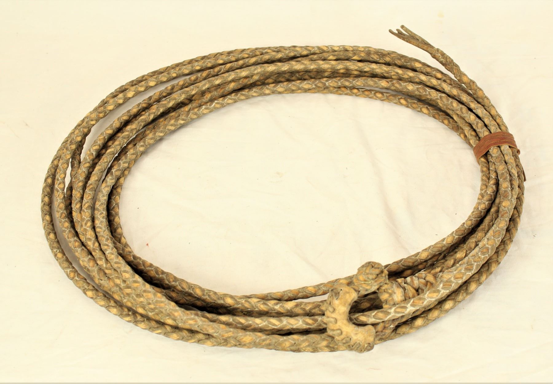 Four plait rawhide riata, measuring approximately 30 feet long, with appealing braided hondo, patinaed color and four strand tails.