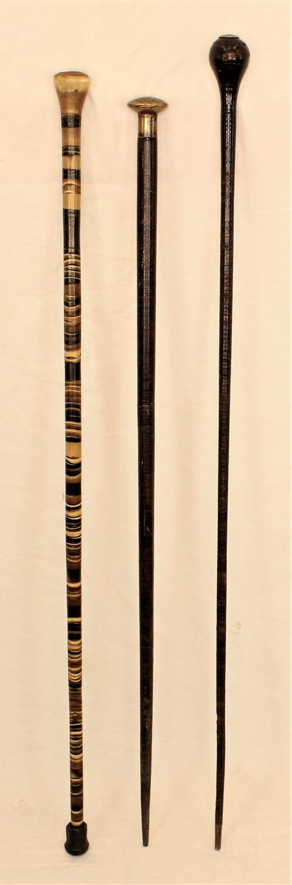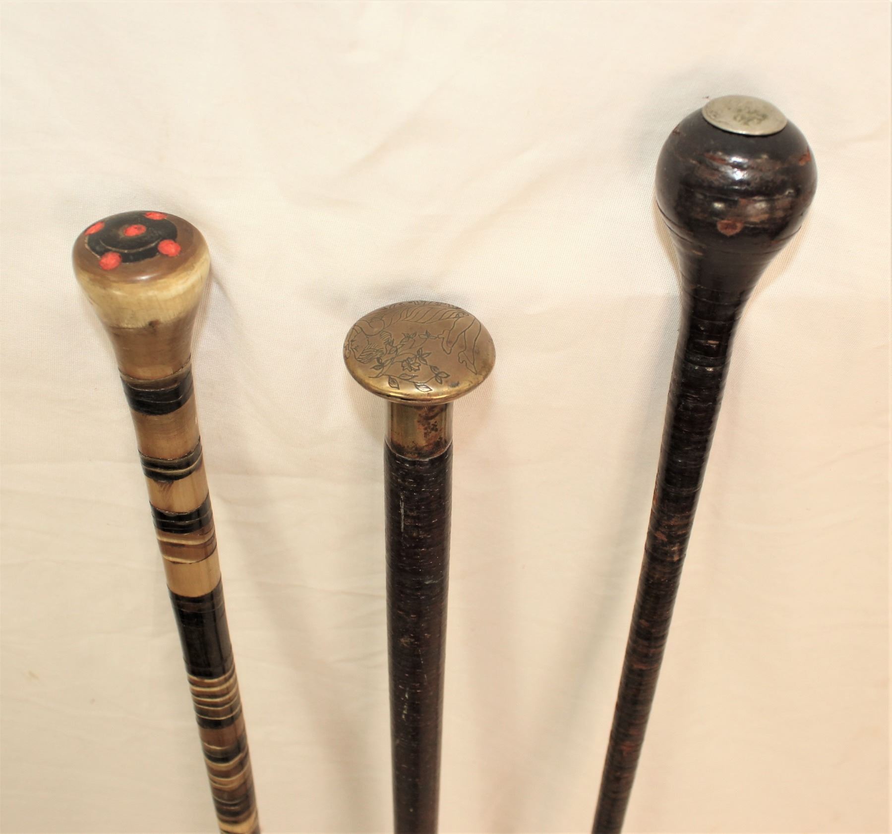 Grouping of three walking sticks, comprised of two leather washer canes and a horn cane.