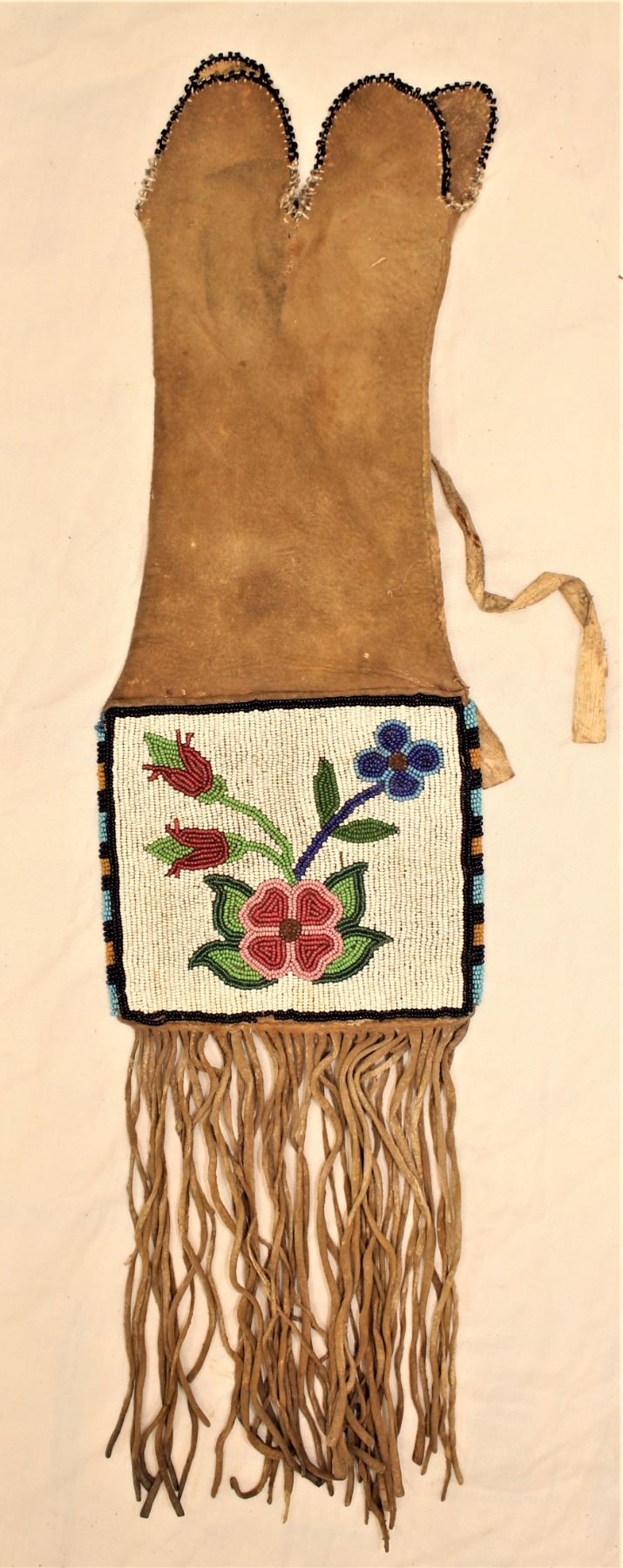Very nice tabbed bag with floral beaded body and fine long fringe. Measuring 7" x 23".