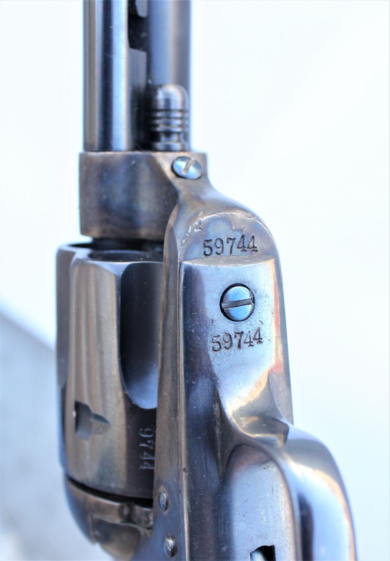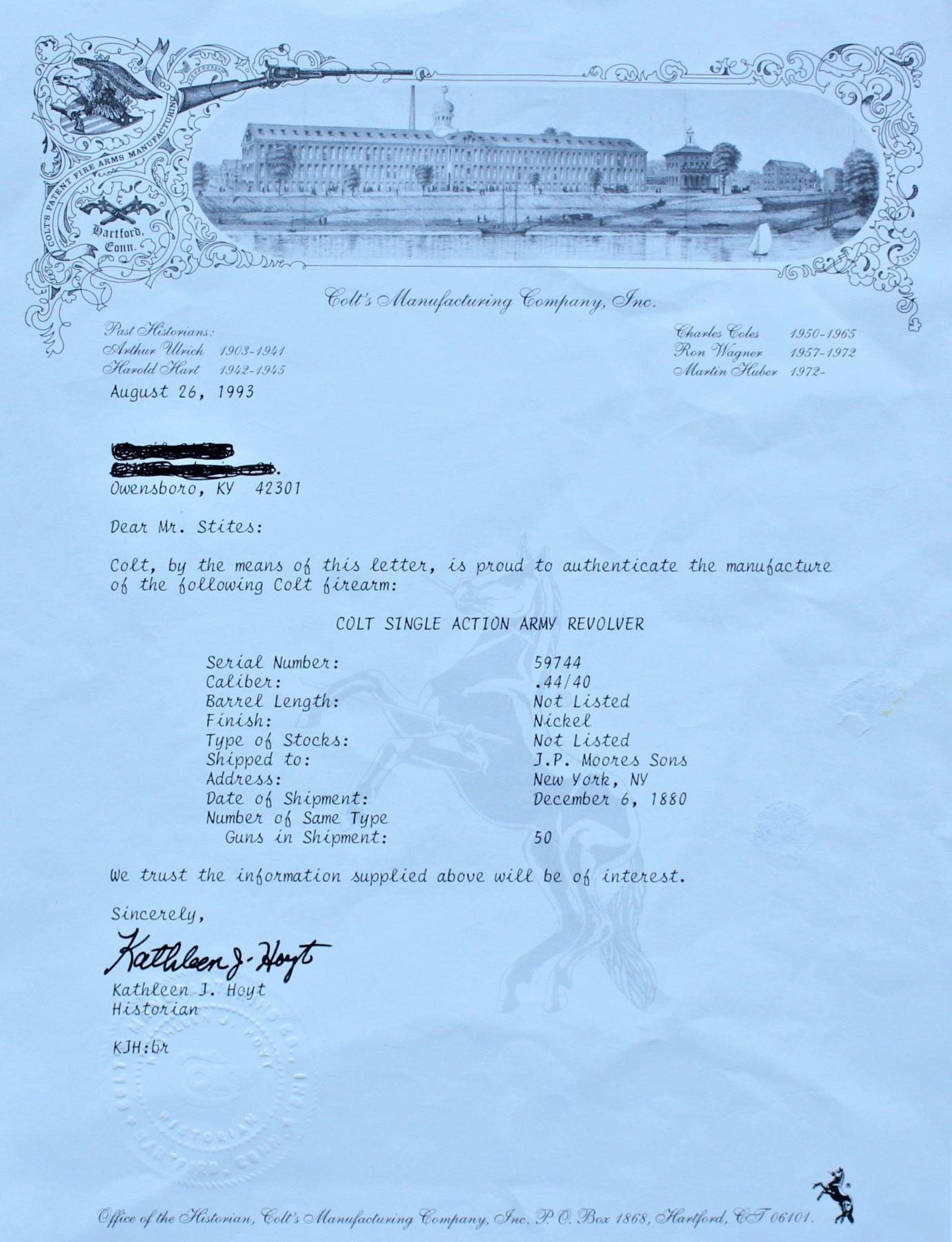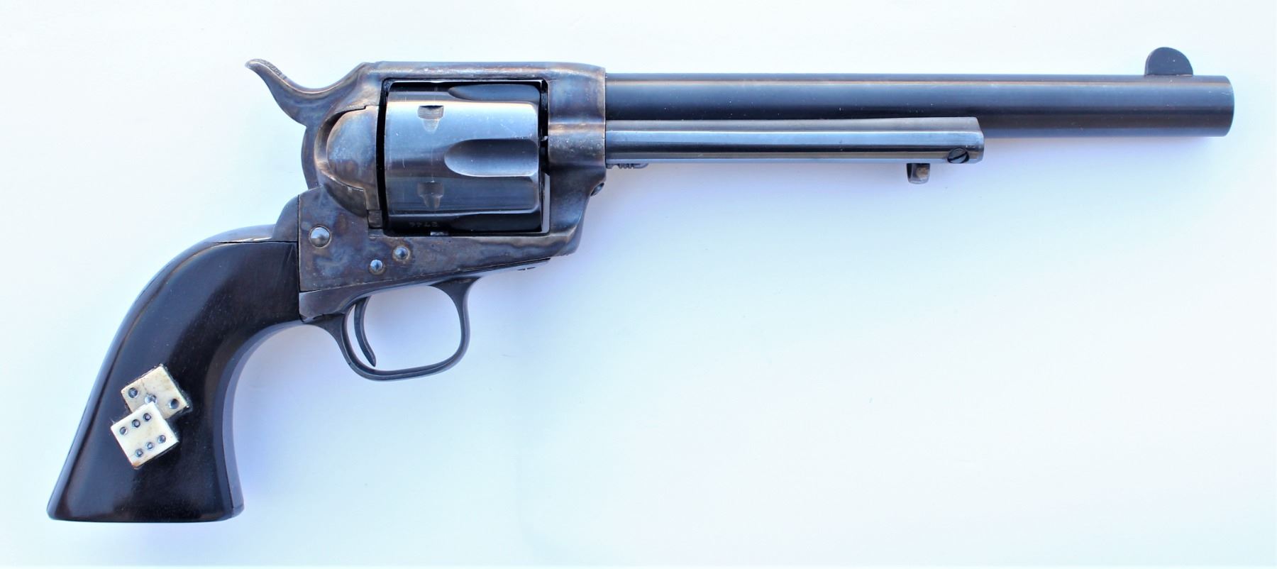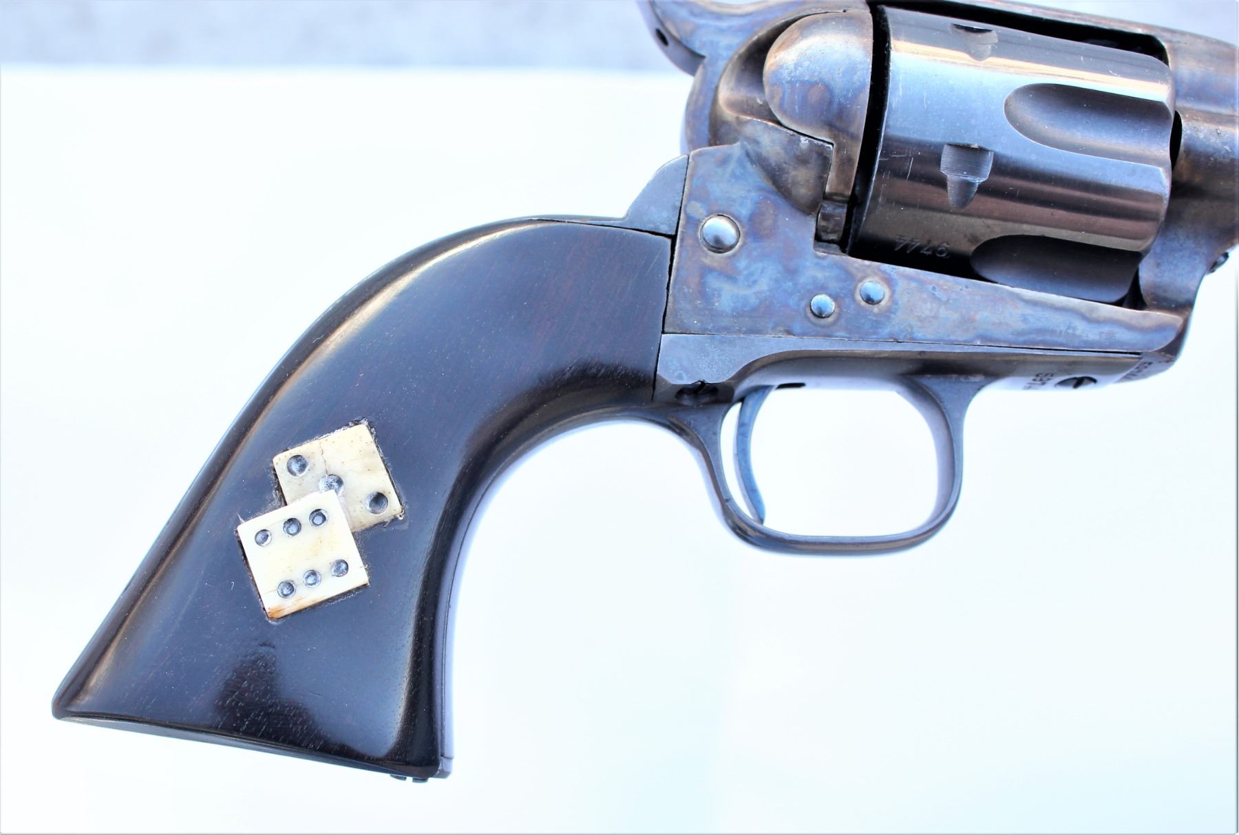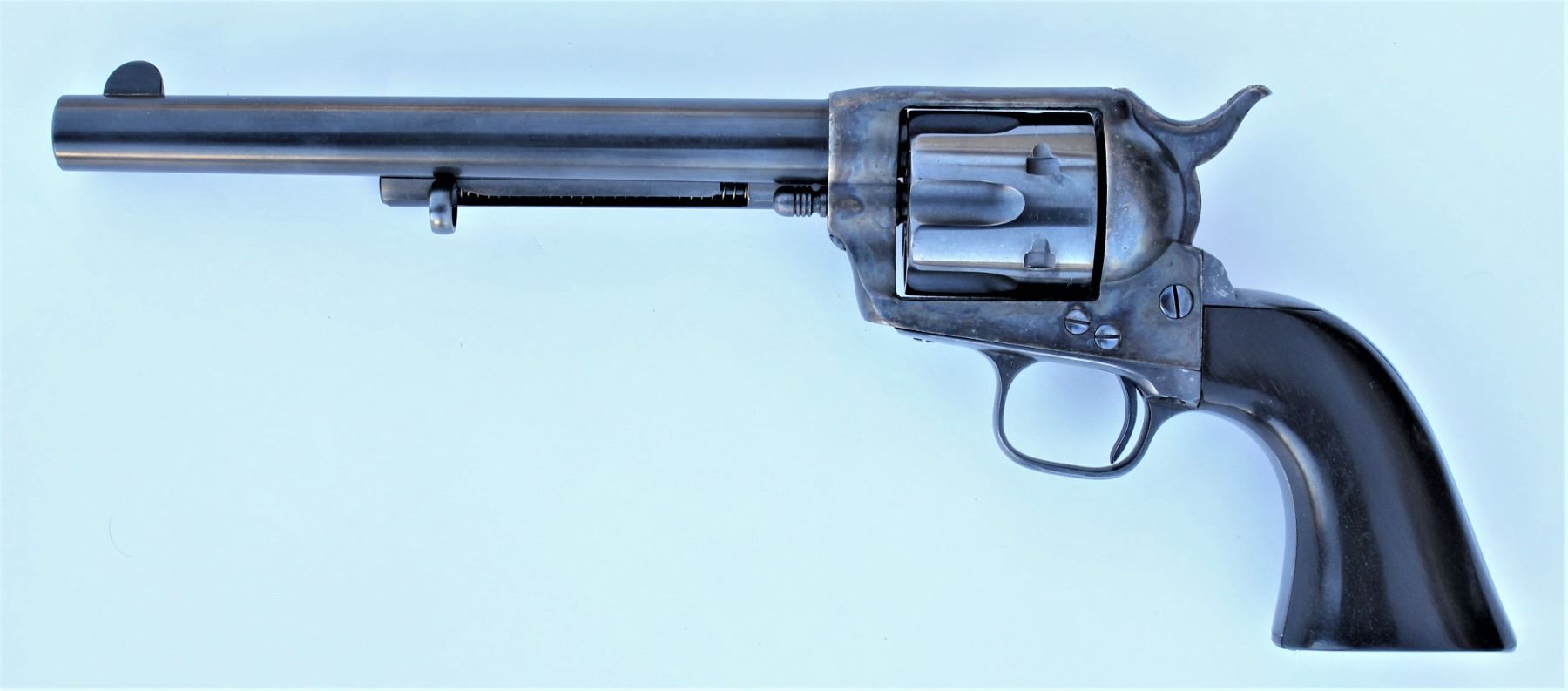 Antique black powder Colt single action, chambered in 44-40 with rare etched panel, having 7 1/2" barrel and showing nearing 99% condition of a beautifully done restoration, of impecable blue finish, case color and action. Ser. # 59xxx.