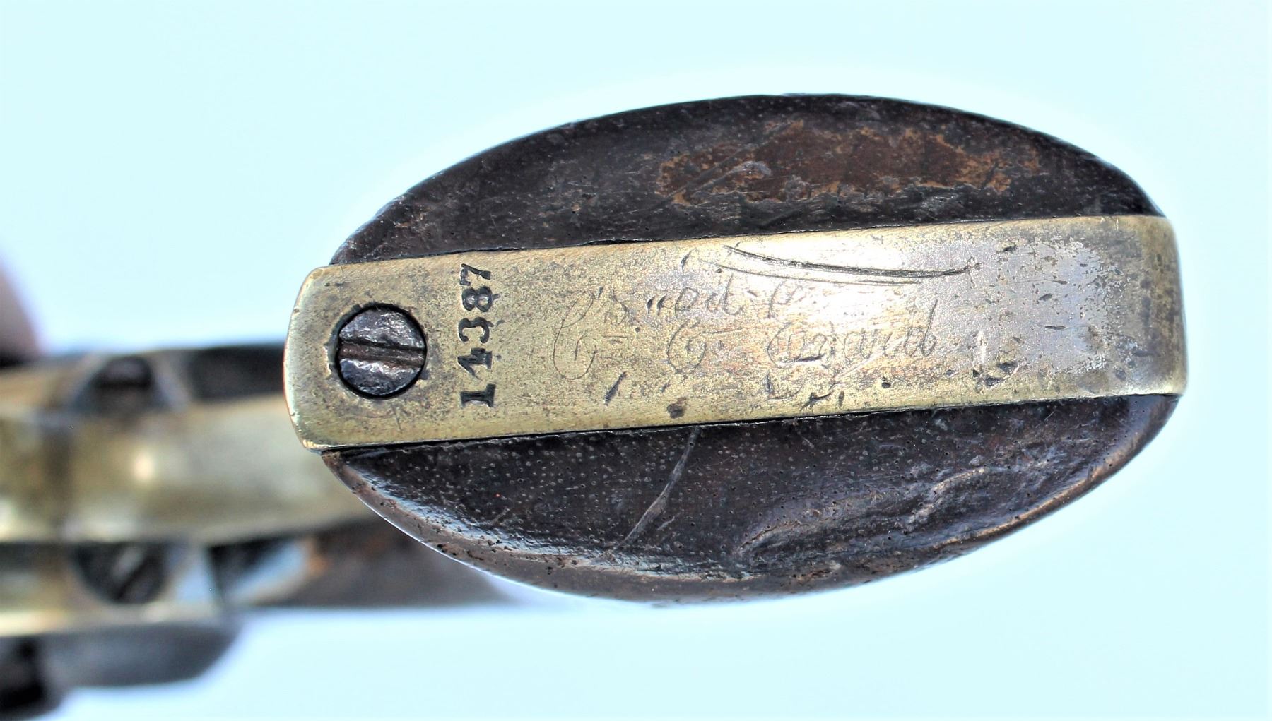 Interesting early Civil War period Colt 1851 Navy revolver presentation engraved to Sgt. Charles Evard on the bottom of the back strap, with small trigger guard, Ser.# 13xxx, overall patinaed finish and nice walnut grips. This revolver comes with extensive paperwork with much research of Evard's life and where he served and fought at many famous battles such as Bull Run, and shows quite a colorful time that he served throughout the Civil War. And is discussed in the enclosed book, No Sound Can Awake Them To Glory Again".