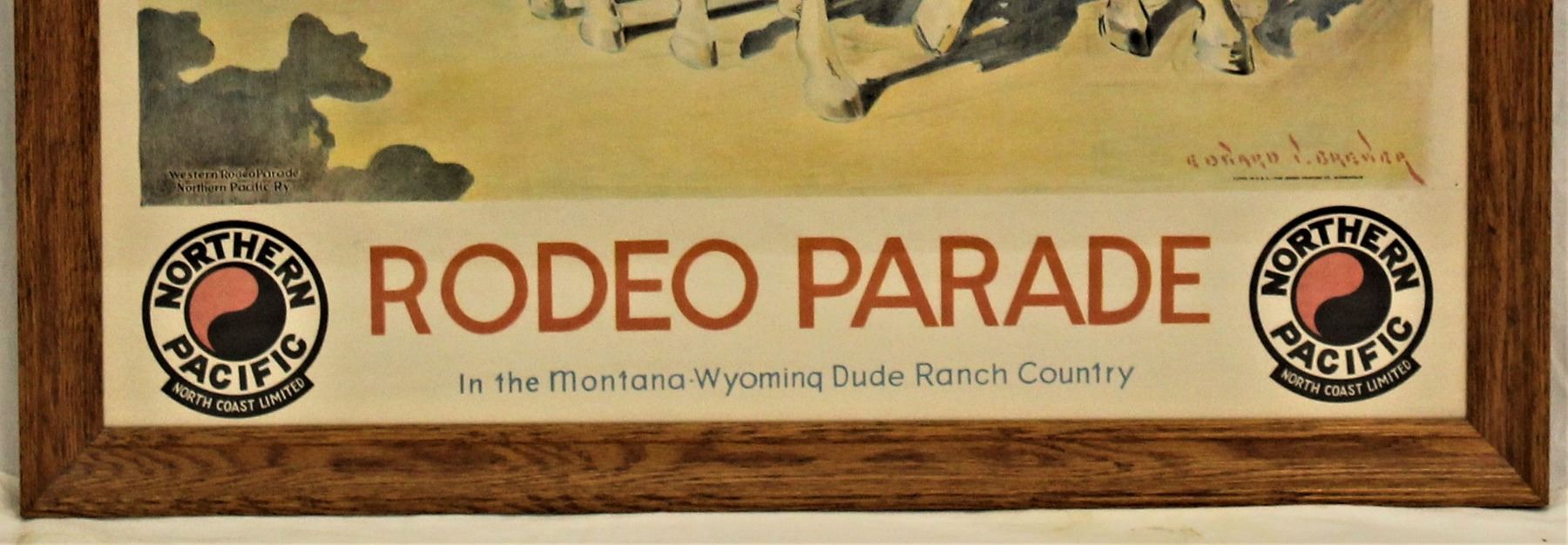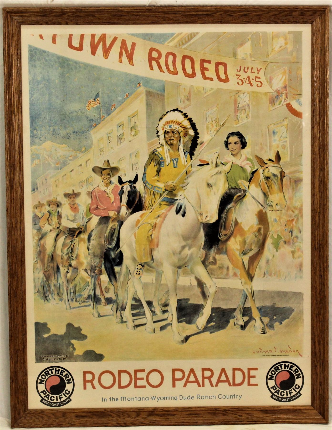 Colorful poster entitled "Rodeo Parade", depicting Indian chief leading a line of horseback cowboys in a 4th of July parade. Professionally mounted and framed, measuring 30" x 40".