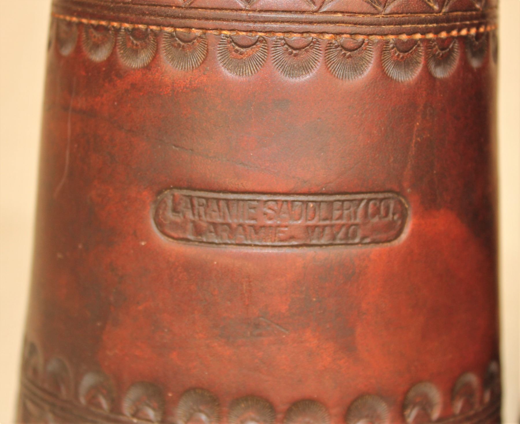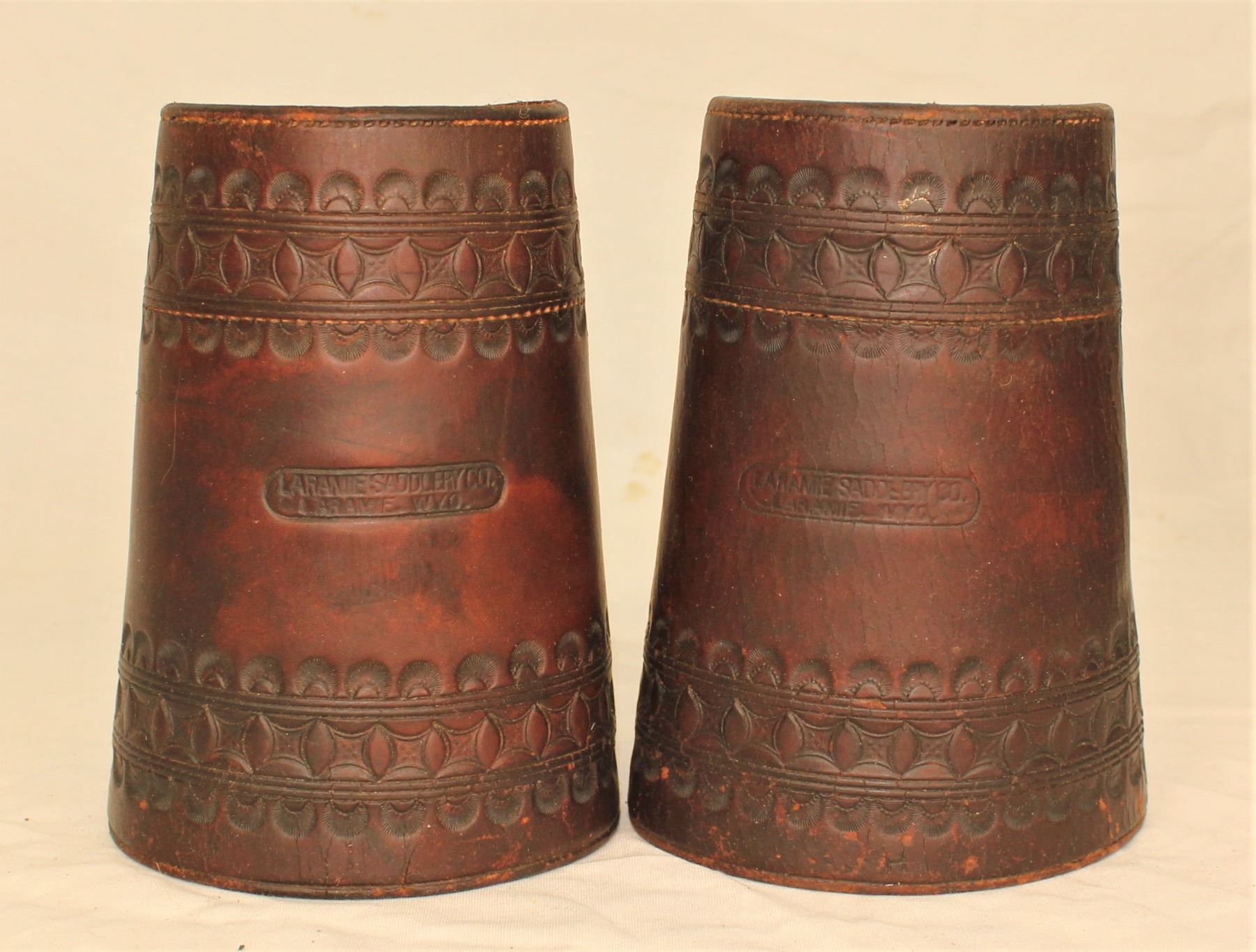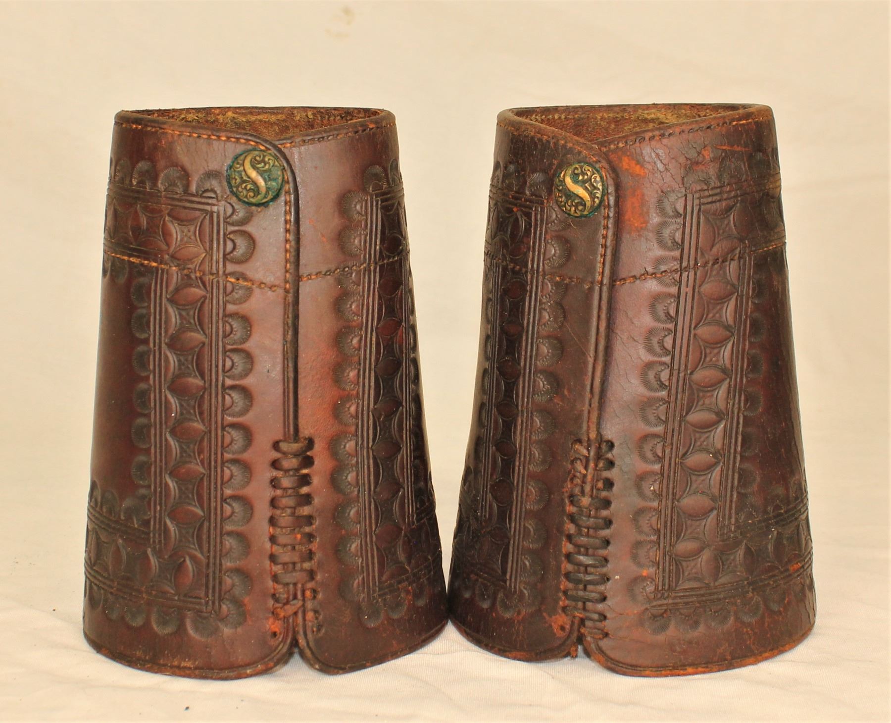 Deep chocolate colored cuffs with unique border tooled pattern, annd showing nice maker's marks. Roger Wilmot Collection