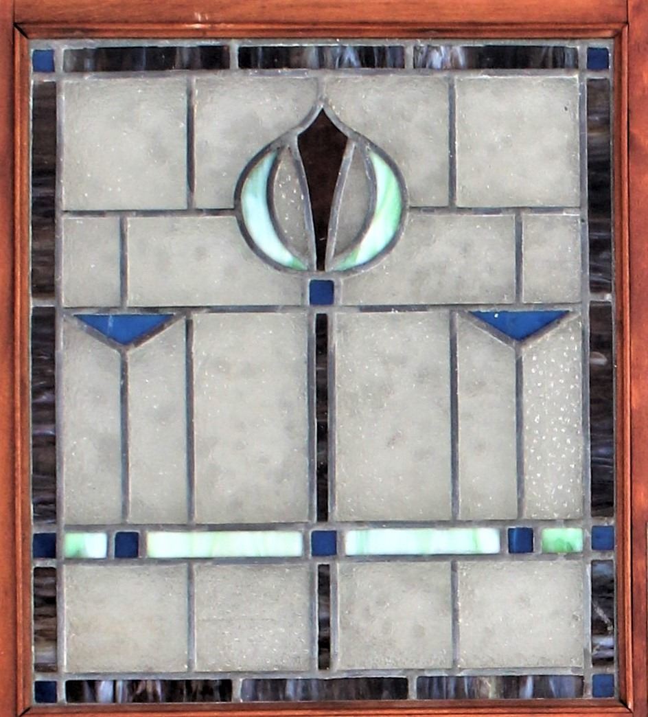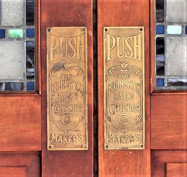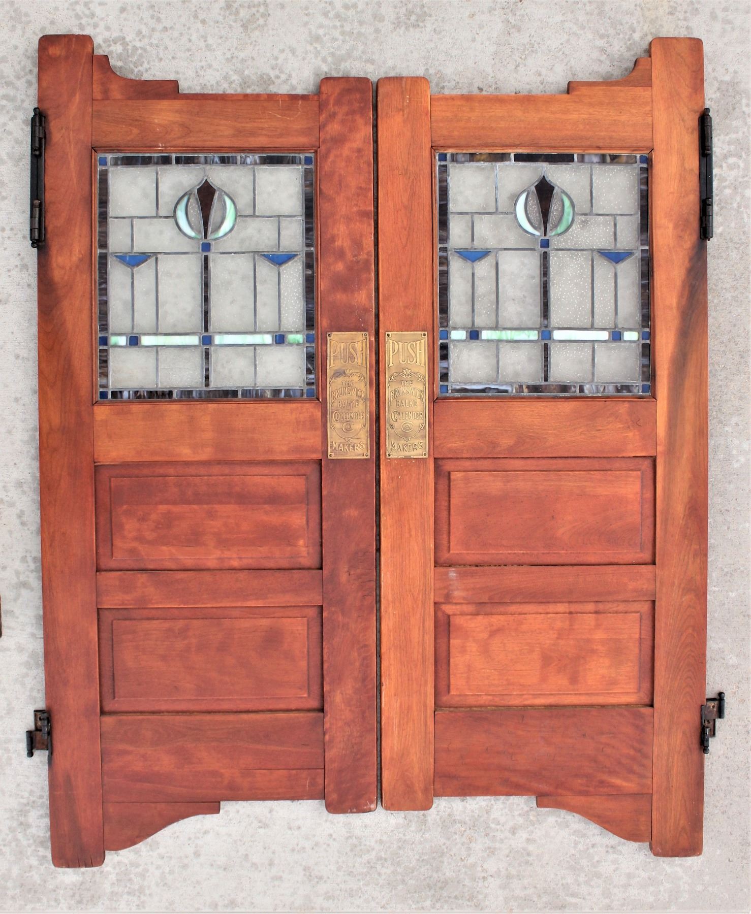 Stunning pair of solid wood doors with wonderful stained glass and incredible marked hand push plates on both sides, and completed with their original double swing hinges. Each door measuring 48 1/2" wide and 60" tall.