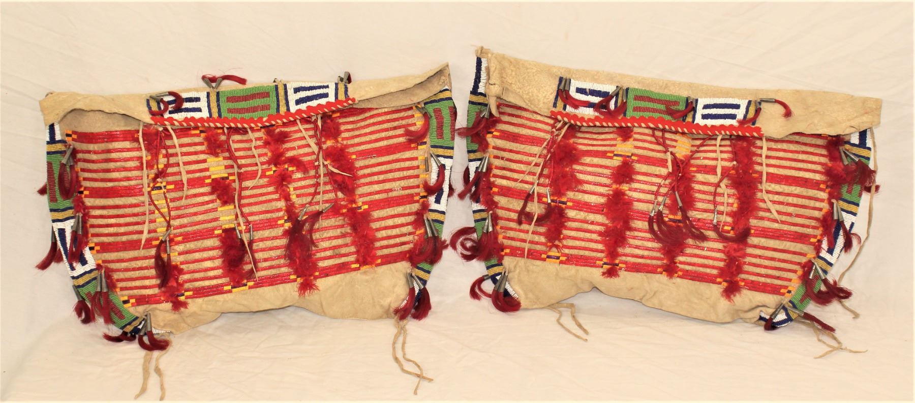 Magnificent pair of hide bags with beautiful early beadwork that includes greasy yellow, cobalt blue, and re white heart beads, along with extensive quill work and multiple decorative tinckle cones. A wonderful pair of bags in near mint condition.