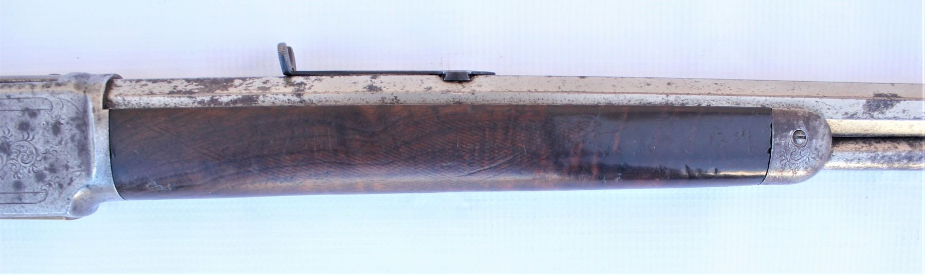 A phenominal piece of Wild West Show history, this Winchester 1873 deluxe rifle belonged to the well known sharp shooter that was a decorated US Cavalry soldier and then later toured with Buffalo Bills Wild West Show. W.H. Tucker's photograph is found at the lower left of the 1885 show poster where he is known as "Ogallala Tucker". As the rifle is presentation engraved "W.H. Tucker North Platte, Neb.", which is where Tucker lived, and Ogallala is a nearby town. The rifle comes with documents of Tucker's life and also information of how the rifle has been passed along, which includes a 1972 Winchester Museum build sheet that states its history back to 1934 and that it was currently in the collection of DW Roberts. It is notated with statistics on the build sheet just how rare this rifle is, being 1 of 700 engraved, 1 of 600 plated, and 1 of 260 with a name. It is also an oddity in the way that this rifle may be one of the very first 32 calibers, as serial #138,000 is barely inside the 3rd model range and there were only 44-40 calibers available in second model, making it even more special. W.H. Tucker is extensively talked about in the well known book "Buffalo Bill: His Family, Friends, Fame, Failures, and Fortunes", by Nellie Yost, where she notes that he was the owner of the most prominant saloon in town, and other great details, as Buffalo Bill also had a magnificent ranch in North Platte. Also accompanied by a 2003 Winchester letter where it is documented in the Cody Museum records as being ordered with a $2.50 factory engraved reciever with engraved name on sideplate, nickel finish and gilt (gold) trim, chambered in 32 caliber, octagon barrel, set trigger and checkered fancy stock with pistol grip. The rifle shows wonderful honest condition with much of its original nickel and beautiful engraving.