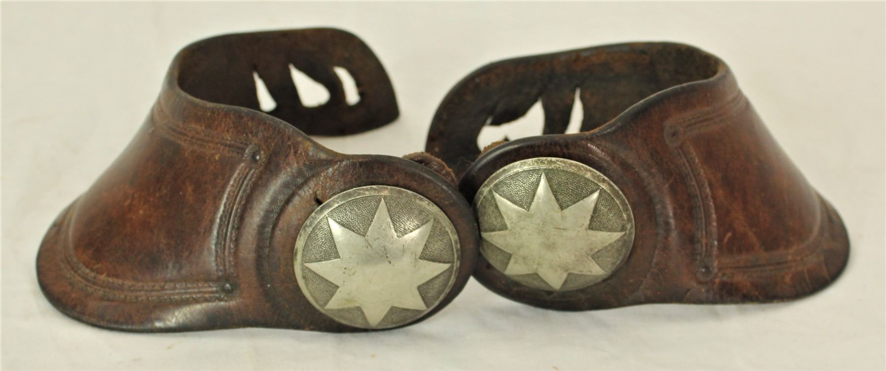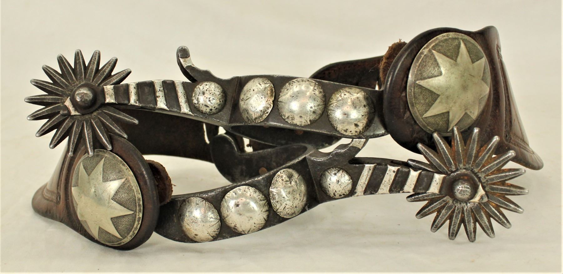 Outstanding double mounted Wyoming cowboy spurs with attractive classic star motif engraved large domes, elongated striped shanks, great looking Phillips and Gutierrez style chap gaurds, and wonderful dovewing straps with matching star motif conchos.