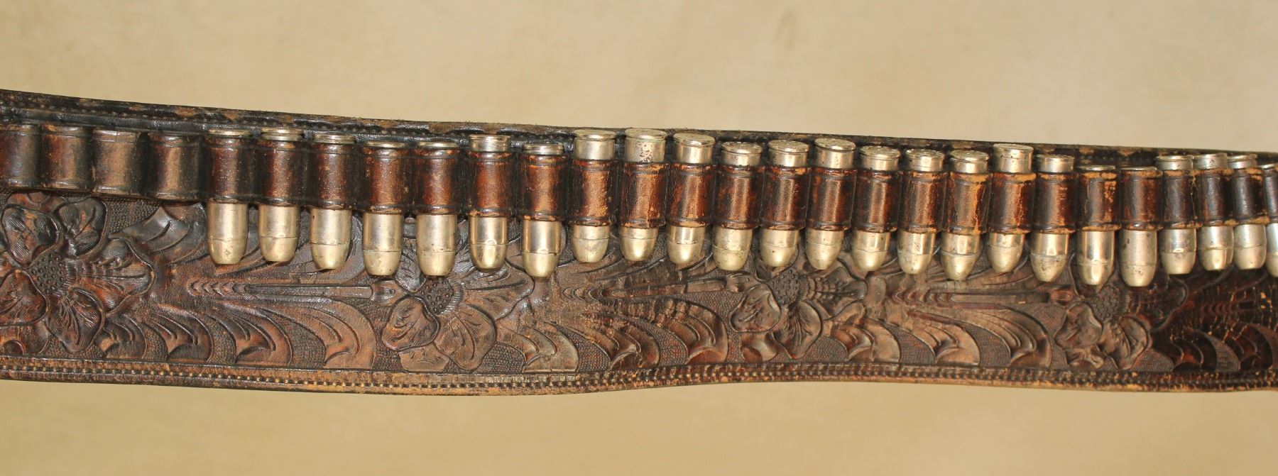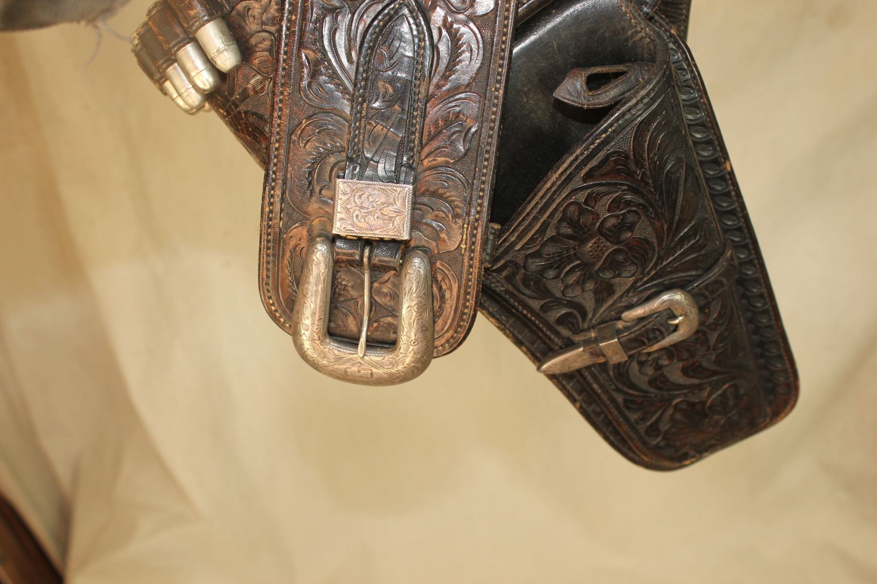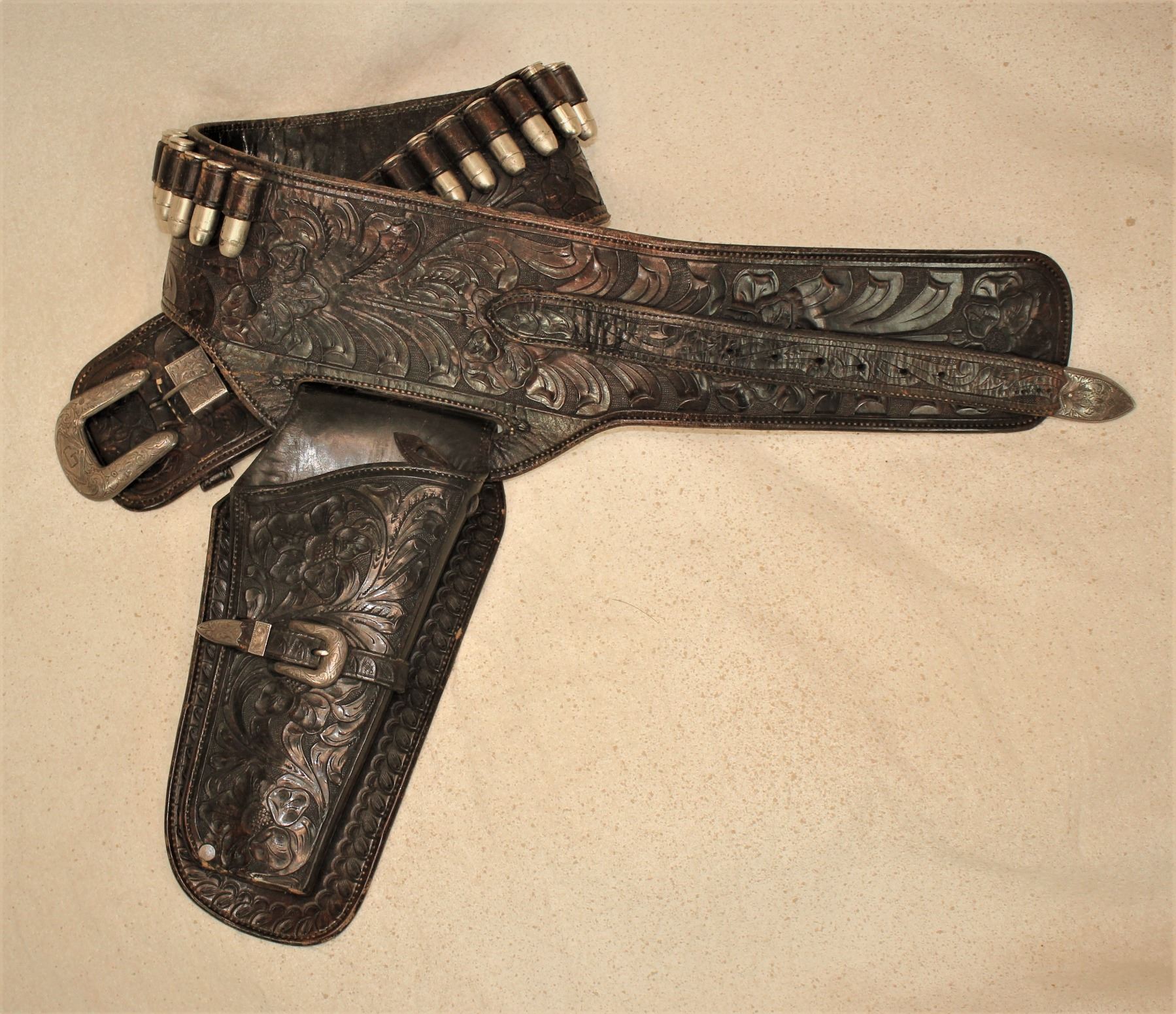 Beuatifully flower tooled gunrig with wide belt having line of bullet loops filled with silver bullets, and stlyishly engraved maker marked silver silver buckle sets. Showing rich color and condition.