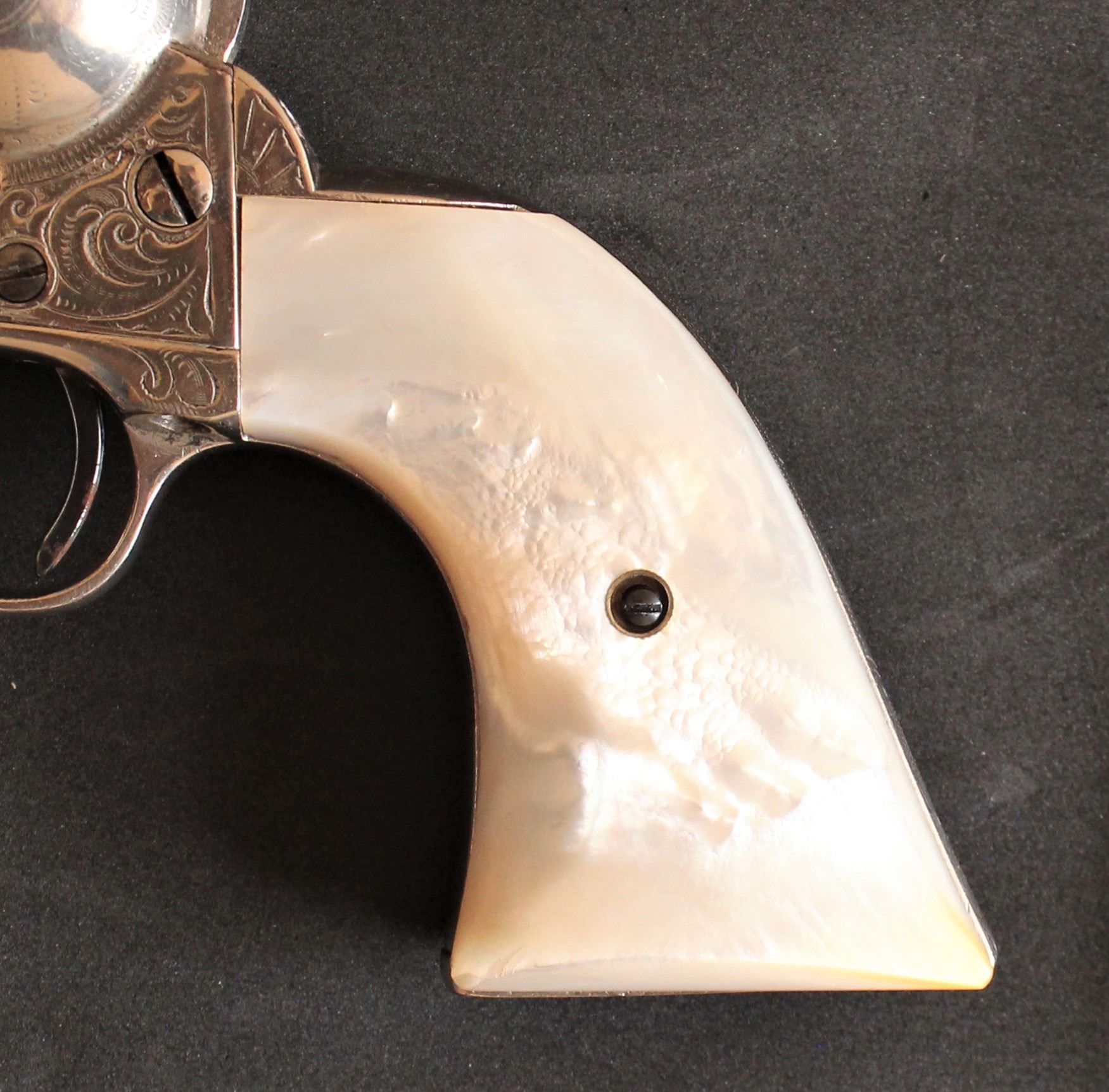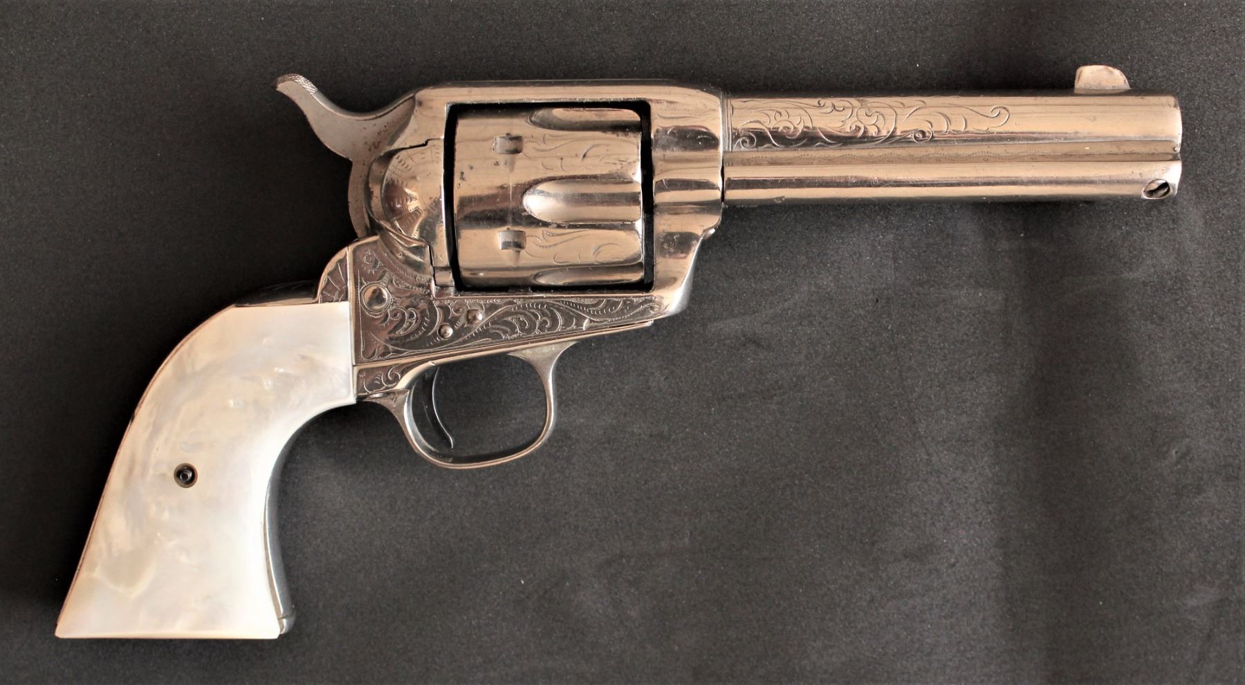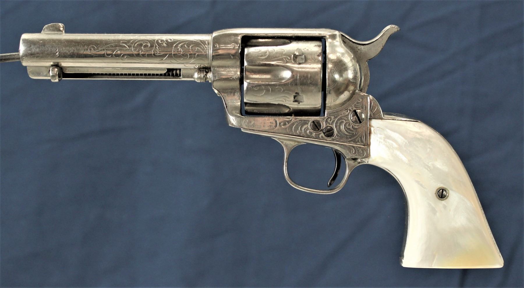 Black powder antique, serial #108XXX, single action Colt revolver with what appears to be New York engraved, chambered in 45 caliber, with a 4 3/4" barrel, terrific mother of pearl grips and over 90% of old reapplied nickel finish, with a nice action. With a great look and feel.