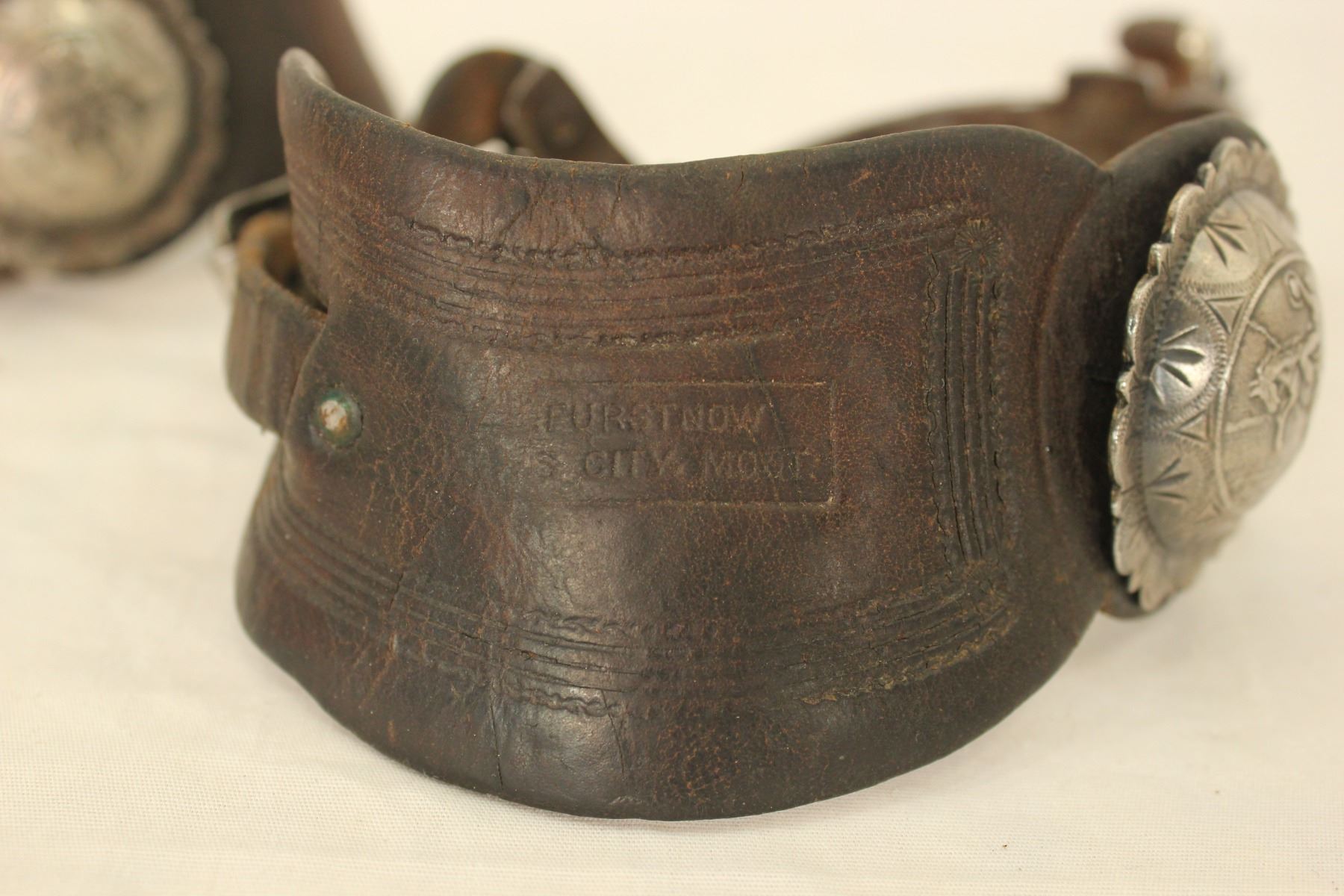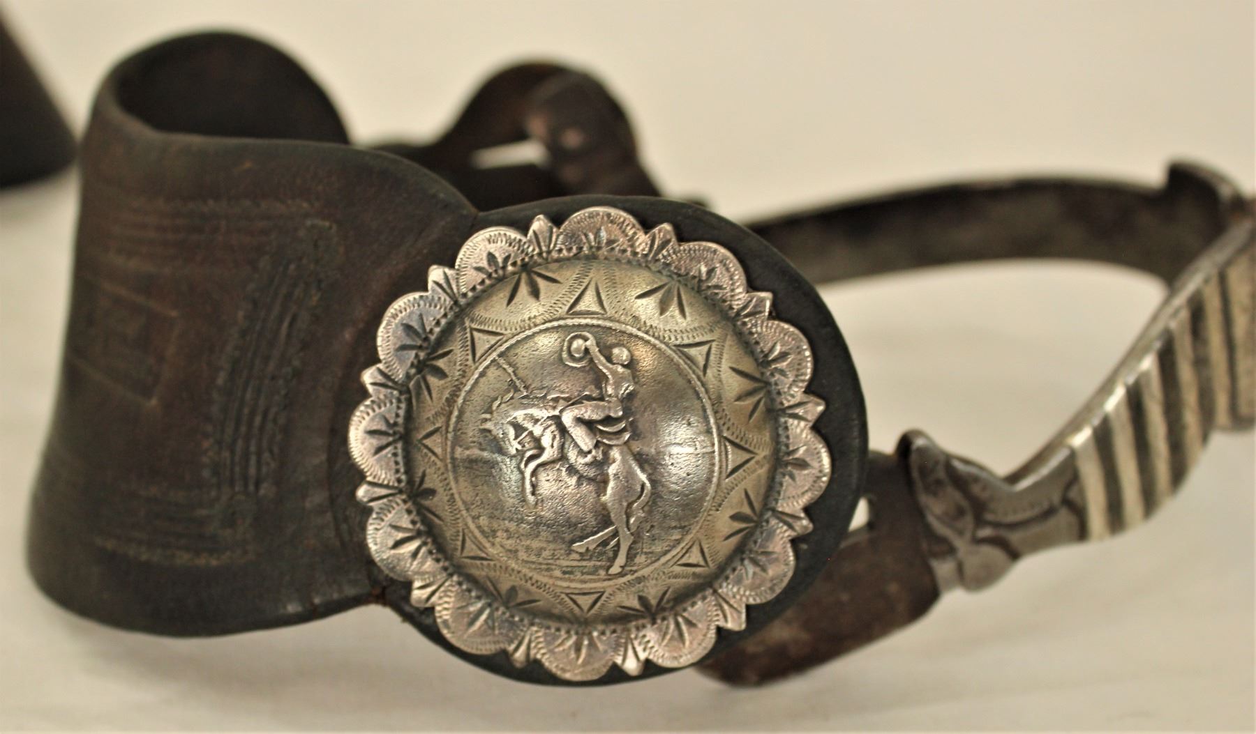 Incredible large Hernandez style figural lady leg spurs, with detailed iron design, single inlaid with finely engraved silver, early style drop shanks with chapgaurds with the 3 X's mark on top edge, all set off by extemely scarce Al Furstnow straps with Visalia marked scalloped bucking horse conchos.