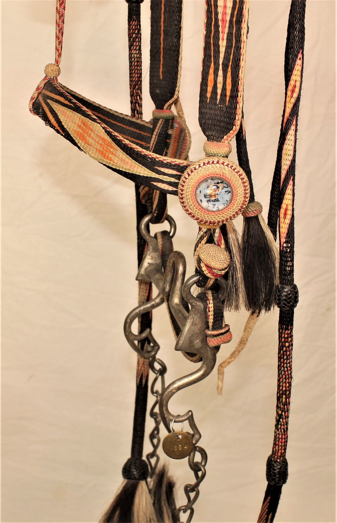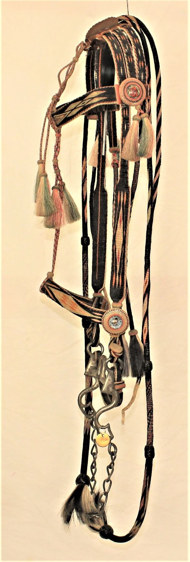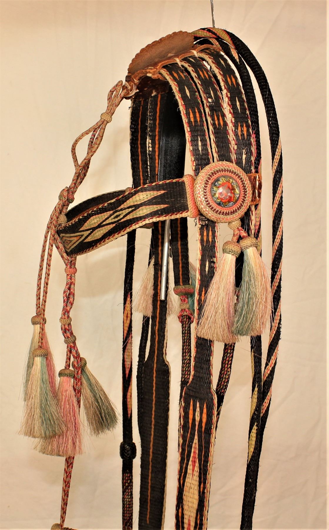 Striking seven color horsehair bridle with black background, twelve tassels, attractive geometric designs, and wonderful hitched rosettes.