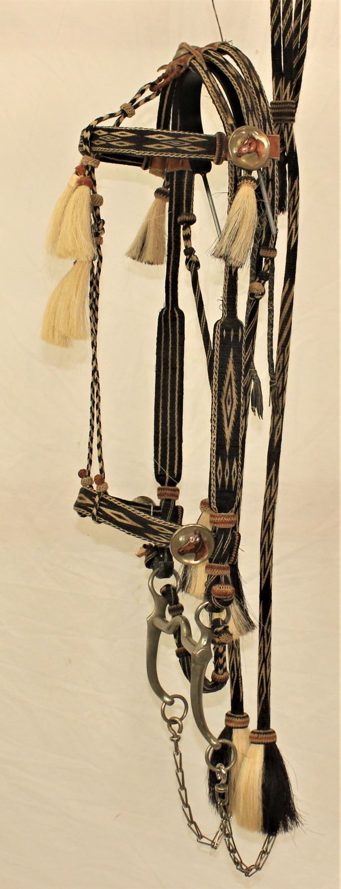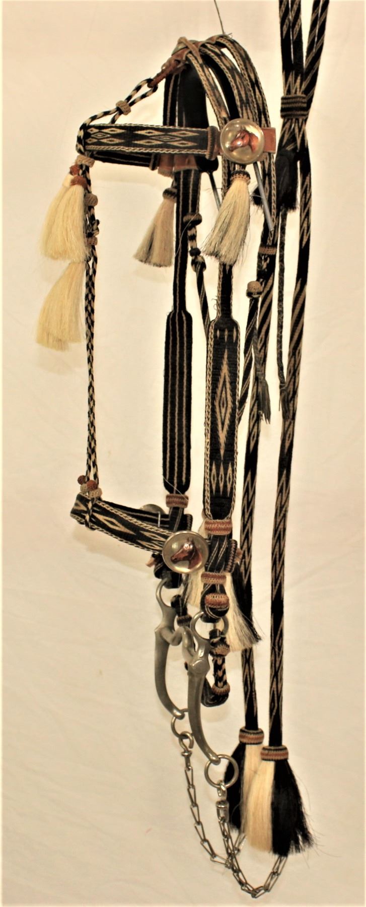 Attractive black and white hitched horsehair bridle with bold geometric design, glass horsehead conchos and hitched horsehair reins. Roger Wilmot Collection