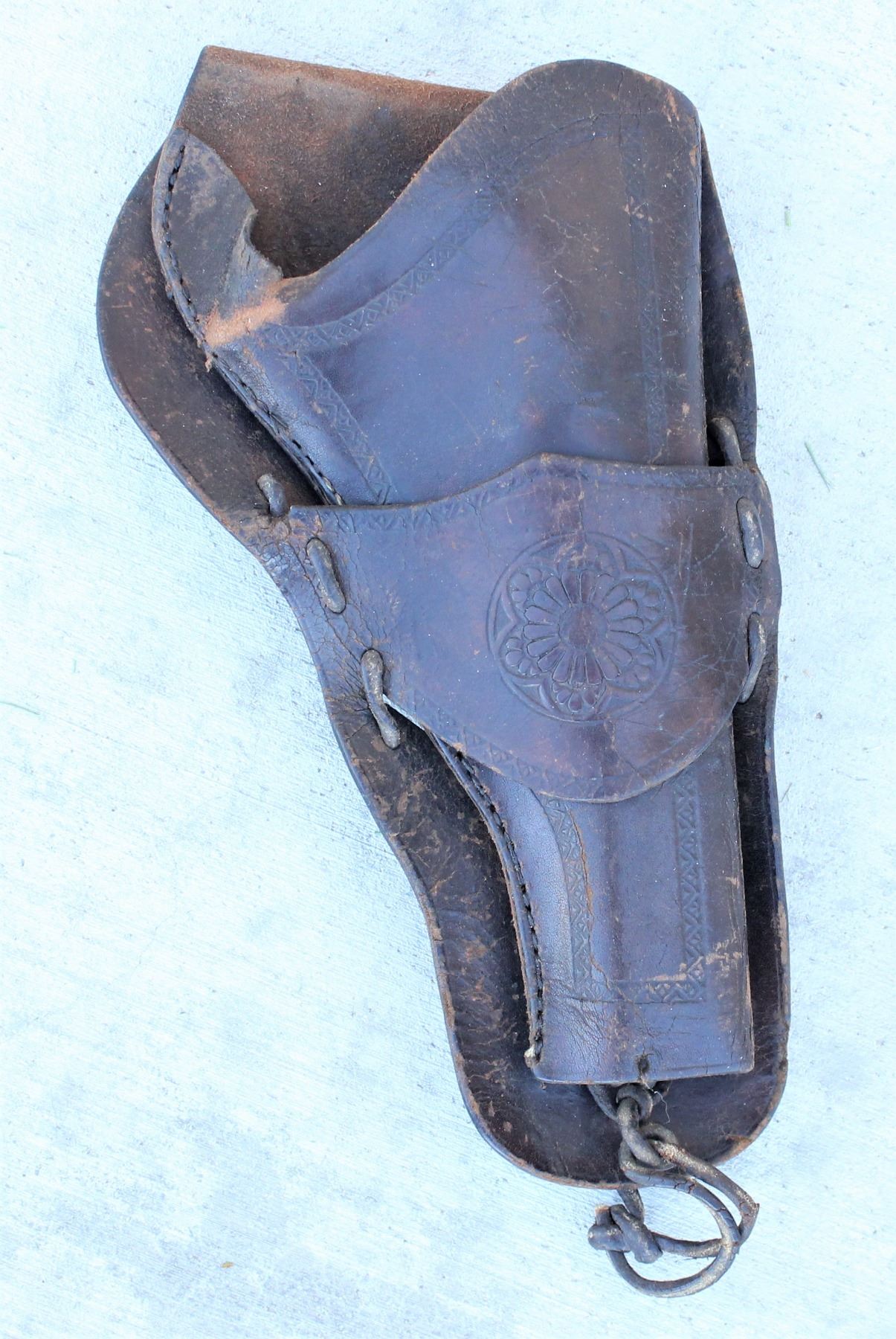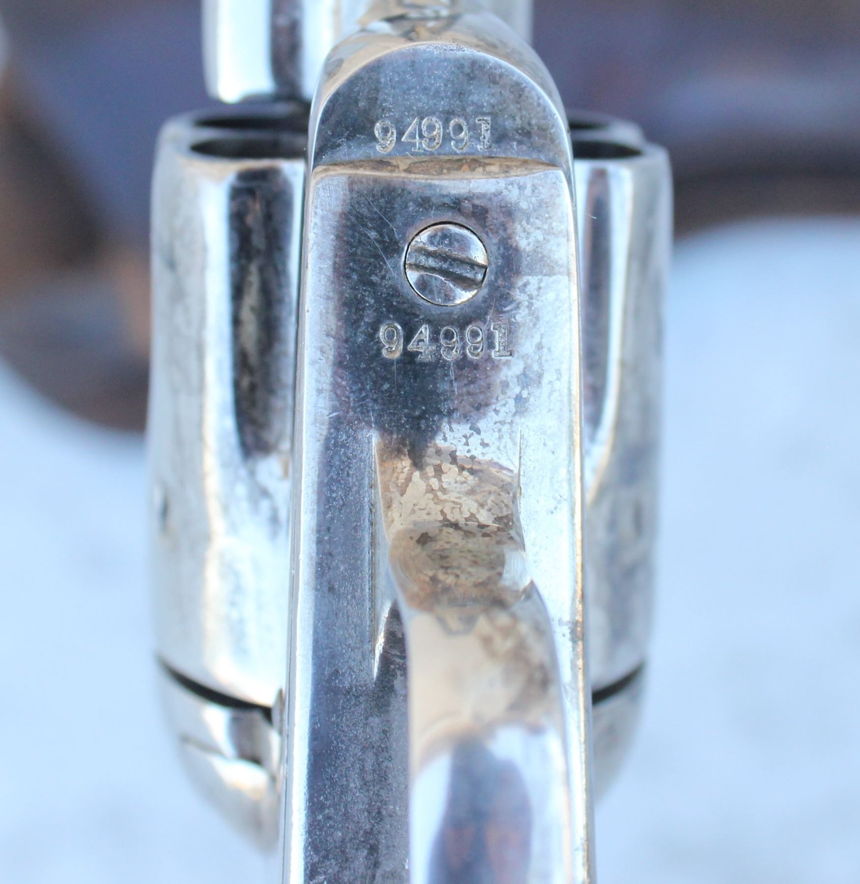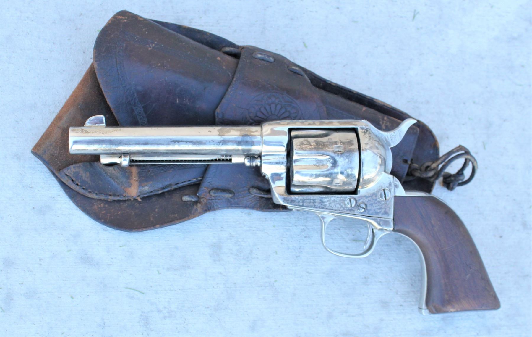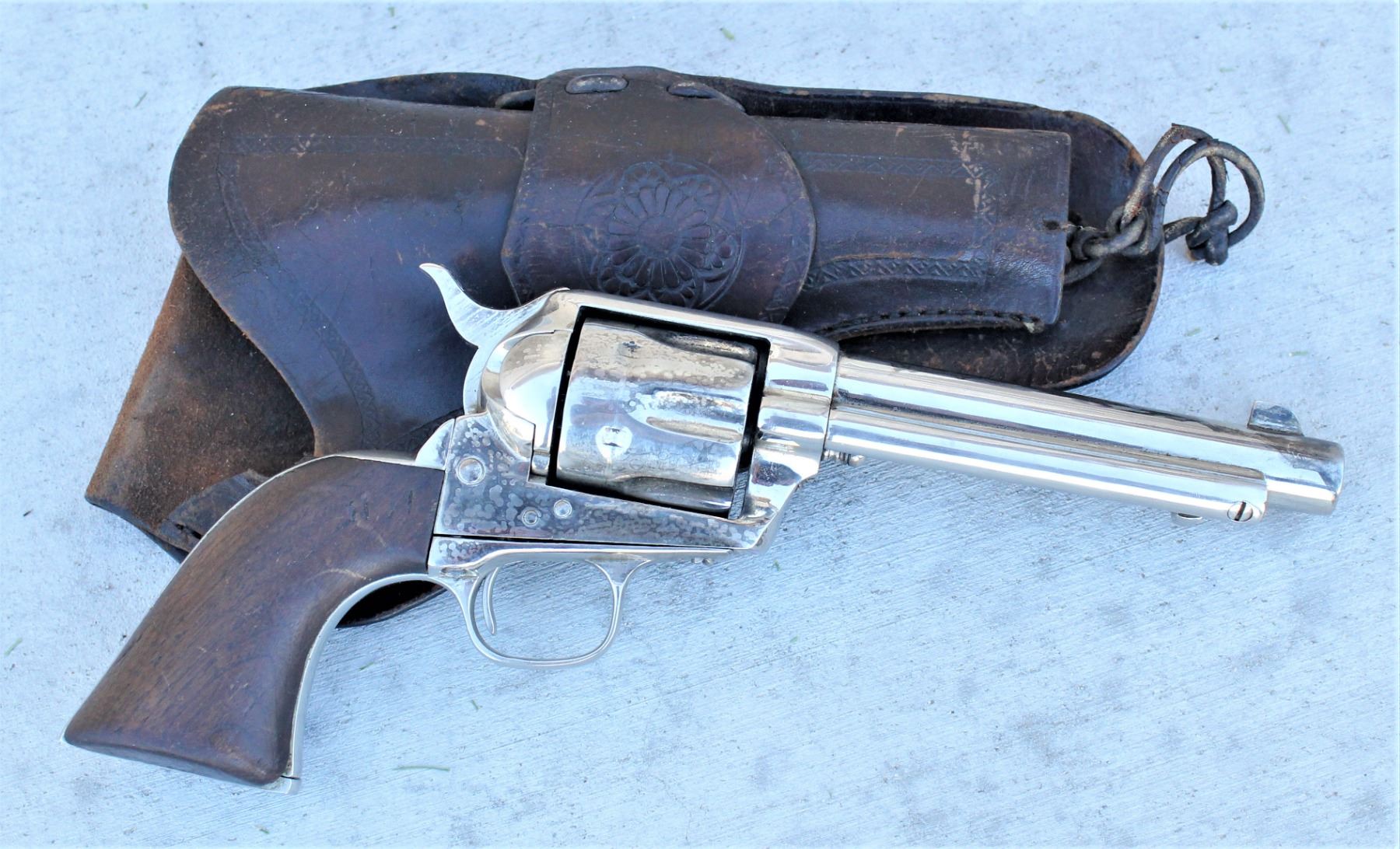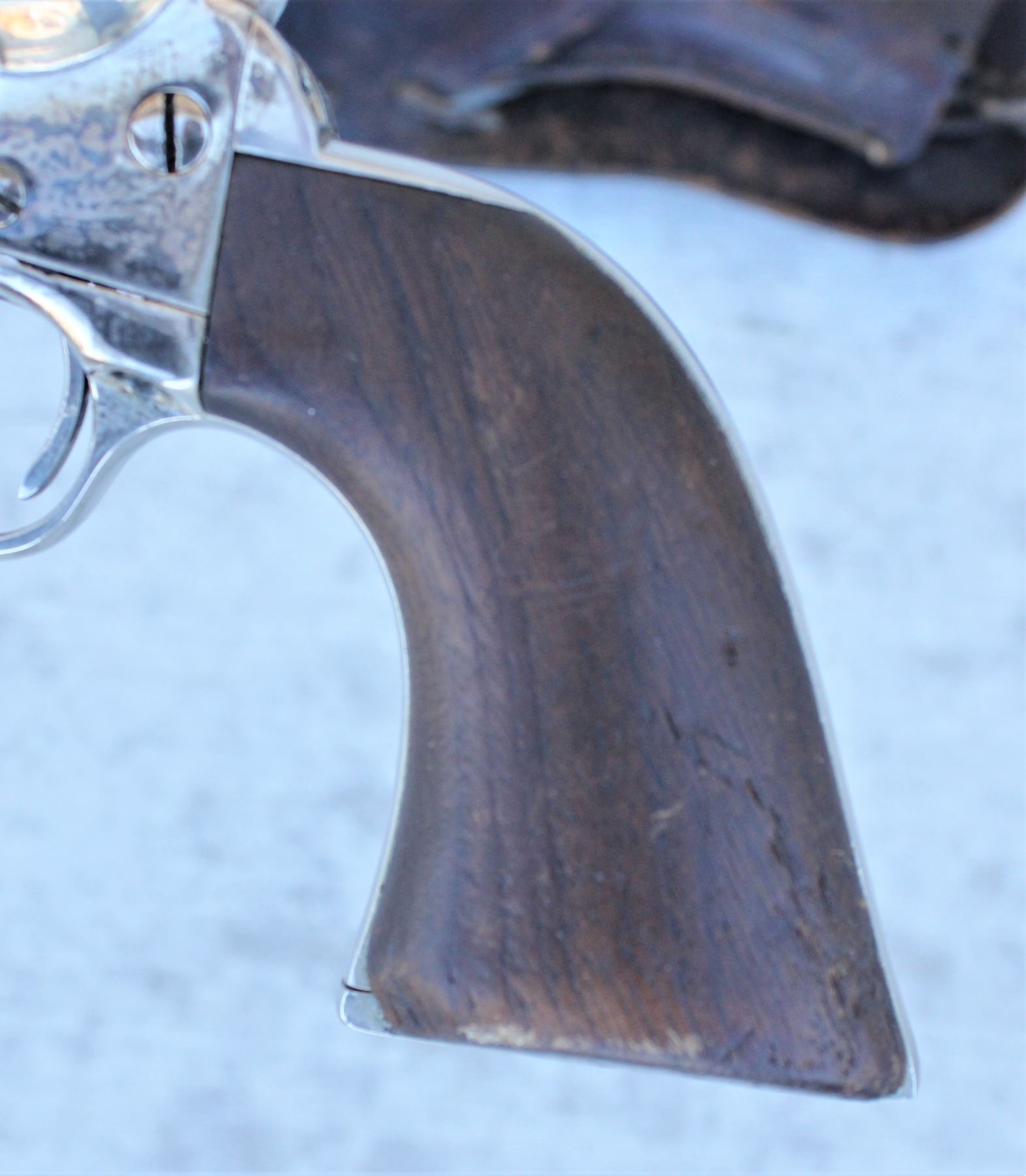 Interesting antique Colt revolver, serial #94,xxx, chambered in 45 caliber, with a 5 1/2" barrel, later applied nickel finish with aging and attractive one piece walnut grips. Having good mechanical action and good eye appeal. Accompanied by a nice single loop holster.
