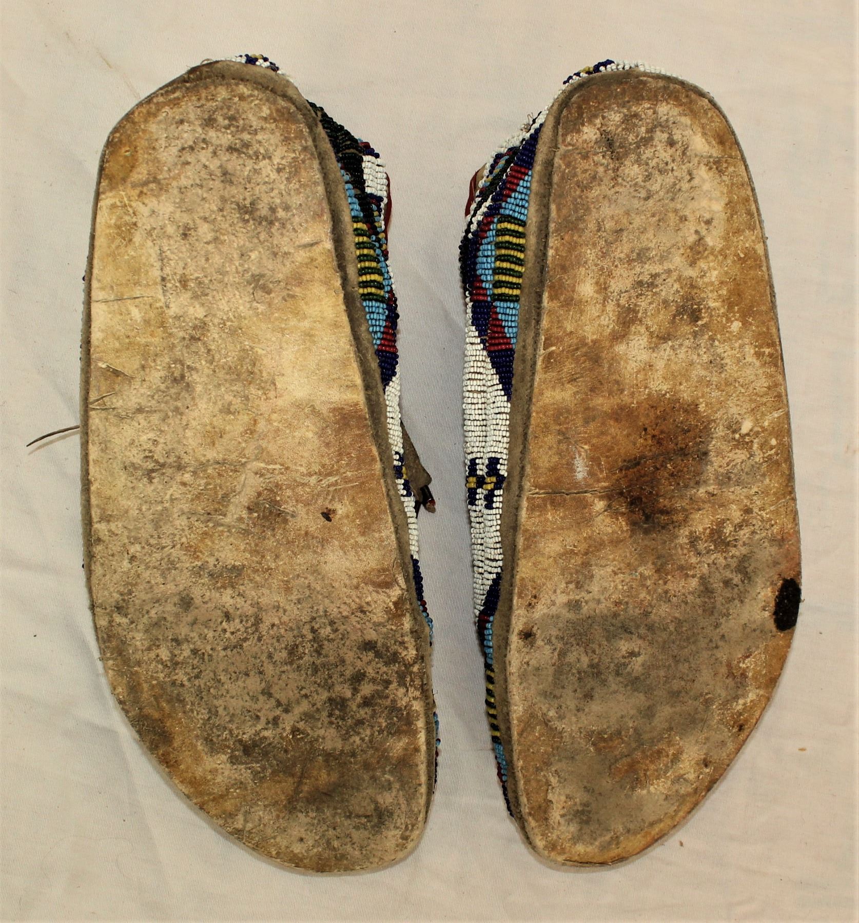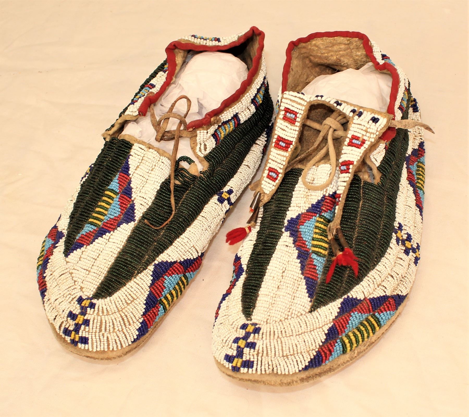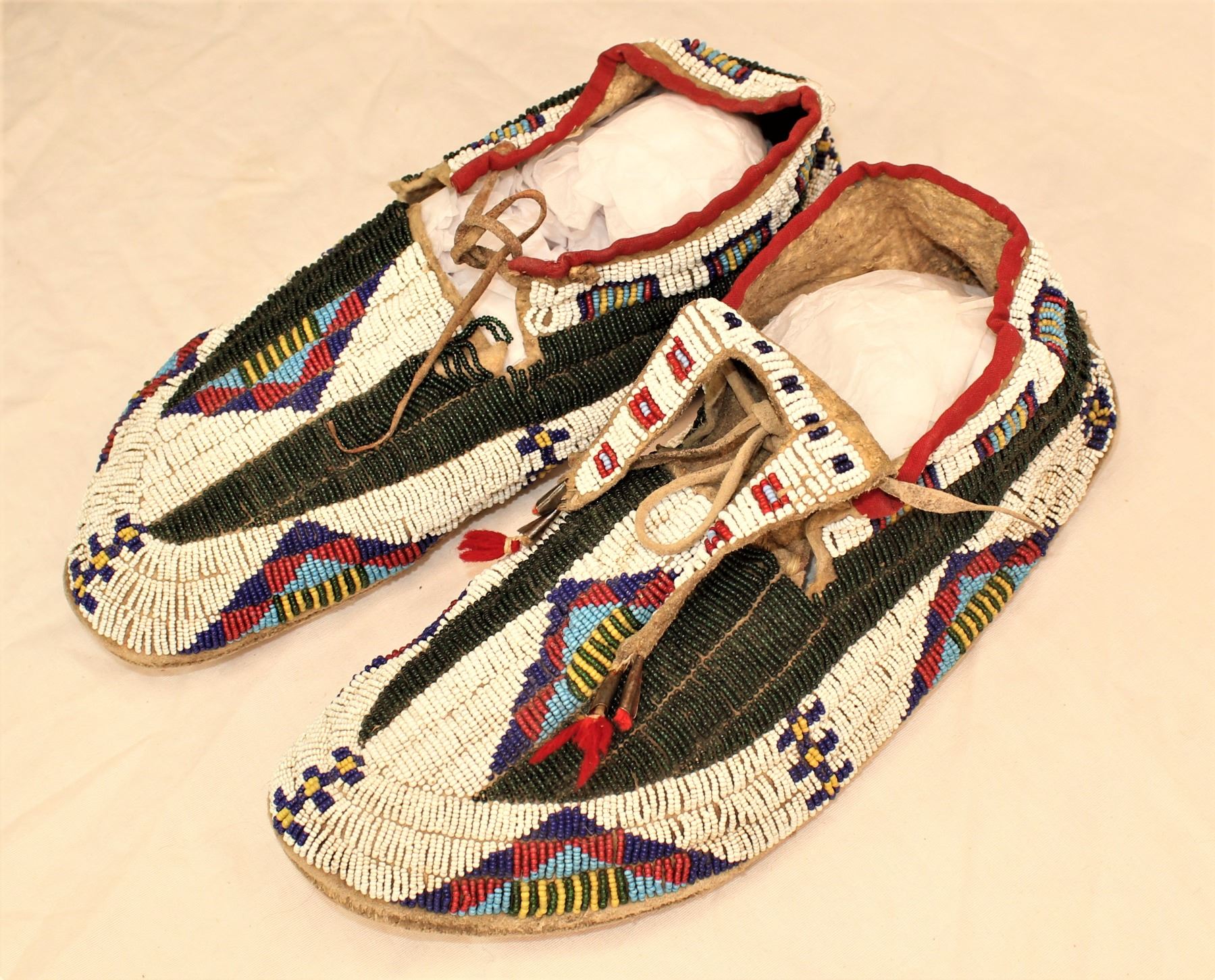 Uncommon mens size moccasins with unique fully beaded pattern using early beads that incorperate translucent greens.