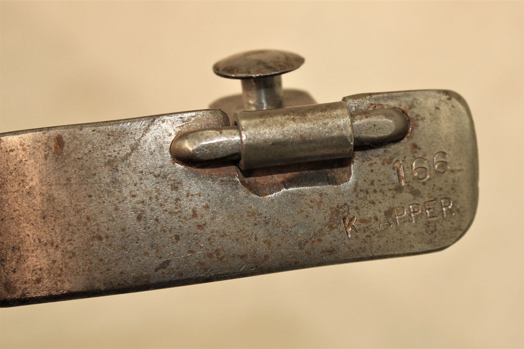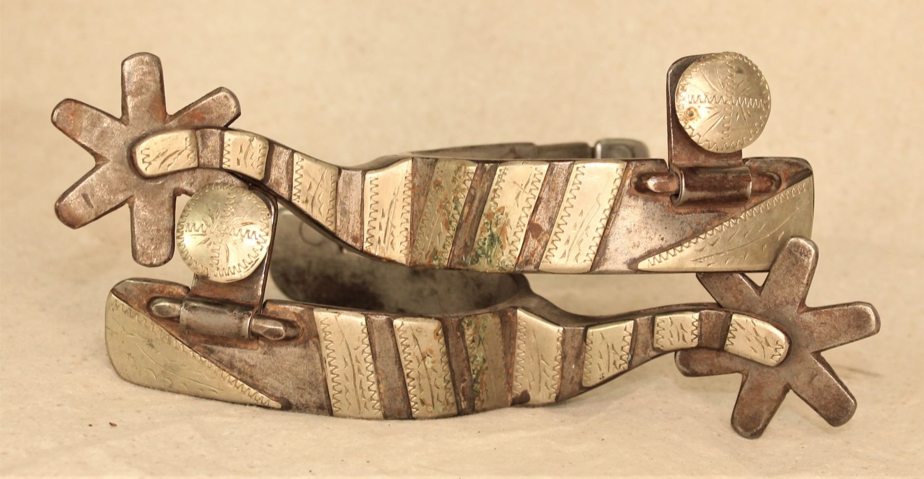 Highly desired single mounted Texas style spurs with elongated gooseneck shanks, swinging buttons, and large six-point rowels.