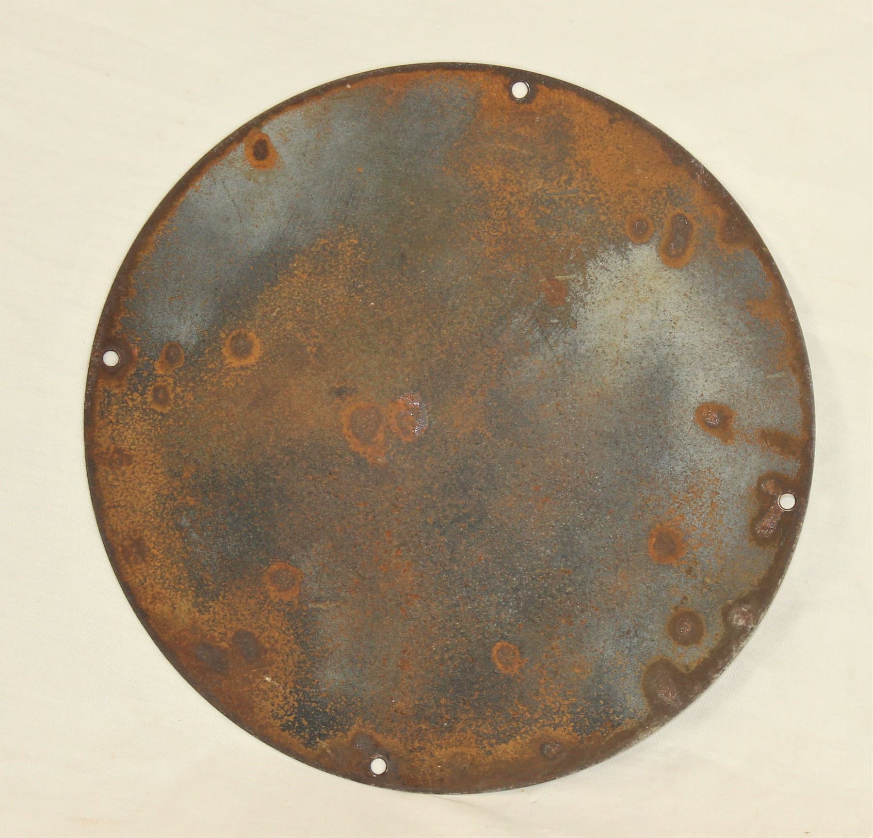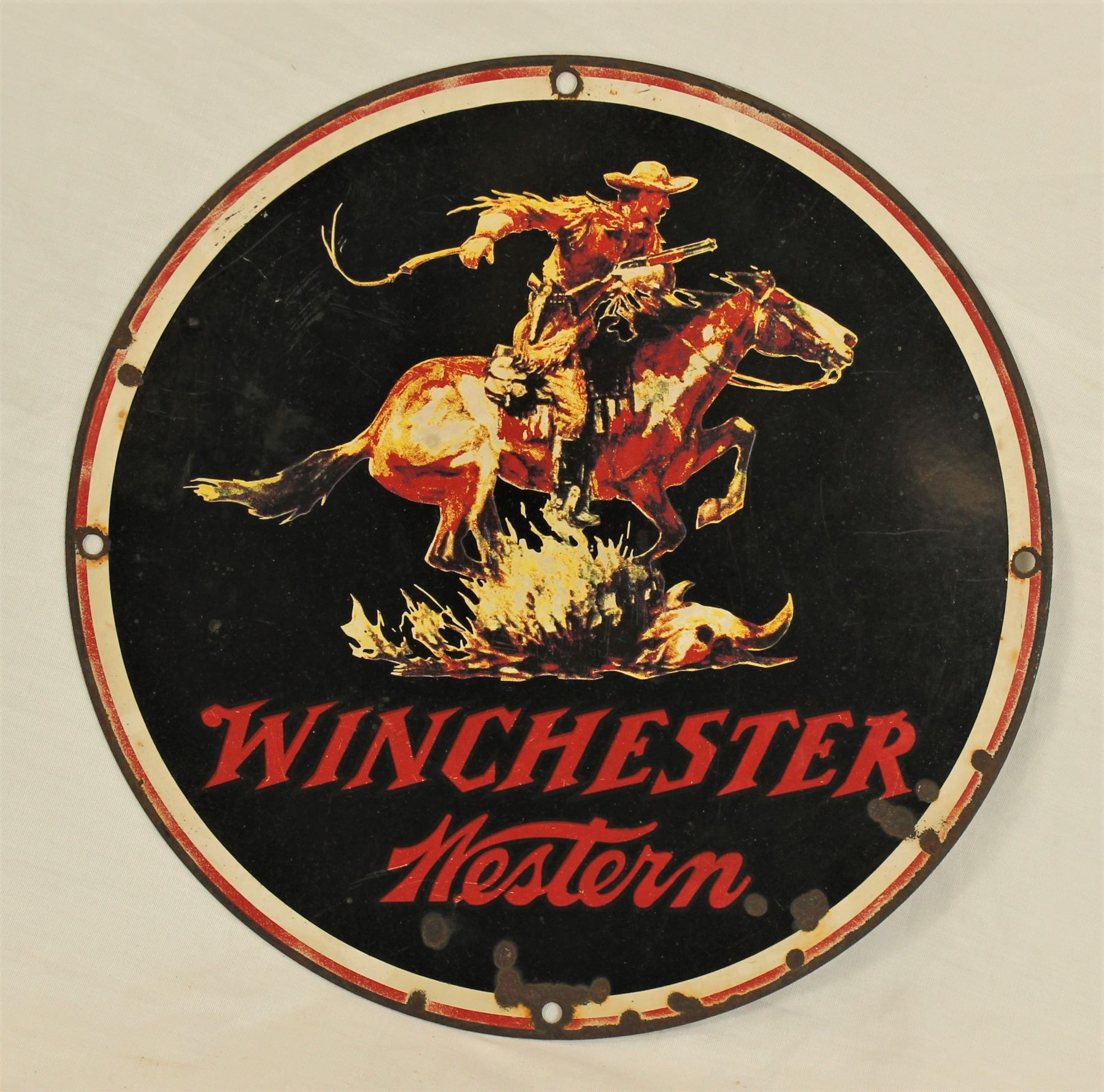 Desirable metal and enamel sign with classic horseback express rider scene, measuring 11 1/4" in diameter.