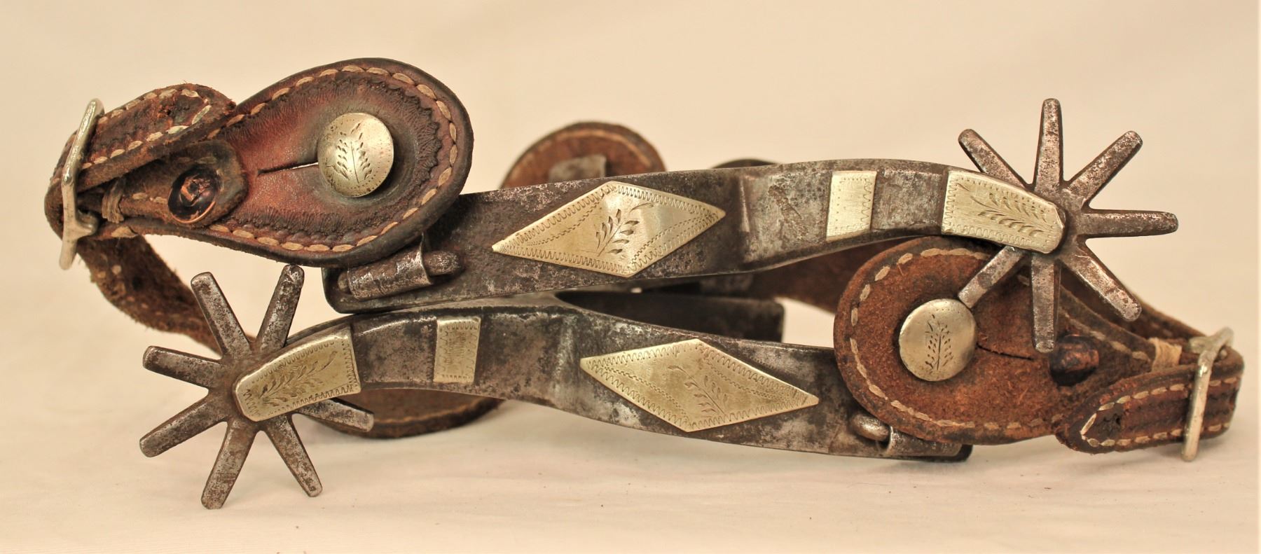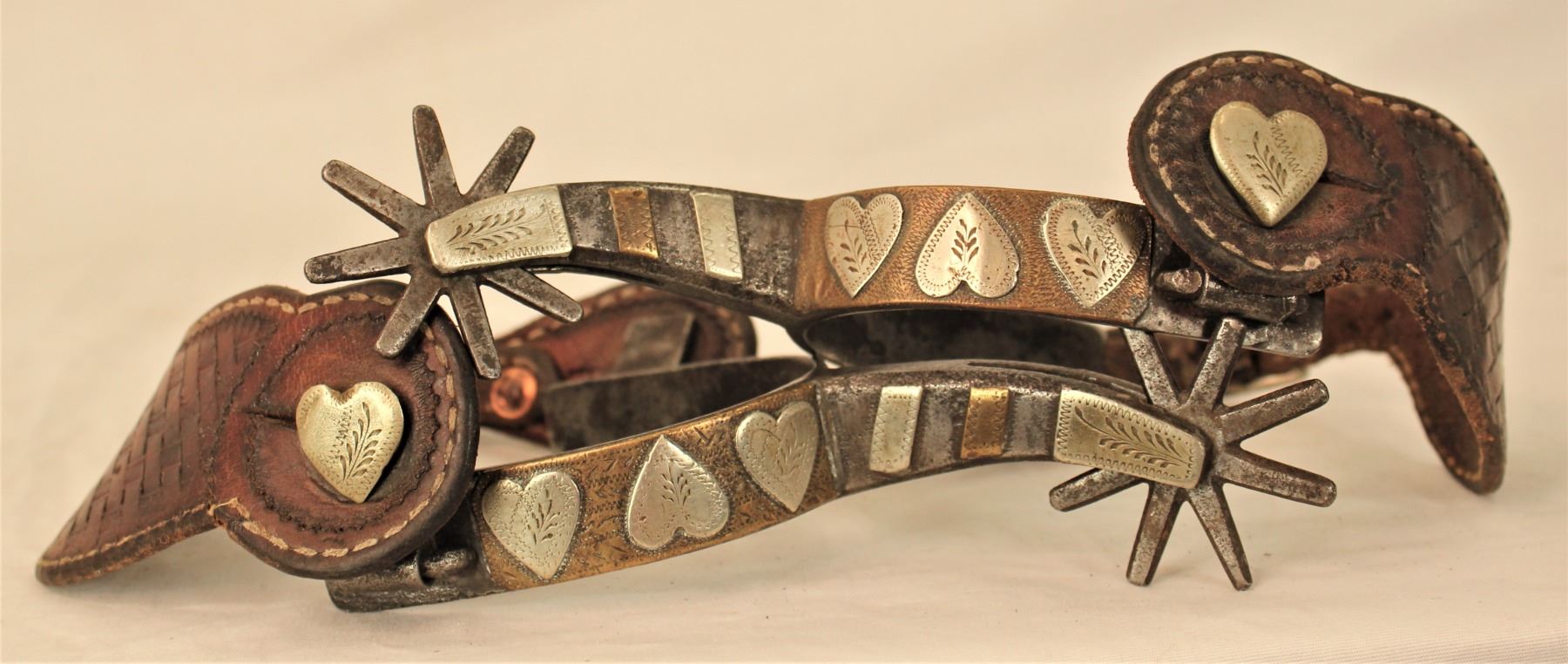 Extremely rare double mounted four heart pattern spurs with large eight point rowels, heart swinging buttons, and fantastic engraving.