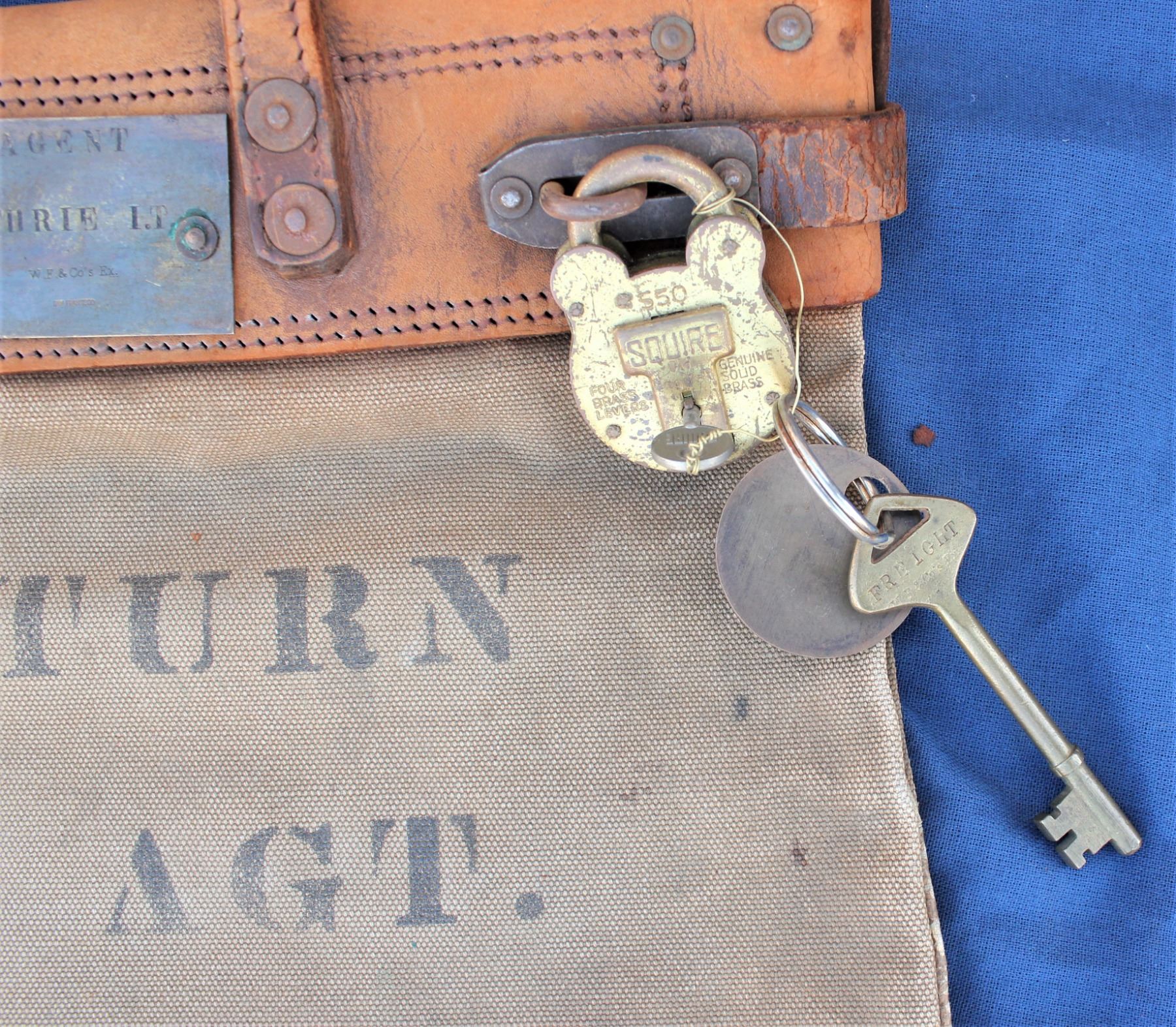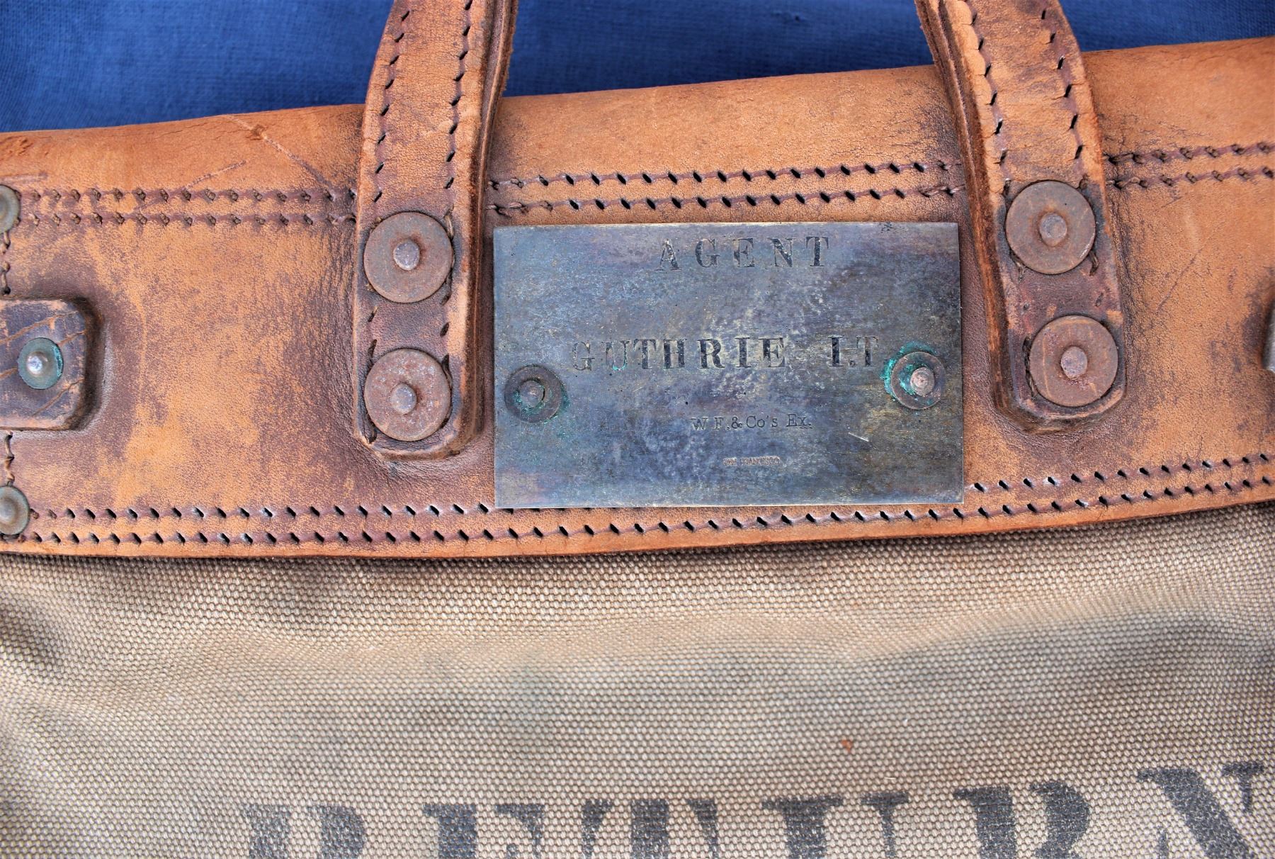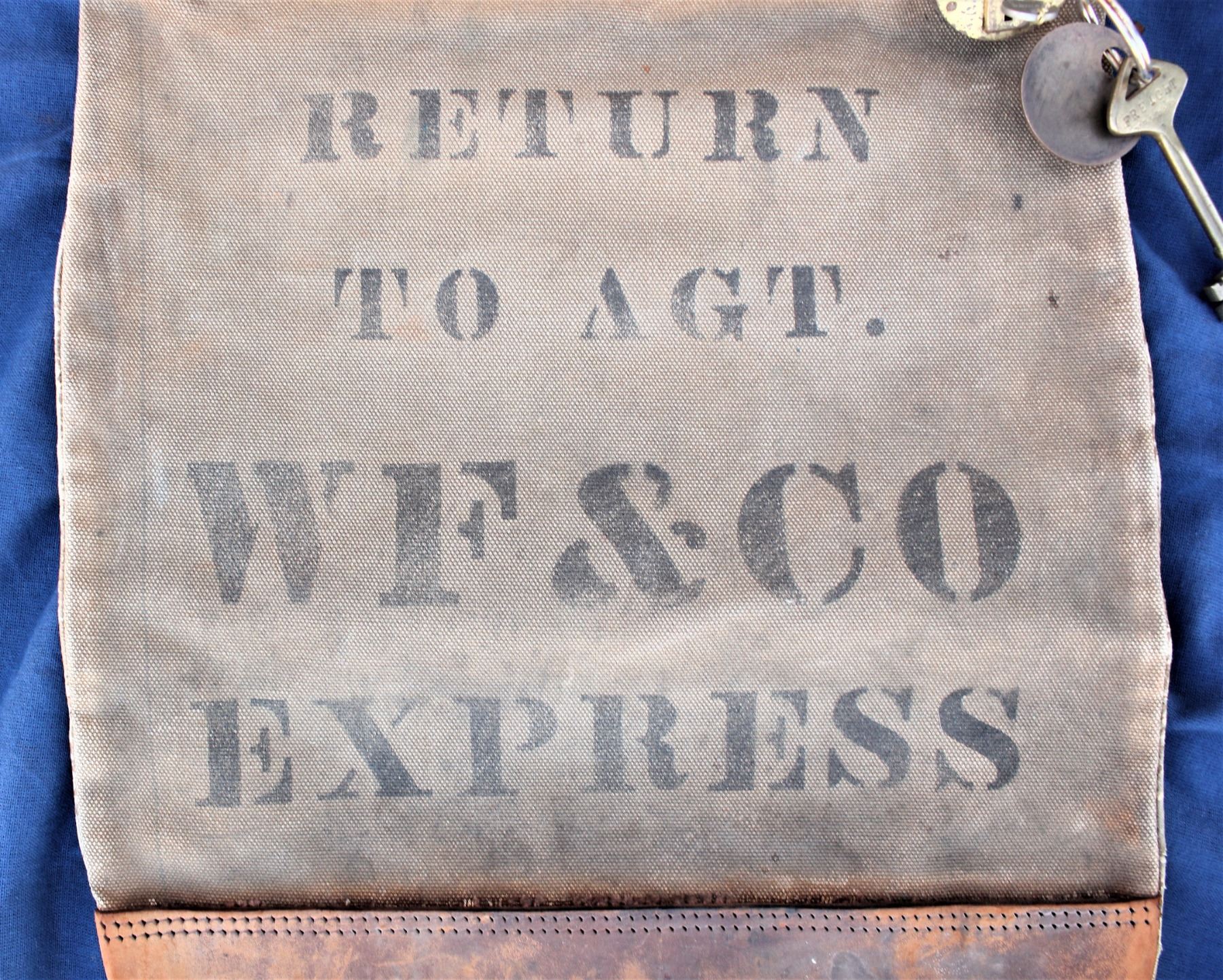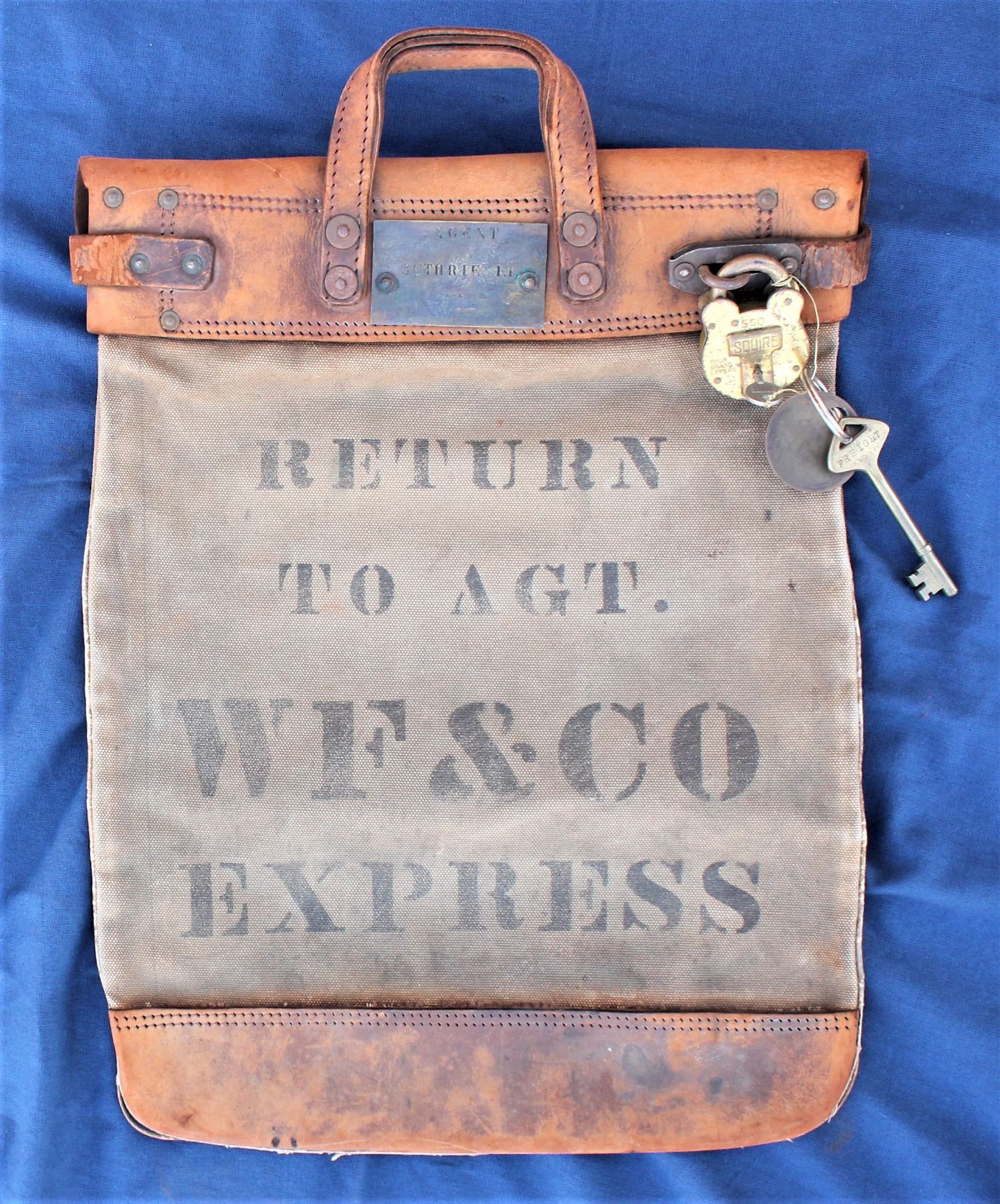 Amazing original agent bag, with brass tag stating "Agent Guthrie I.T.", which identifies Guthrie, Oklahoma Indian Territory. The body of the bag is nicely stenciled "WF&CO Express", and is complete with its original lock and keys, and is a great size, measuring 15" x 19".