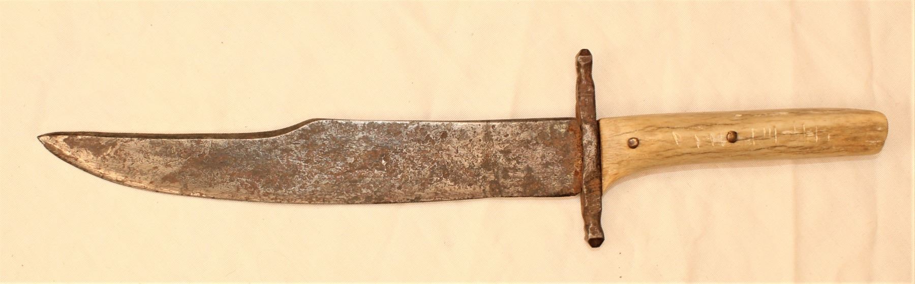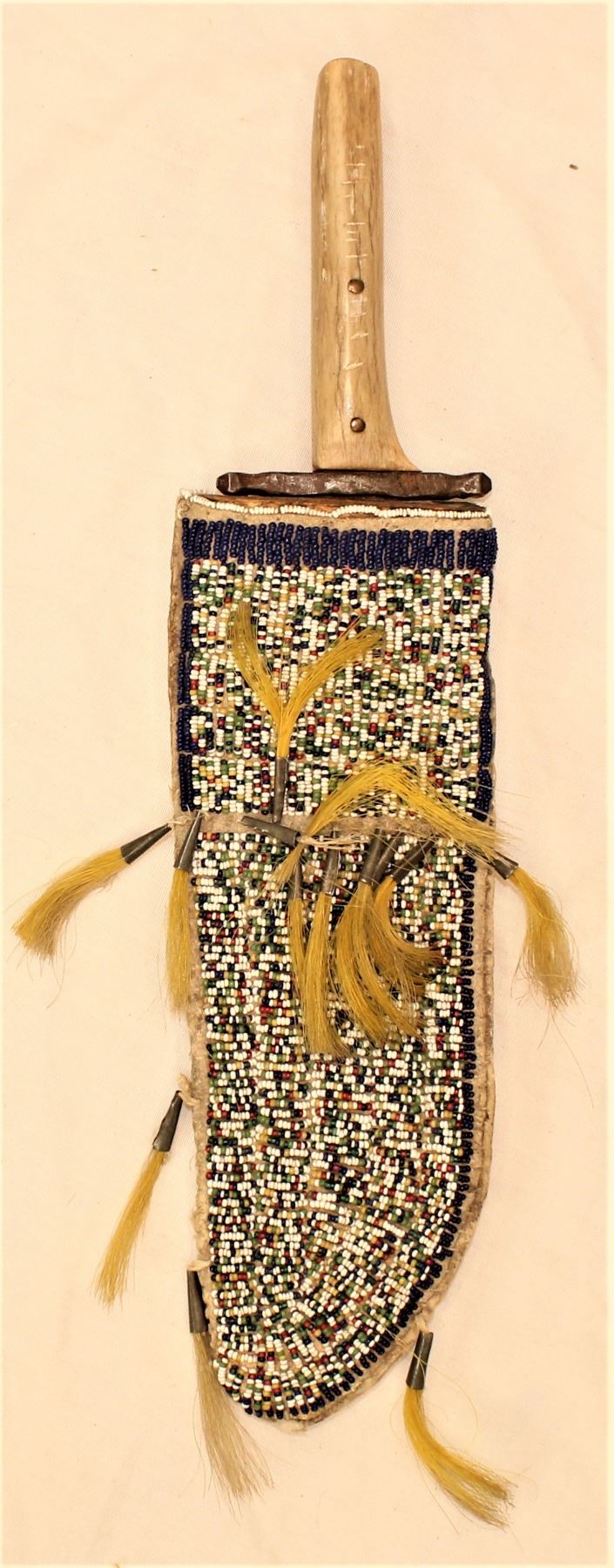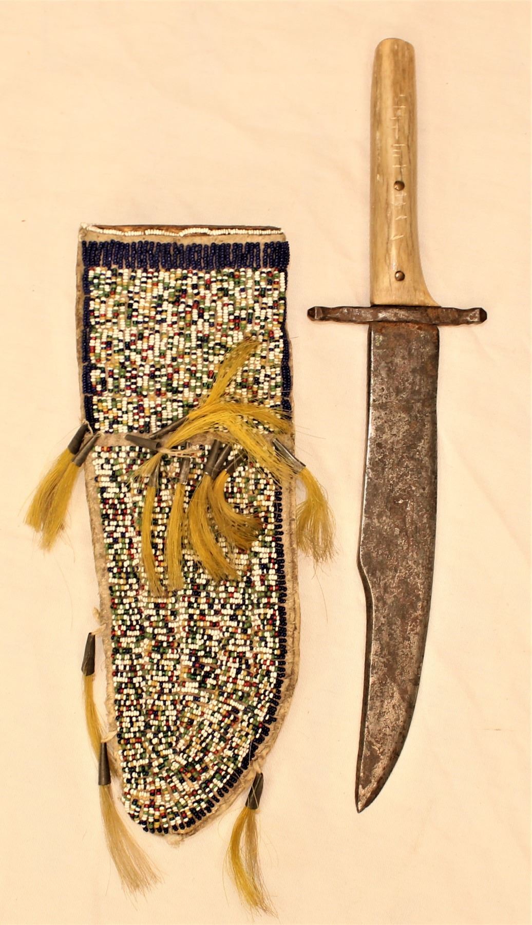 Desirable large lined knife sheath fully beaded in salt and pepper design and adorned with tinkle cones, accompanied with a period clip point knife with antler handle. Sheath measuring 3 1/4" x 10".