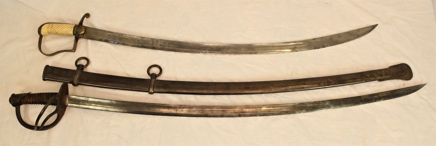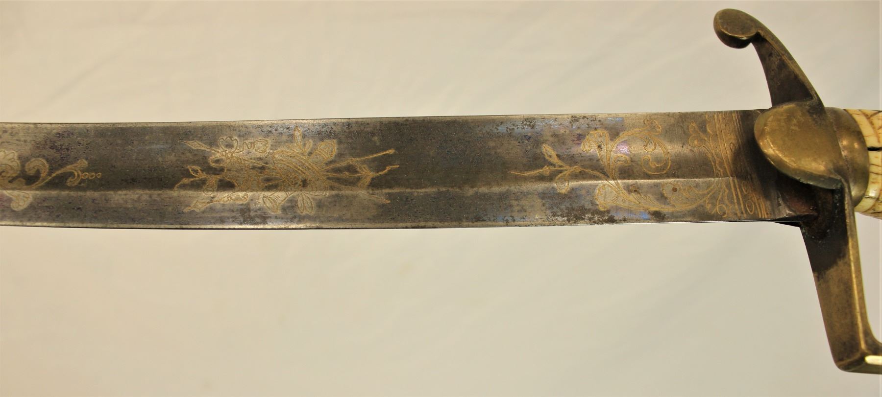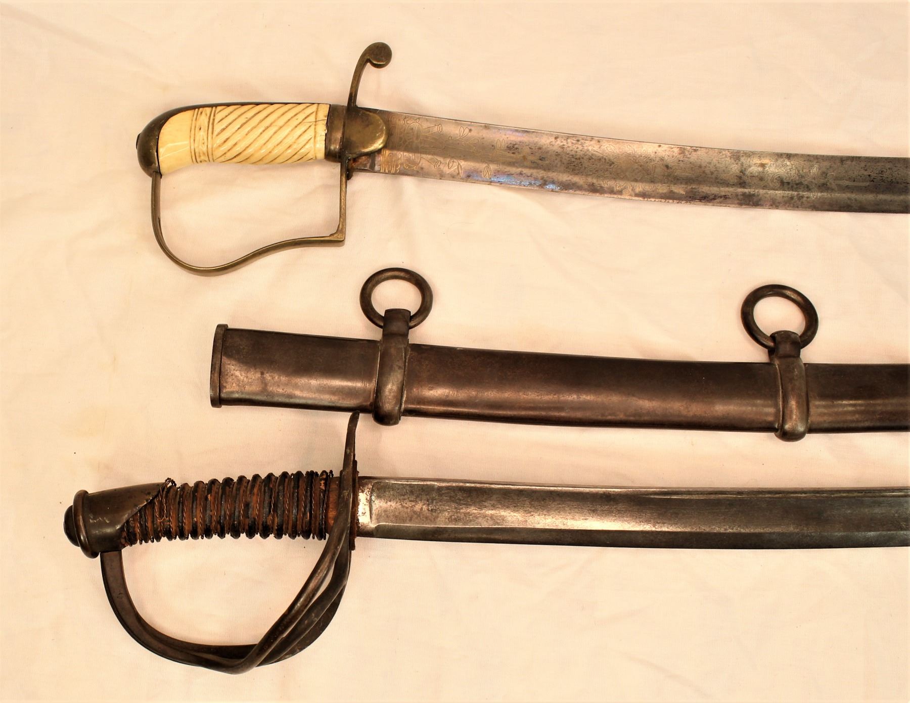 Two swords, first one with bone grip and engraved blade, and second one a Civil War period sabre with faintly ledgible makers mark and scabbard.