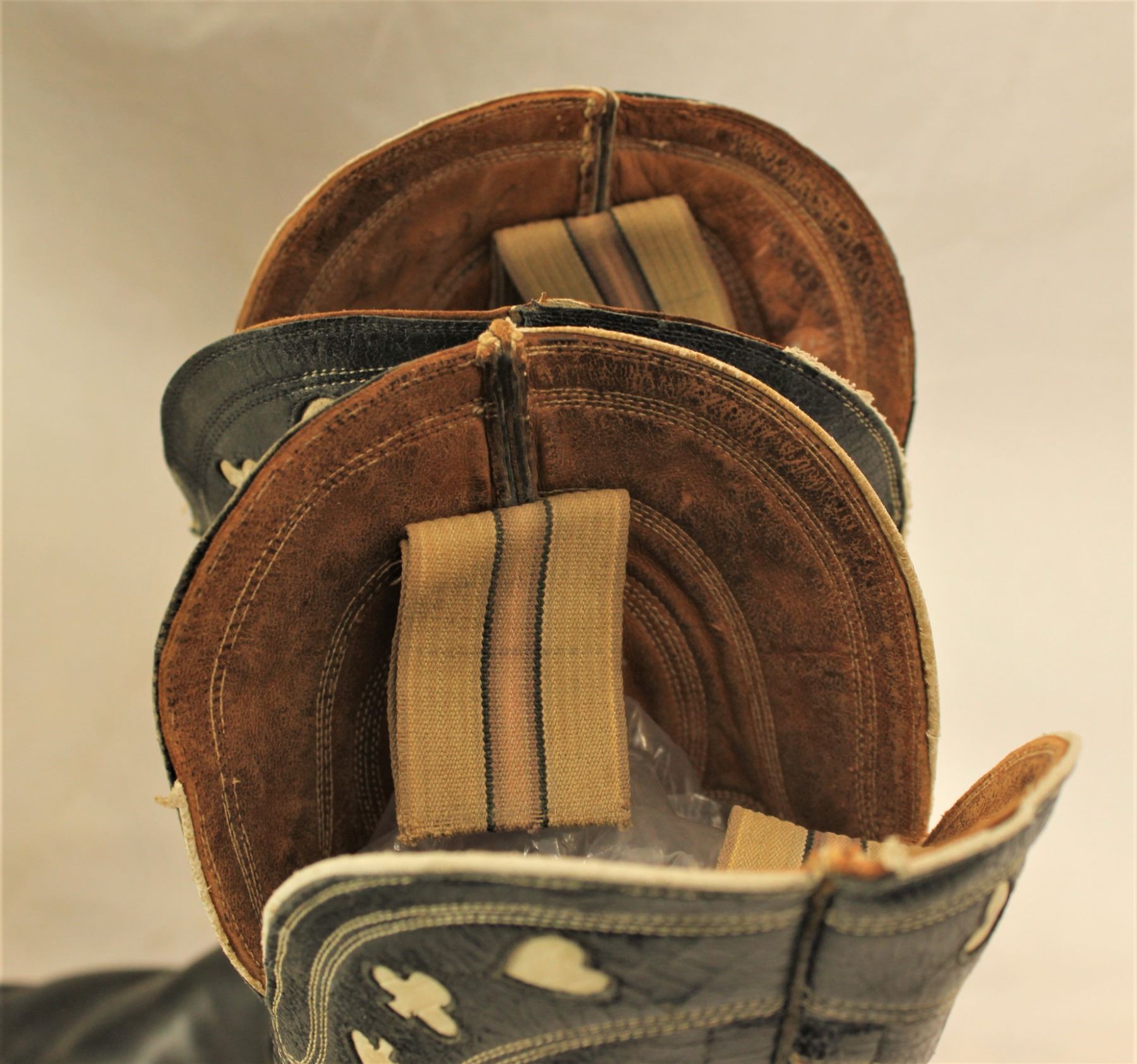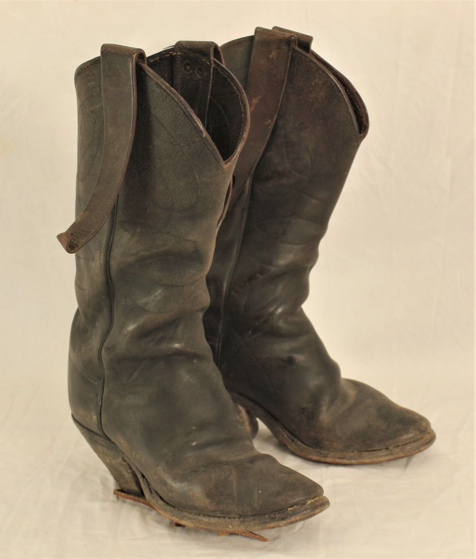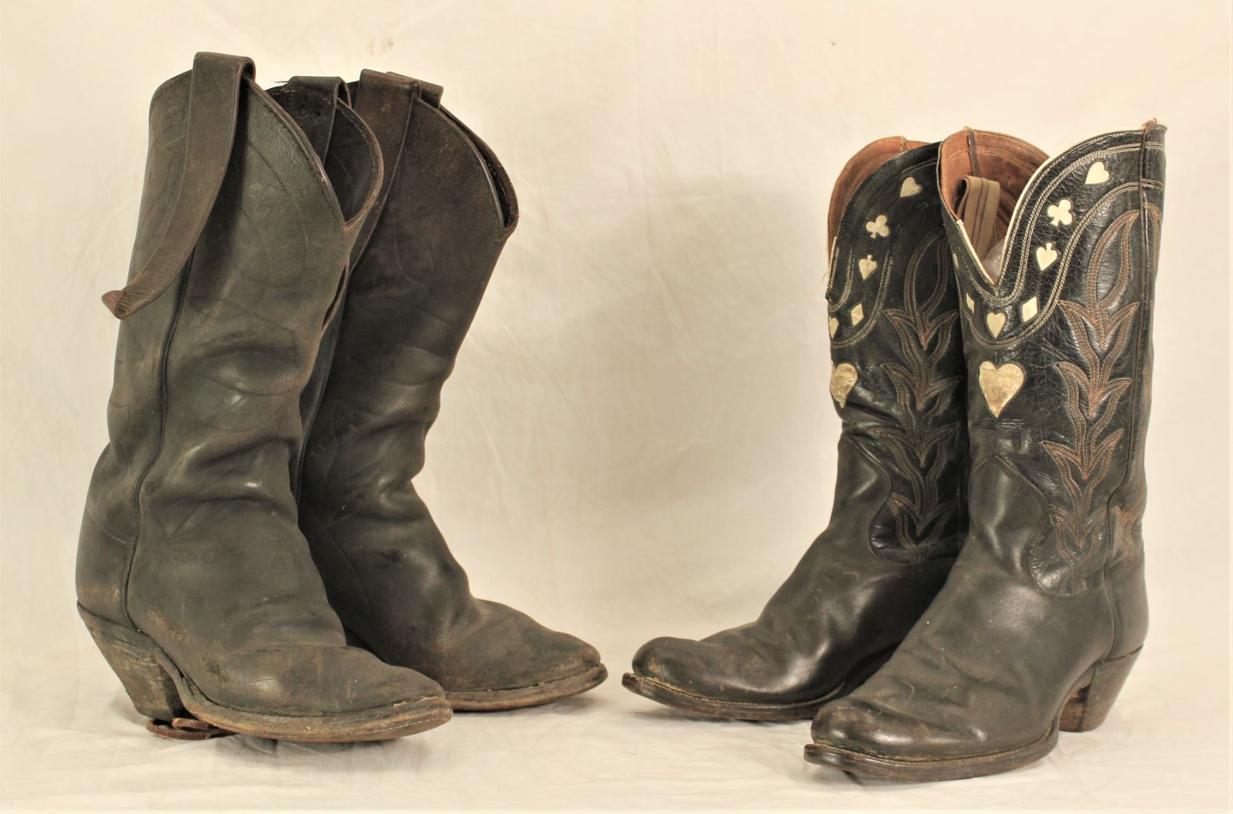 Two pairs of 1920's boots, 1) a heavy pair a working cowboy boots with radical riding heels and long mule ear pulls, 2) a nice pair of boots with decoratively stitched tops, with card suits two-tone inlaid in the tops of the uppers with long cloth pulls.
