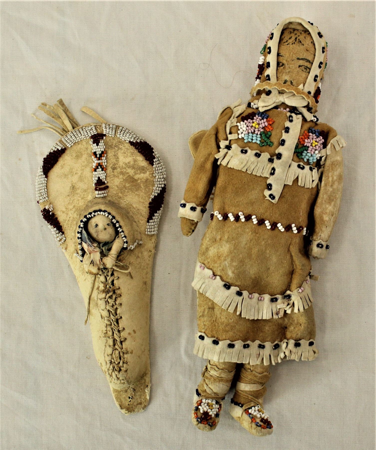 A very nice pair of dolls, 1) Plateau (Nez Perce) toy doll cradle, circa 1890, approx. 6" Iength, along with 2) an Eastern Sioux female doll with painted face, circa 1920, approx. 7" tall.