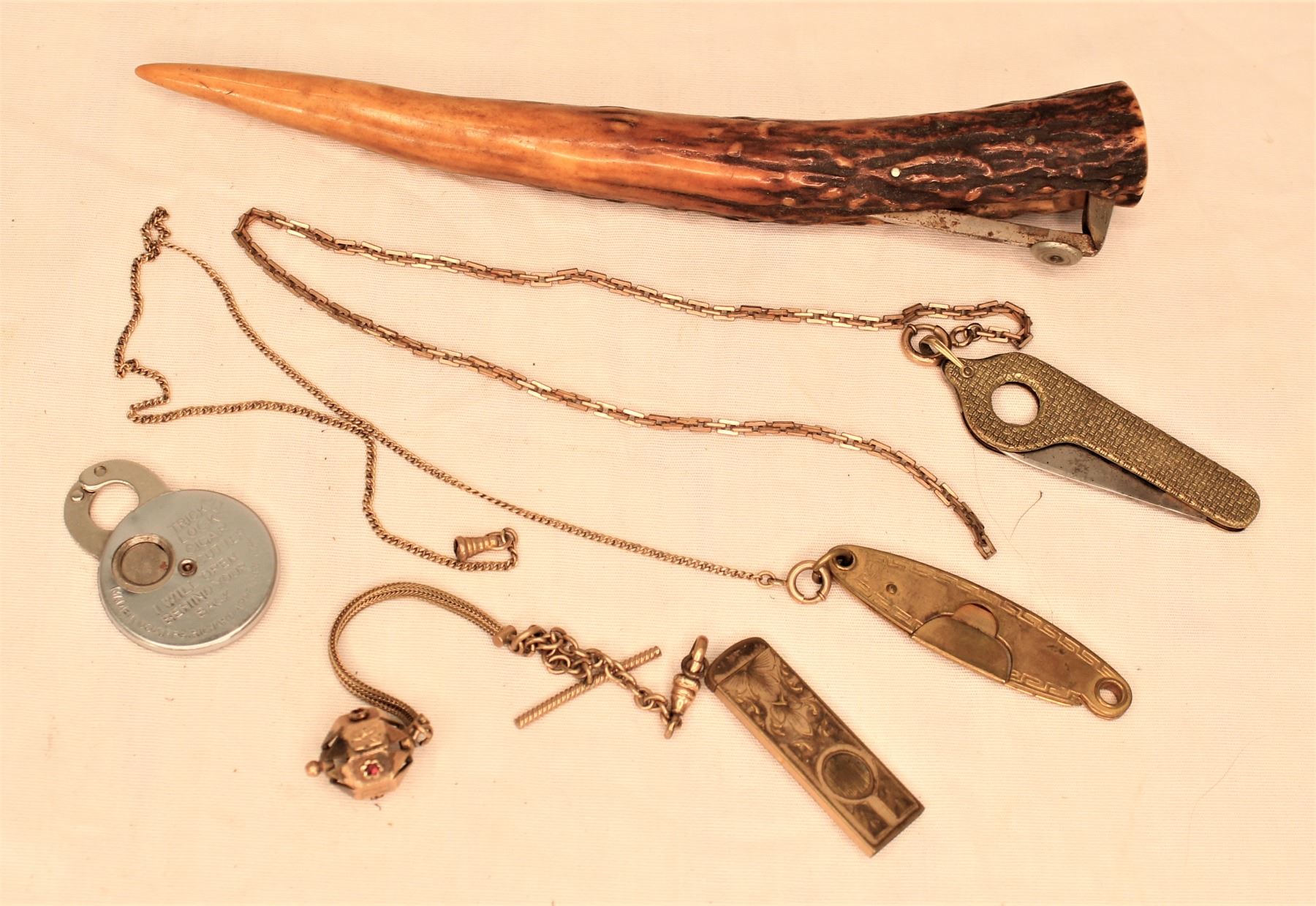 Interesting grouping of 5 cigar cutters, that include one made from antler, and three with pocket watch chains.