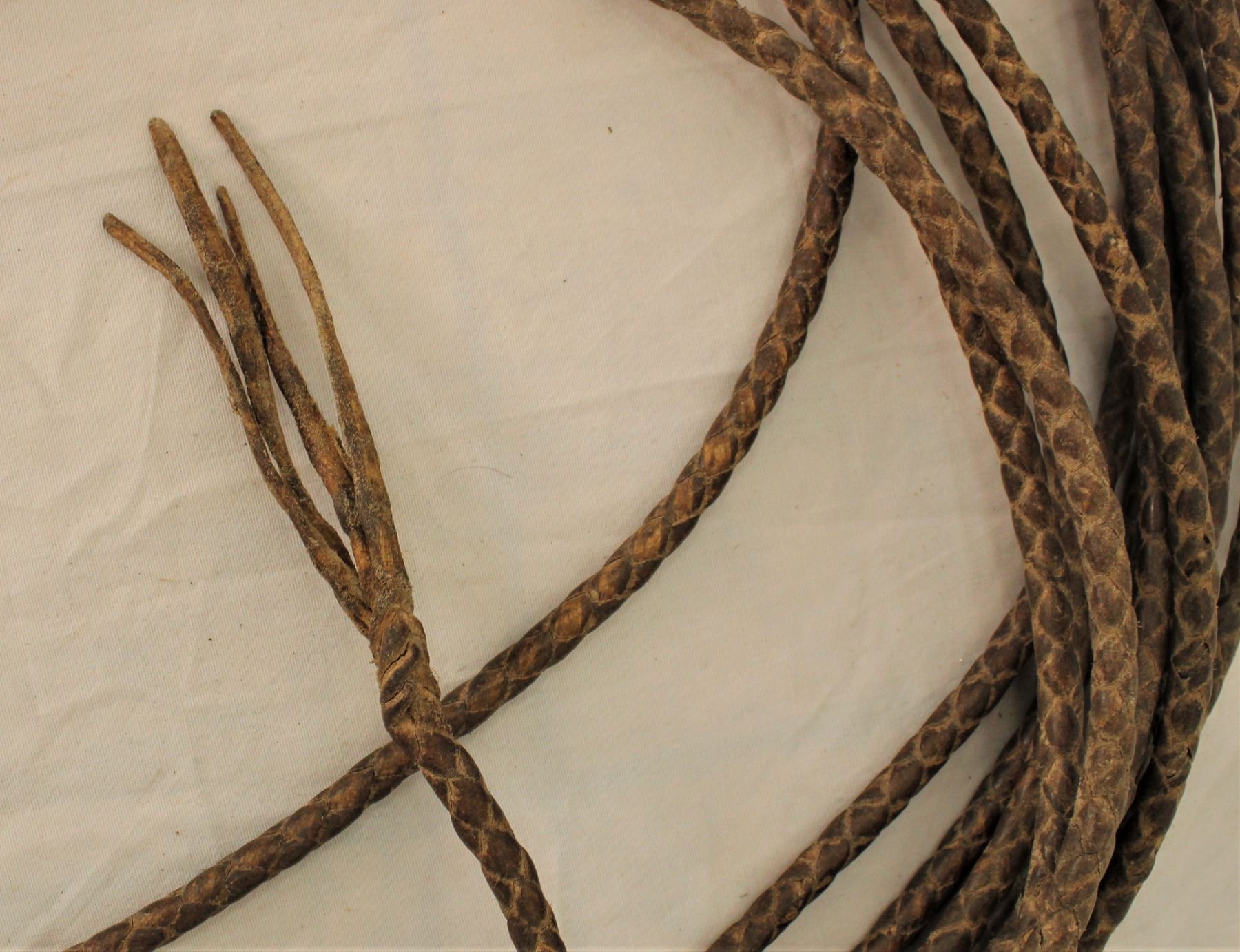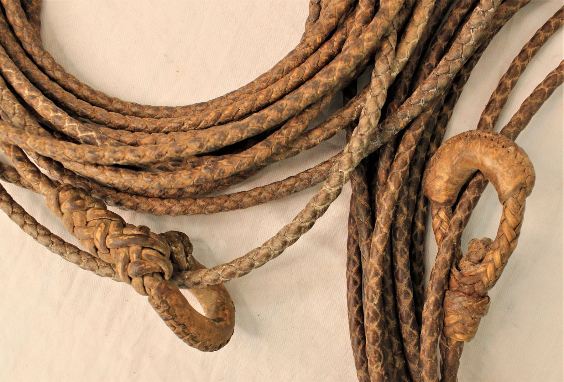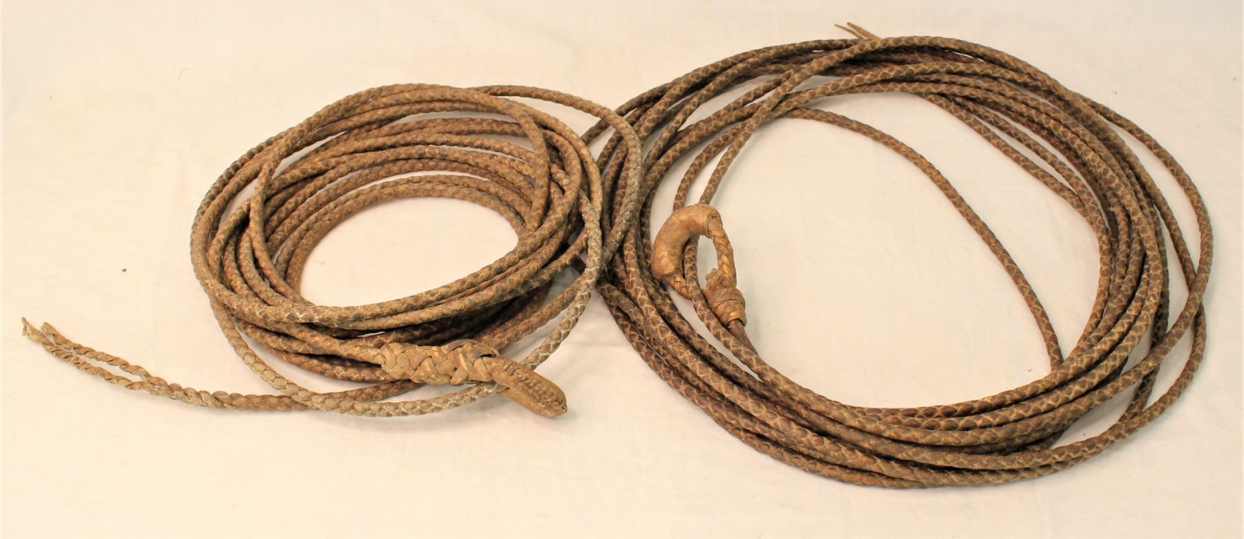 Grouping of two rawhide braided riatas, 1) with good looking braided hondo, 4 strand tails, and measuring approximately 40' in length, 2) with stout interstingly braided hondo and measuring approximately 30' long.