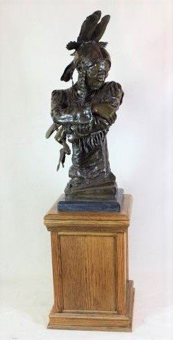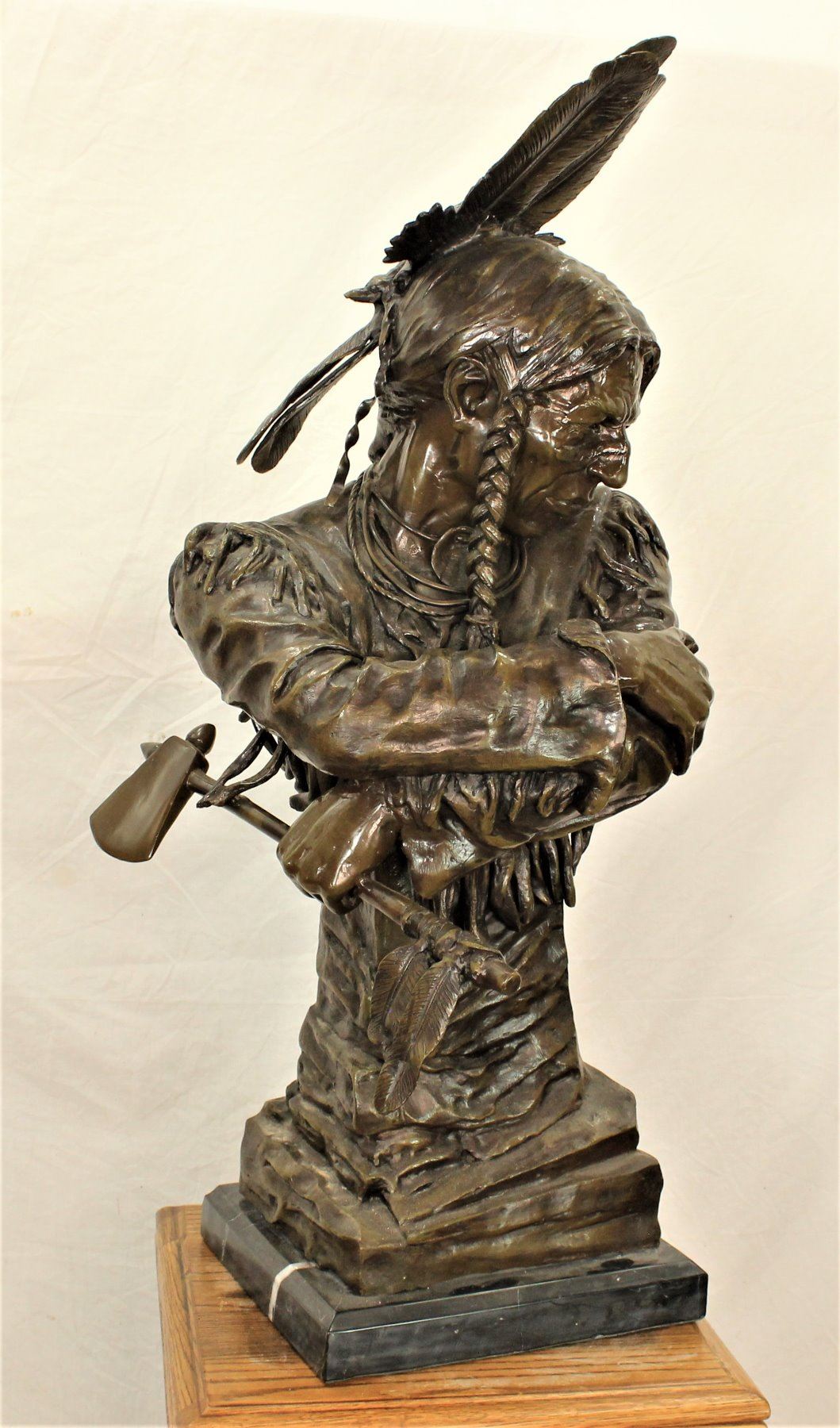 Impressive Indian warrior with tomahawk on black marble base, signed Davidson on bottom, included with custom oak base. Bronze measuring 39" tall, and 66" on pedestal.