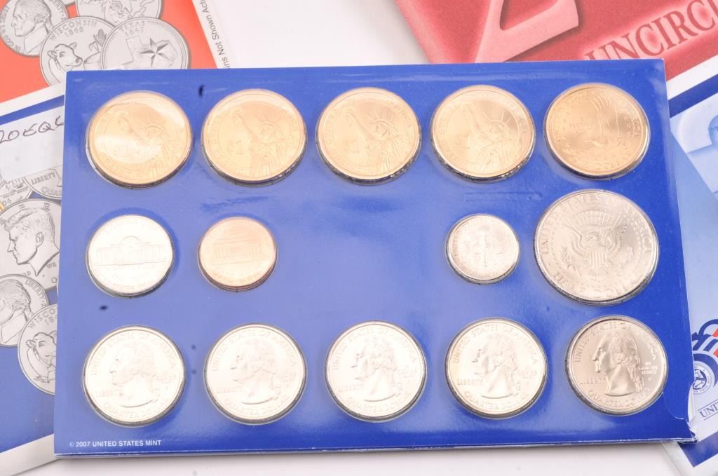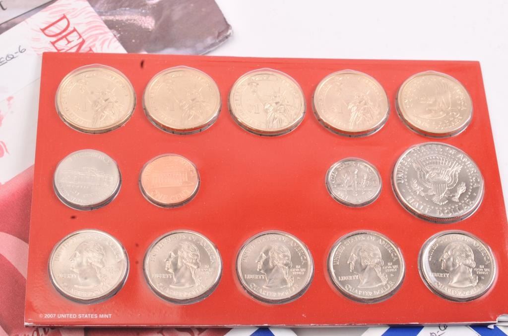 Lot of U.S. Mint uncirculated coin sets from 1977 to 2007, including twenty three total sets. 1998, 2000, 2001, 2002, 2003, 2004 and 2007 include both Philadelphia and Denver sets. All the coins are new and uncirculated in the original packaging. Est.: $150-$300.