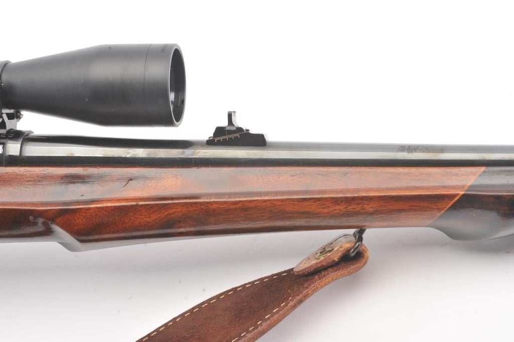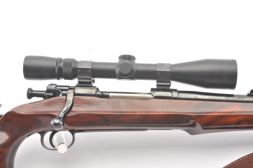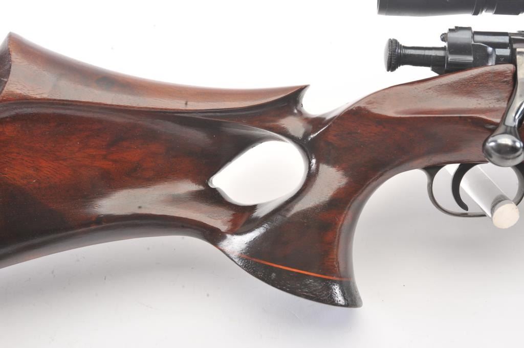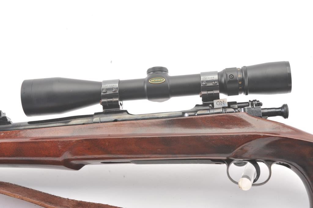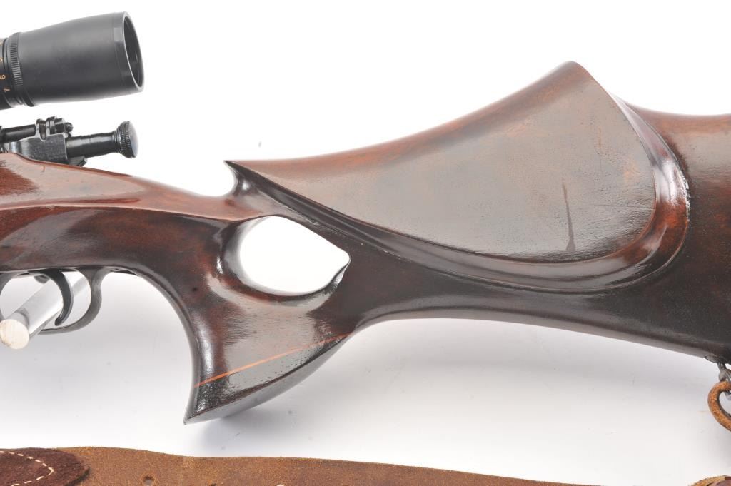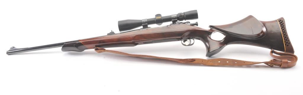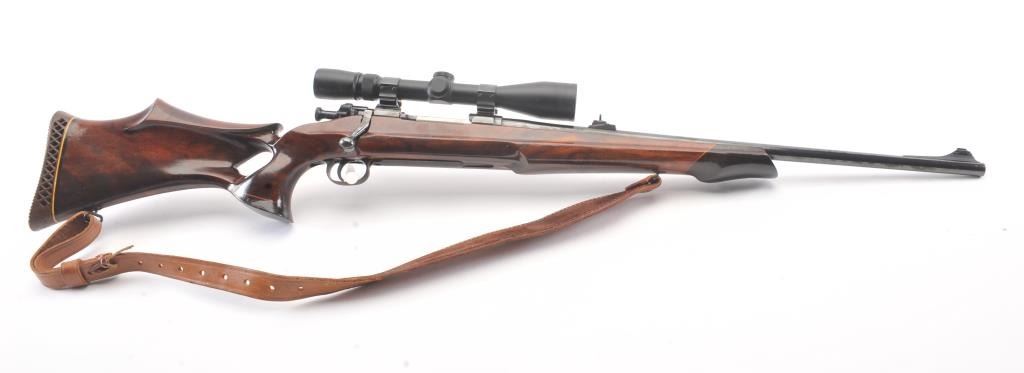 Custom Springfield 1903-A3 bolt action sporting rifle, .30-06 caliber, Serial #3267329. The rifle is in very good overall condition with a 23” barrel with a ramped blade front sight and an adjustable rear.The metal surfaces retain nearly all of the blue finish with light handling marks. The custom smooth wood thumbhole stock is in very good condition with a rosewood fore end cap, exaggerated pistol grip and rollover cheekpiece. The buttstock has sling swivels, custom leather sling and ends with a ventilated rubber recoil pad providing a 14” LOP. The bore is good, the action is crisp and the markings are sharp on this customSpringfield. The rifle is topped with Weaver rings and a Weaver 3 x 9 variable power rifle scope with clear, crisp optics. Est.: $500-$1,000. (C+R).
