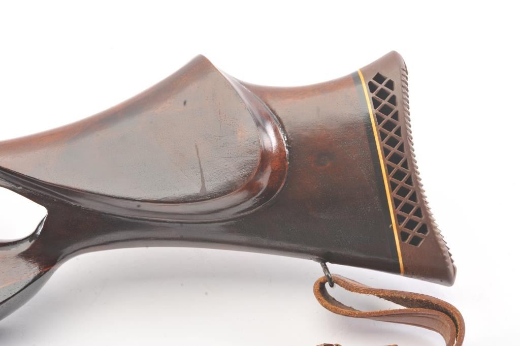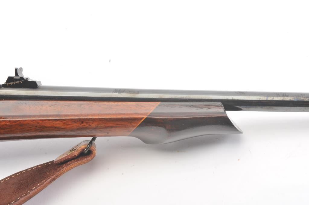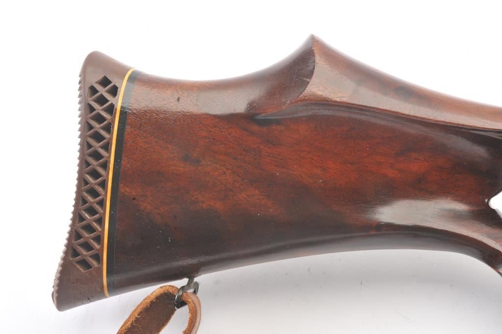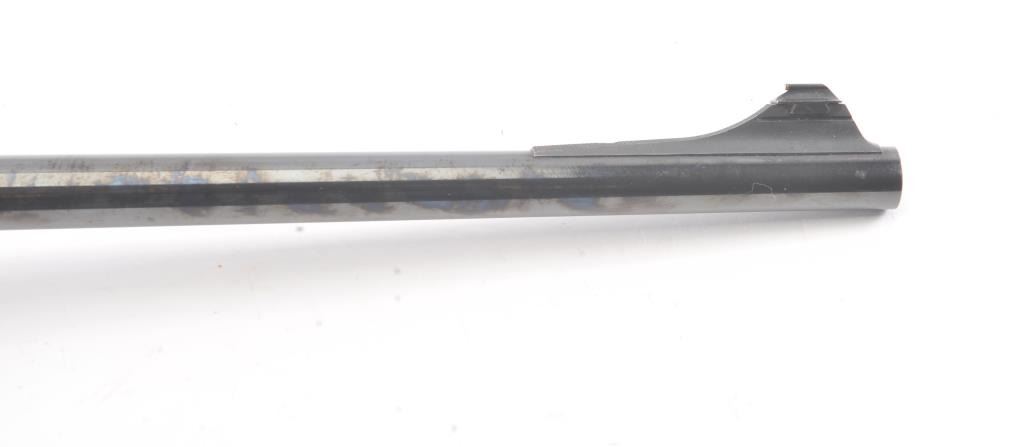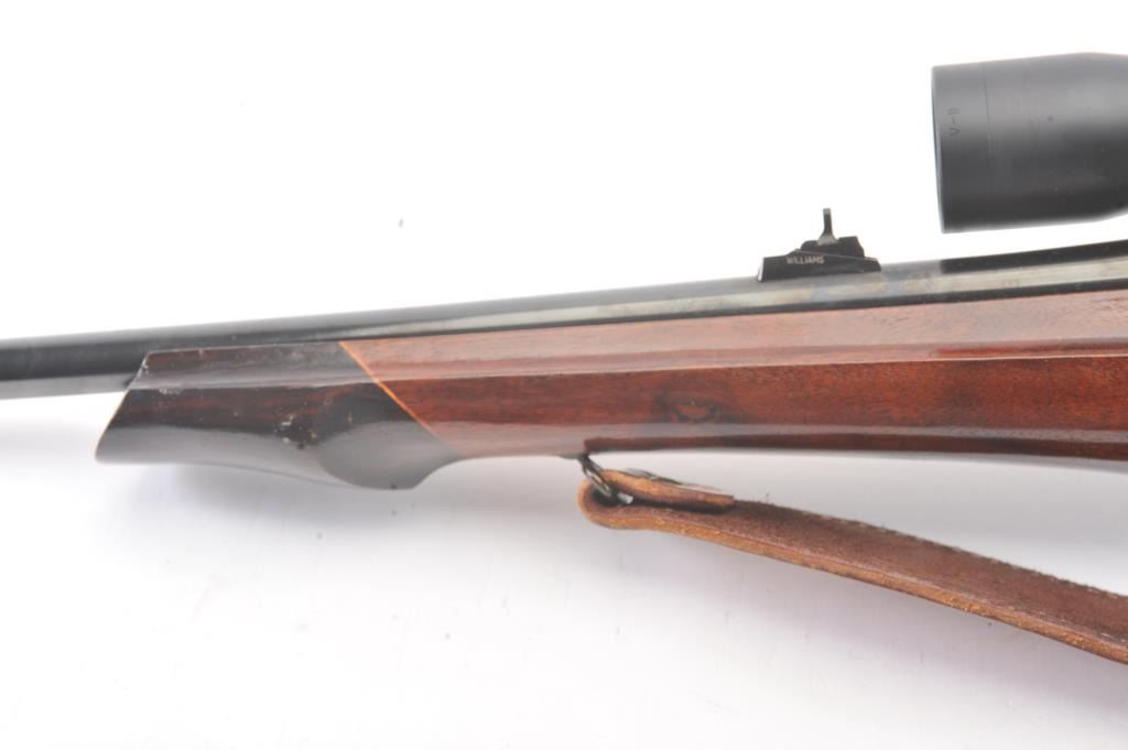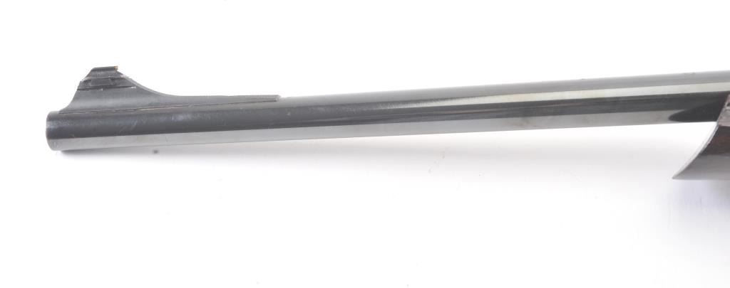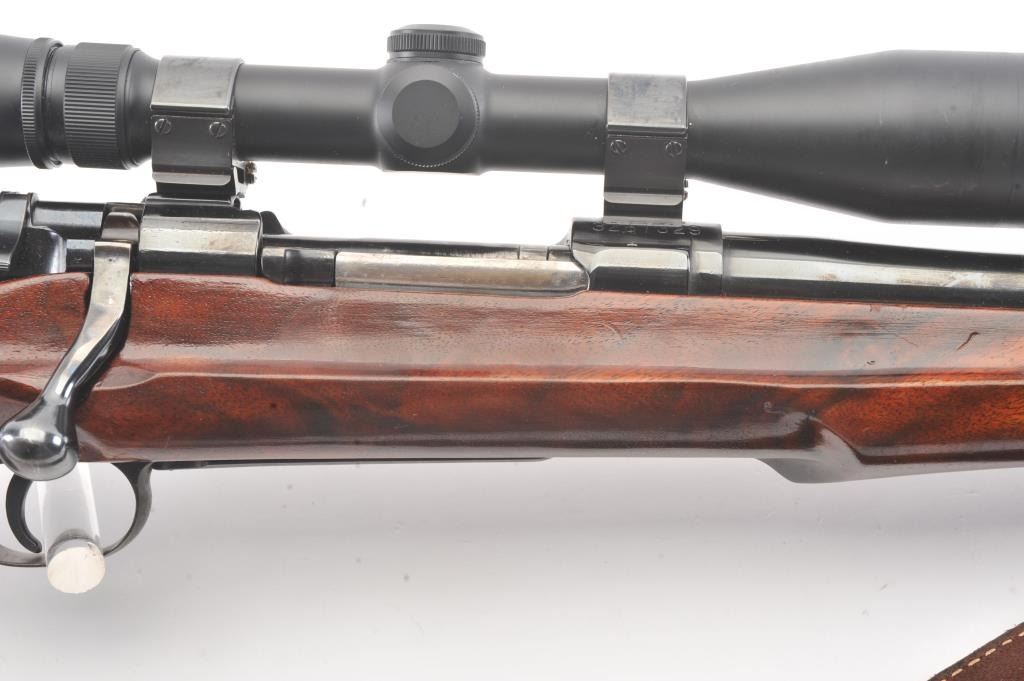 Custom Springfield 1903-A3 bolt action sporting rifle, .30-06 caliber, Serial #3267329. The rifle is in very good overall condition with a 23” barrel with a ramped blade front sight and an adjustable rear.The metal surfaces retain nearly all of the blue finish with light handling marks. The custom smooth wood thumbhole stock is in very good condition with a rosewood fore end cap, exaggerated pistol grip and rollover cheekpiece. The buttstock has sling swivels, custom leather sling and ends with a ventilated rubber recoil pad providing a 14” LOP. The bore is good, the action is crisp and the markings are sharp on this customSpringfield. The rifle is topped with Weaver rings and a Weaver 3 x 9 variable power rifle scope with clear, crisp optics. Est.: $500-$1,000. (C+R).