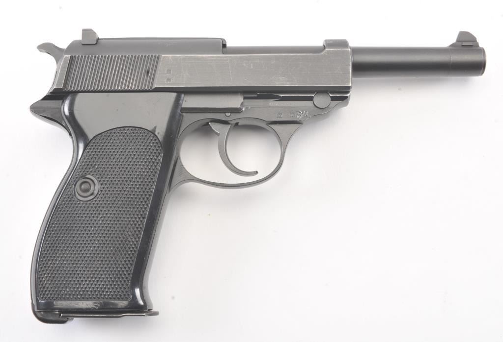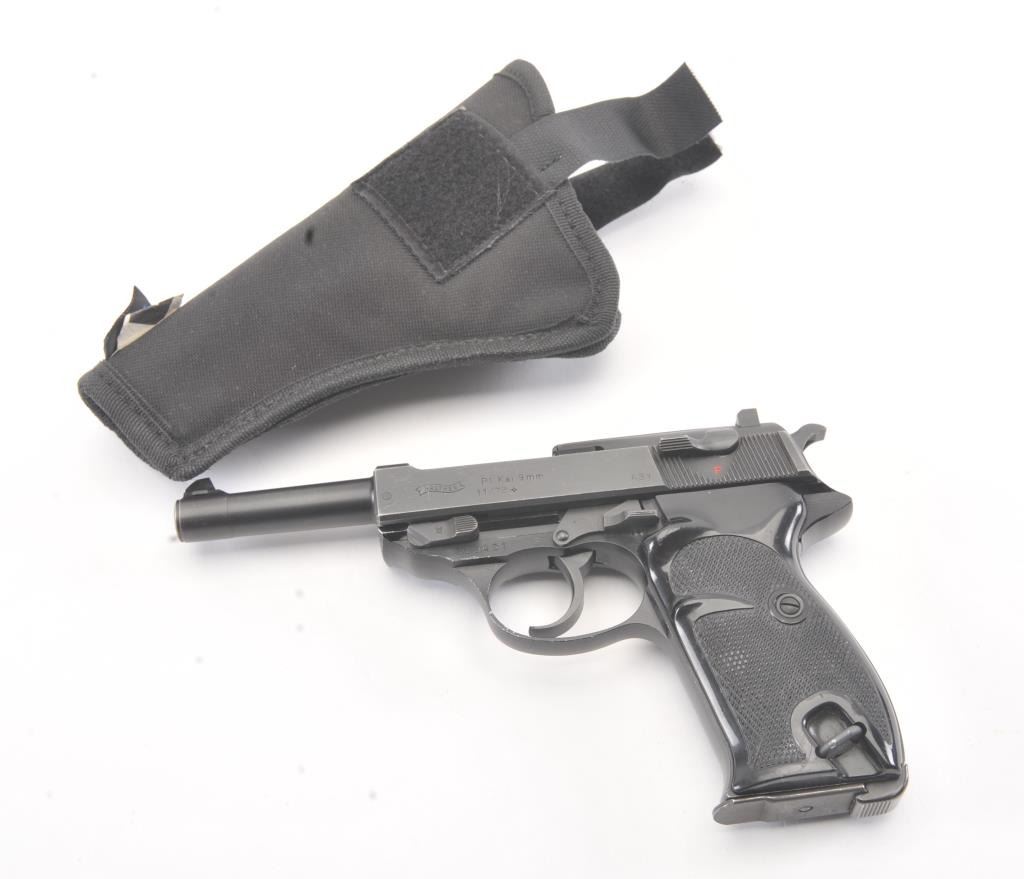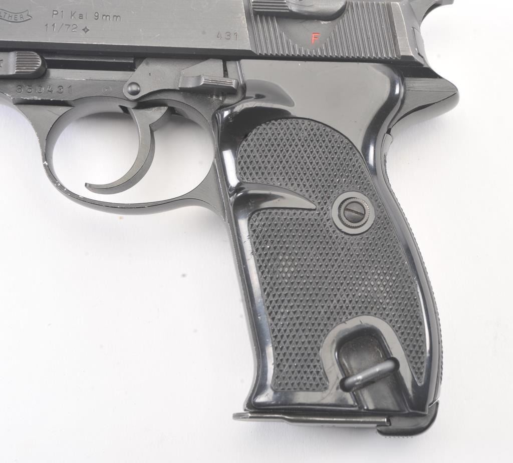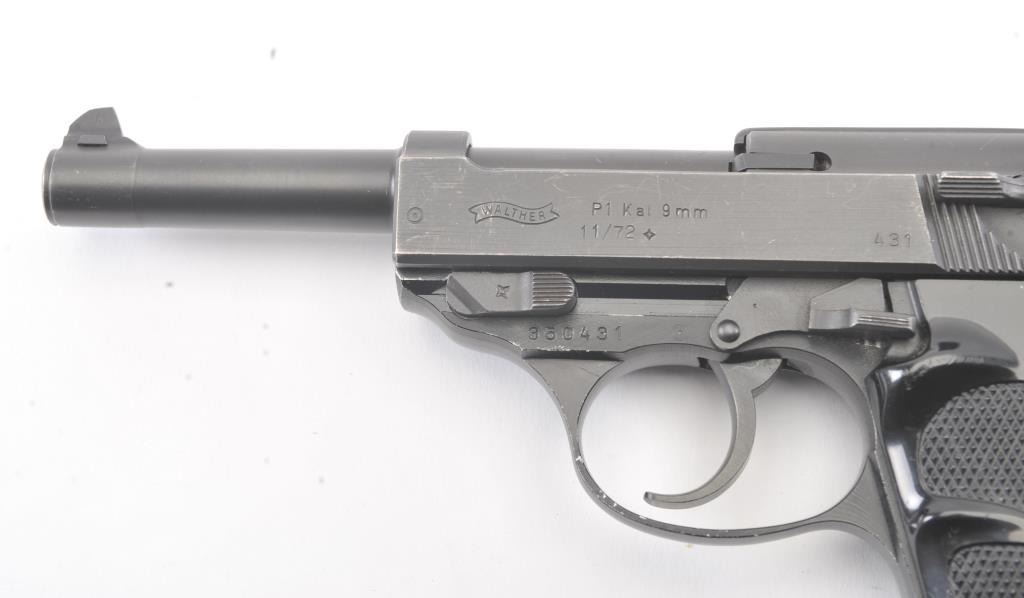 Walther Model P1 semi-automatic pistol, 9mm caliber, Serial #350431. The pistol is in fine overall condition with a 4.9” barrel. The pistol retains nearly all of the blue finish with light holster wear at the muzzleand high point edge wear. The slide has a crisp Walther banner and the frame shows German proofs and acceptance marks. The checkered plastic grips are in very good condition. The lot includes one correctmagazine and a nylon belt holster. The bore is good and the action works well on this Post-War Walther. Est.: $300-$600. (Modern/PPT).