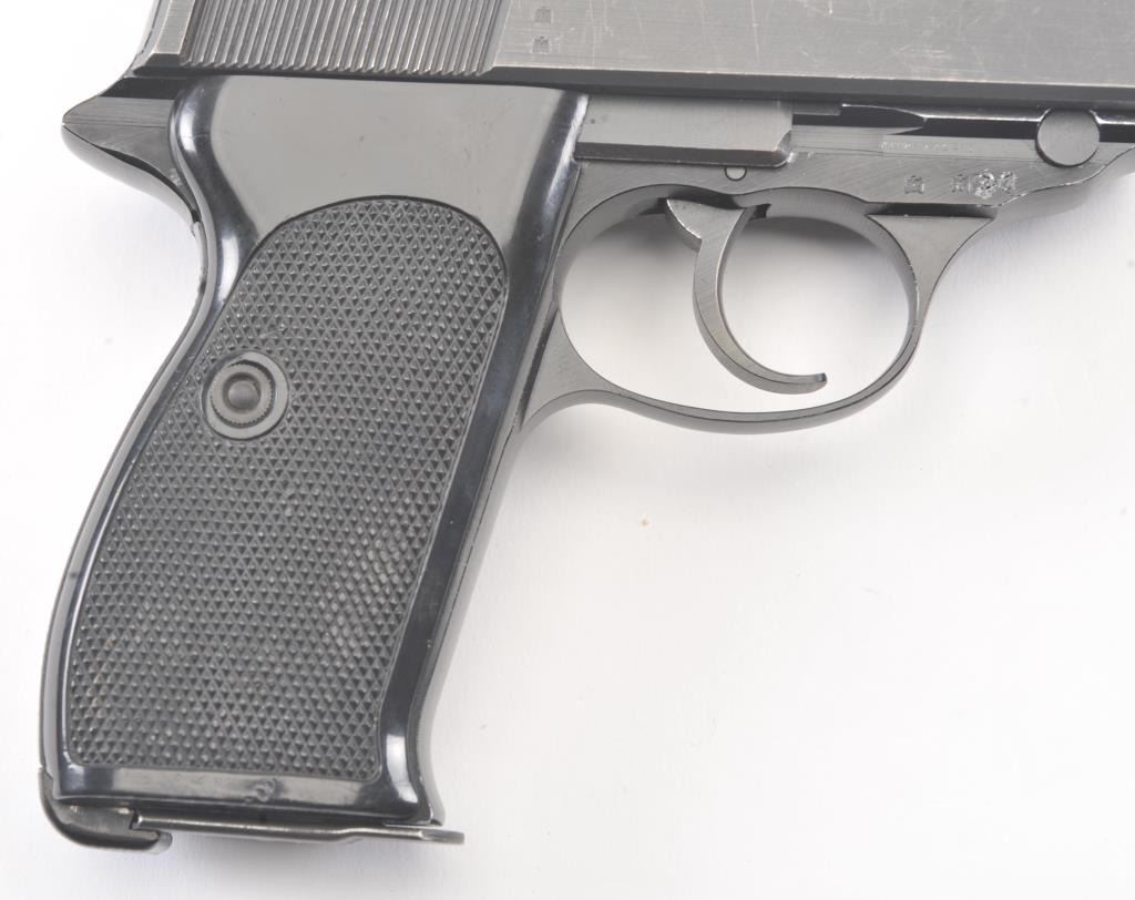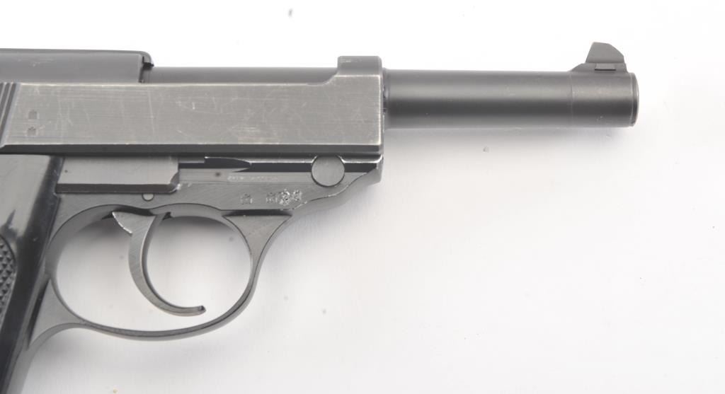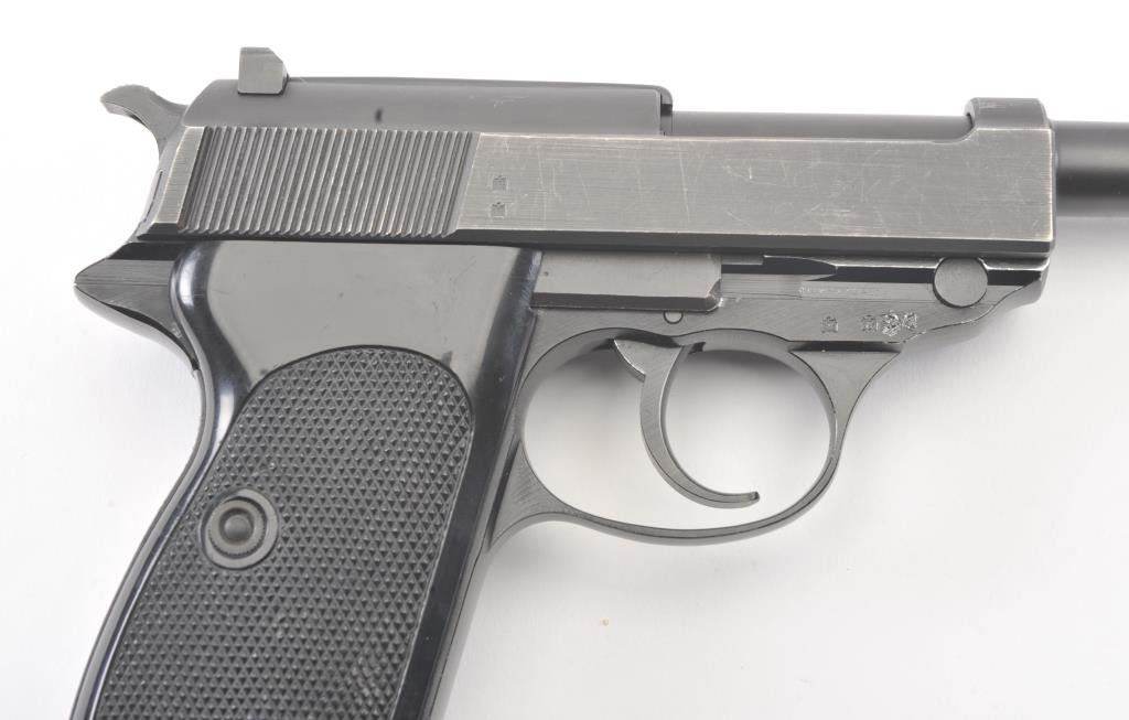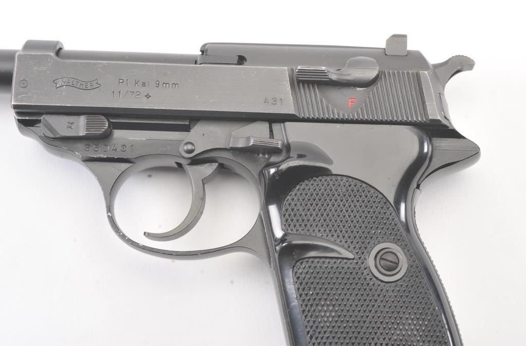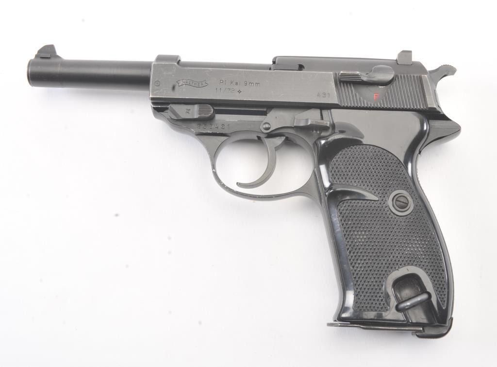 Walther Model P1 semi-automatic pistol, 9mm caliber, Serial #350431. The pistol is in fine overall condition with a 4.9” barrel. The pistol retains nearly all of the blue finish with light holster wear at the muzzleand high point edge wear. The slide has a crisp Walther banner and the frame shows German proofs and acceptance marks. The checkered plastic grips are in very good condition. The lot includes one correctmagazine and a nylon belt holster. The bore is good and the action works well on this Post-War Walther. Est.: $300-$600. (Modern/PPT).
