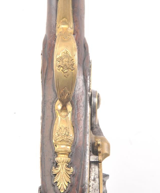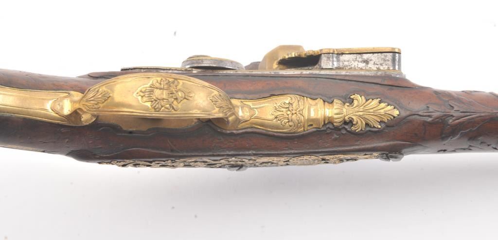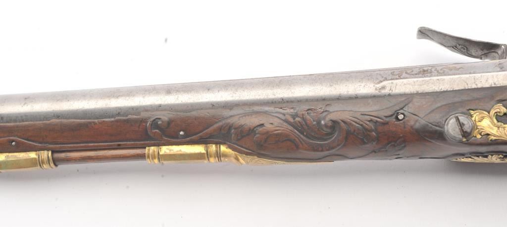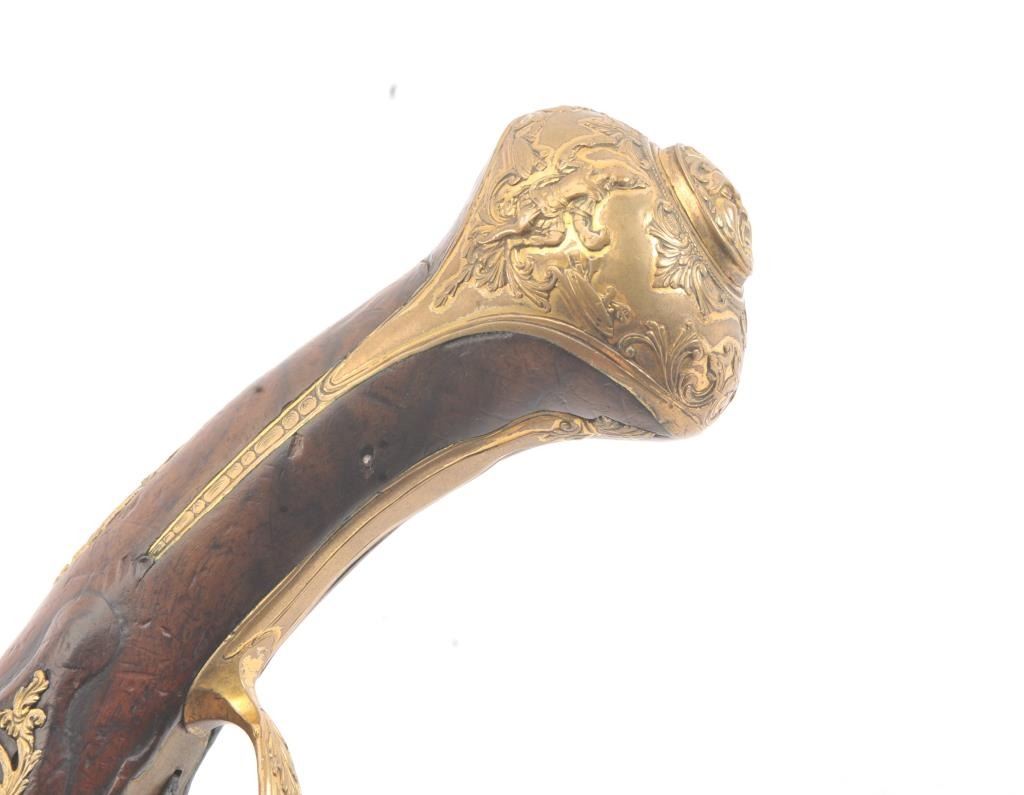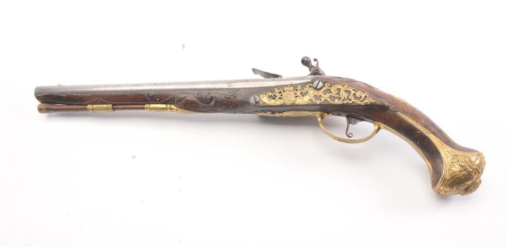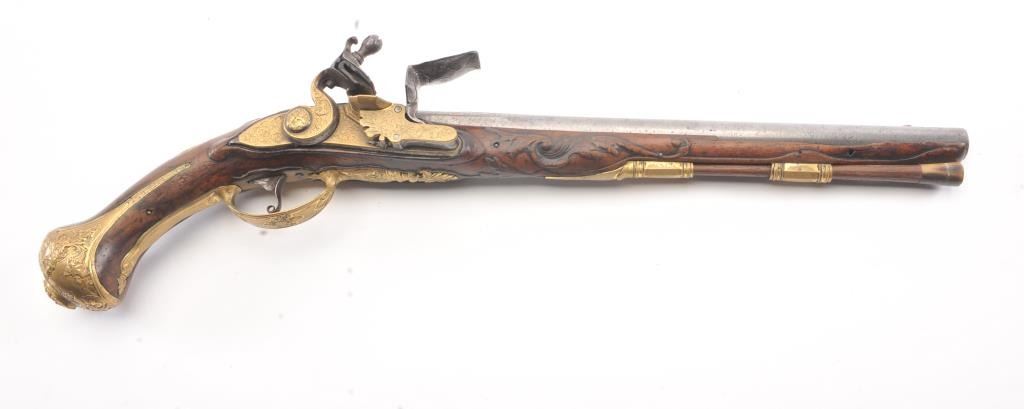 Large Germanic Flintlock Horseman’s pistol circa Mid-18th century with fancy gilt brass sheathing to hammer with cover on the frizzen spring. Measures 20” overall with a 13 1/8” barrel of approximately .52-.58 smoothbore.All original flintlock parts. Good overall condition with some losses at the top edge. Of the fore end and other minor signs of aging and use. The quality is considerably better than average and the figures are not“Rubbed Out” on the mounts. Breech end of the barrel is nicely silver inlaid. (Antique) Est.: $1250-$2500