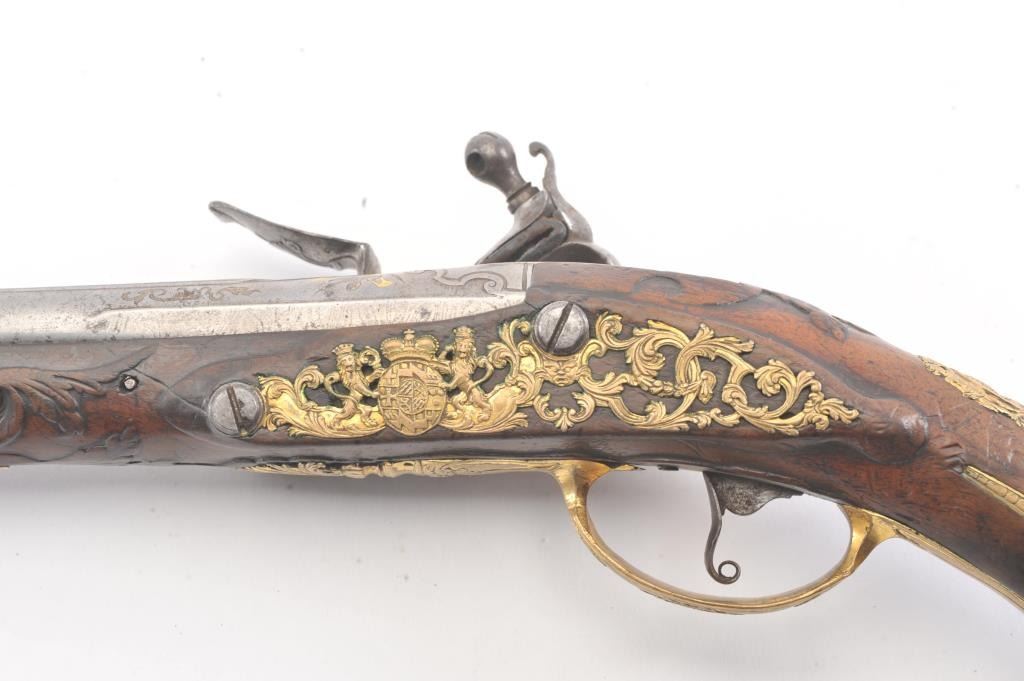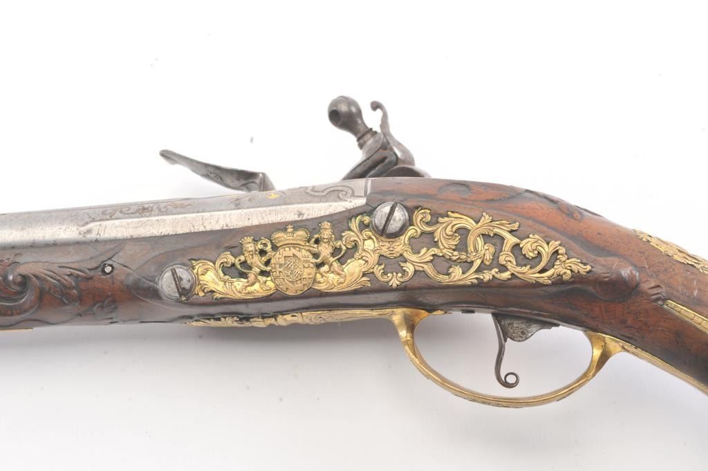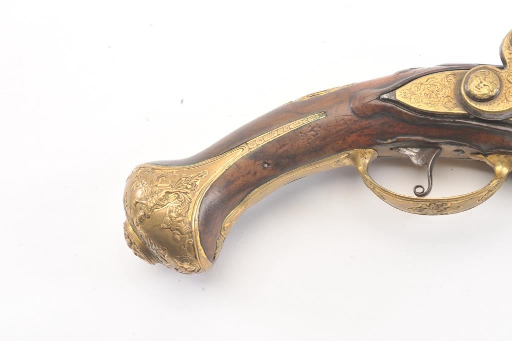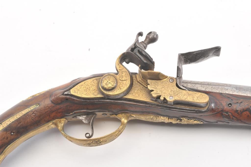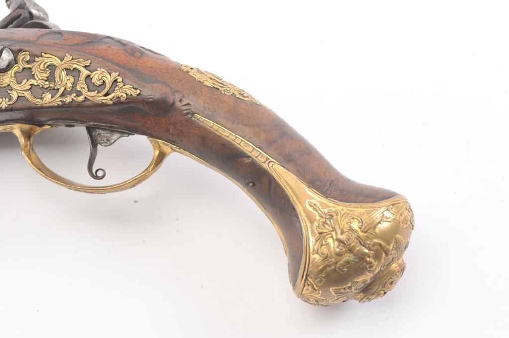 Large Germanic Flintlock Horseman’s pistol circa Mid-18th century with fancy gilt brass sheathing to hammer with cover on the frizzen spring. Measures 20” overall with a 13 1/8” barrel of approximately .52-.58 smoothbore.All original flintlock parts. Good overall condition with some losses at the top edge. Of the fore end and other minor signs of aging and use. The quality is considerably better than average and the figures are not“Rubbed Out” on the mounts. Breech end of the barrel is nicely silver inlaid. (Antique) Est.: $1250-$2500
