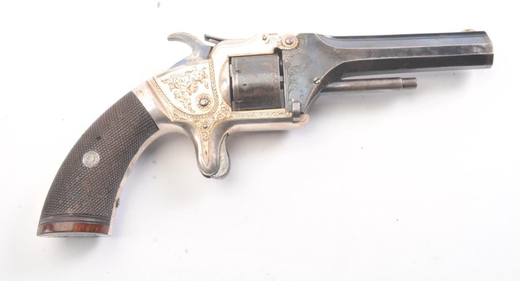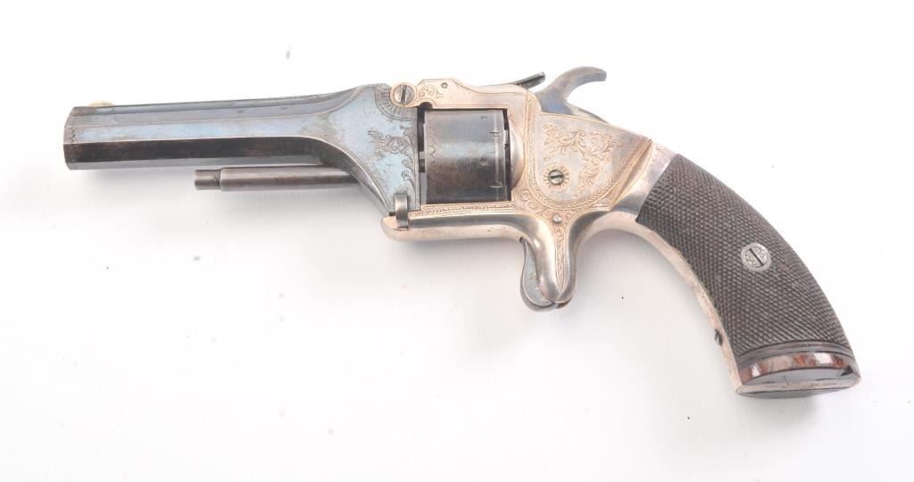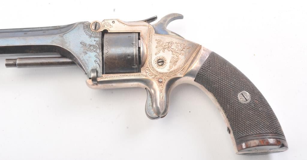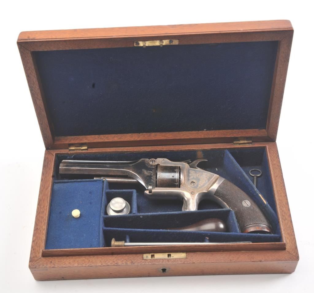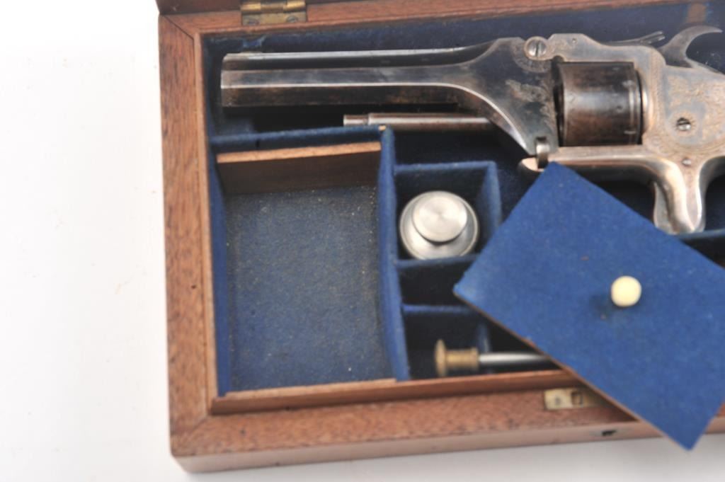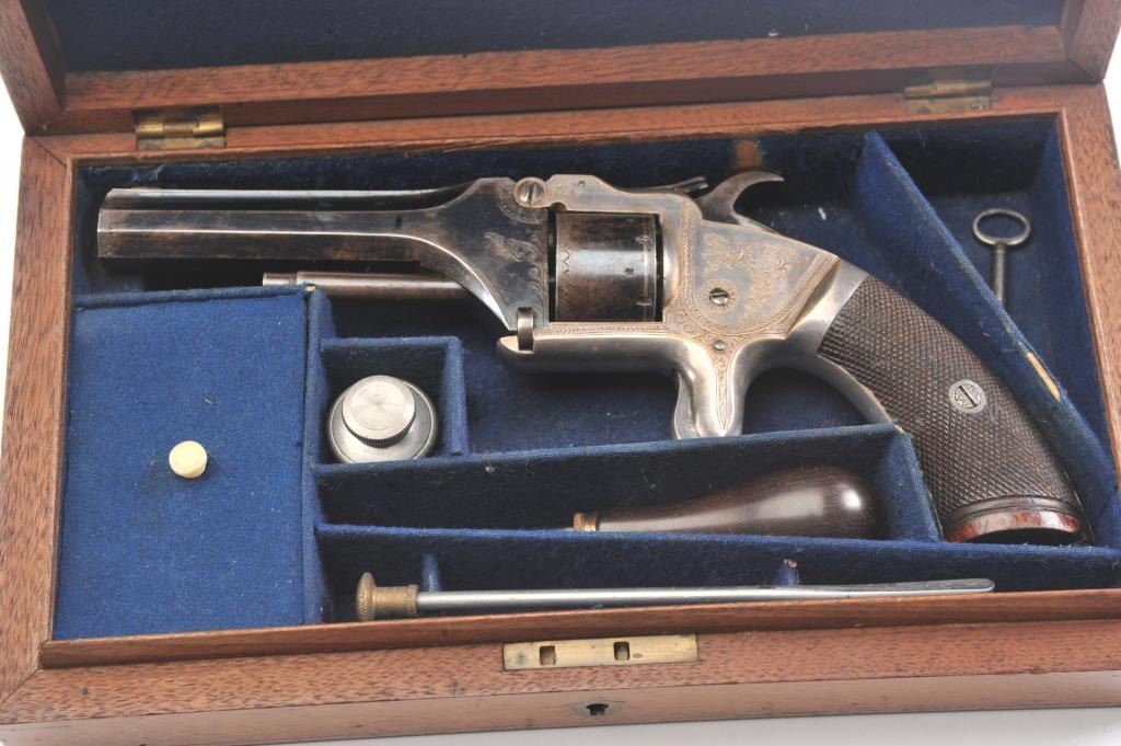 English infringement on Smith & Wesson #2 Army design marked "Patent No. 323" on the barrel in .32 Rimfire caliber with tip up barrel and S&W style latching. Scroll engraved with blue and silver finish andcheckered wood grips. British proofs. 75%-85% original bright blue and silver with near fine grips. The case is also very good plus with some minor fraying and aging. Oiler, screwdriver, rod and key included. Measures9" overall with a 4" barrel. Veneer wood exterior to case in almost fine condition. (Antique) Est.: $800-$1600