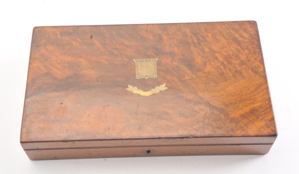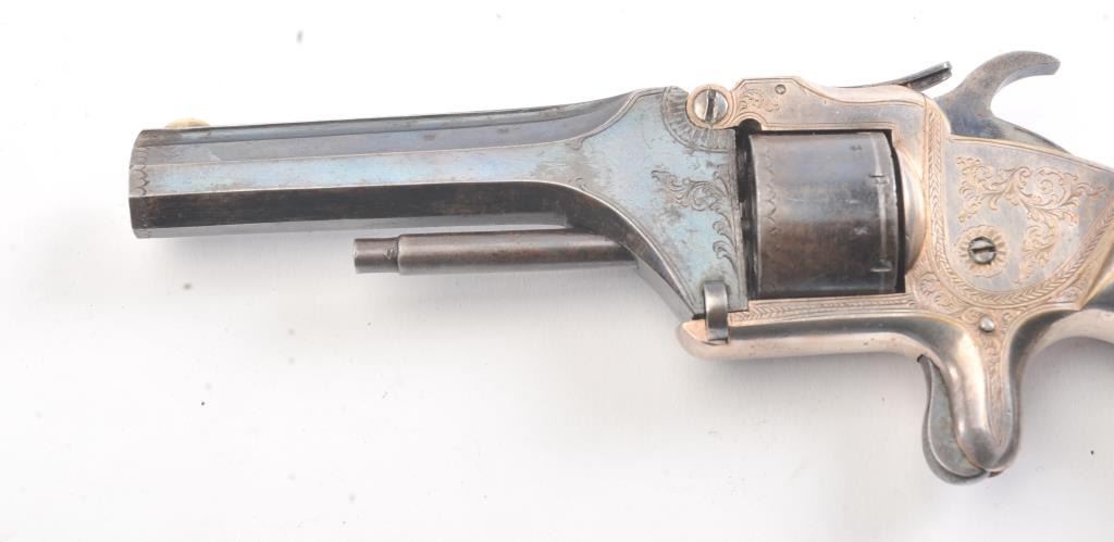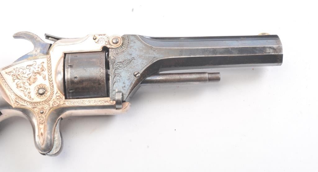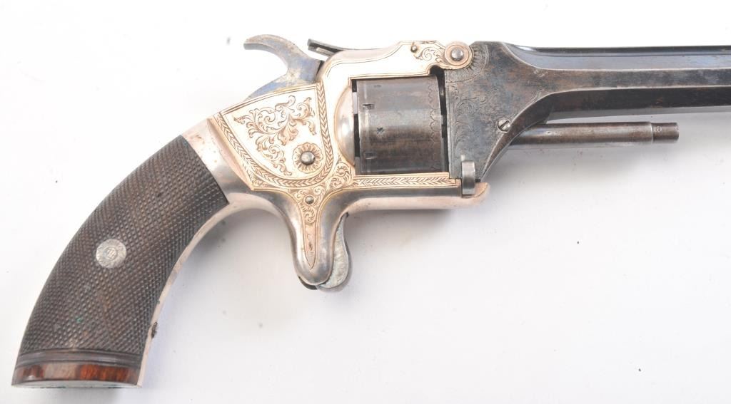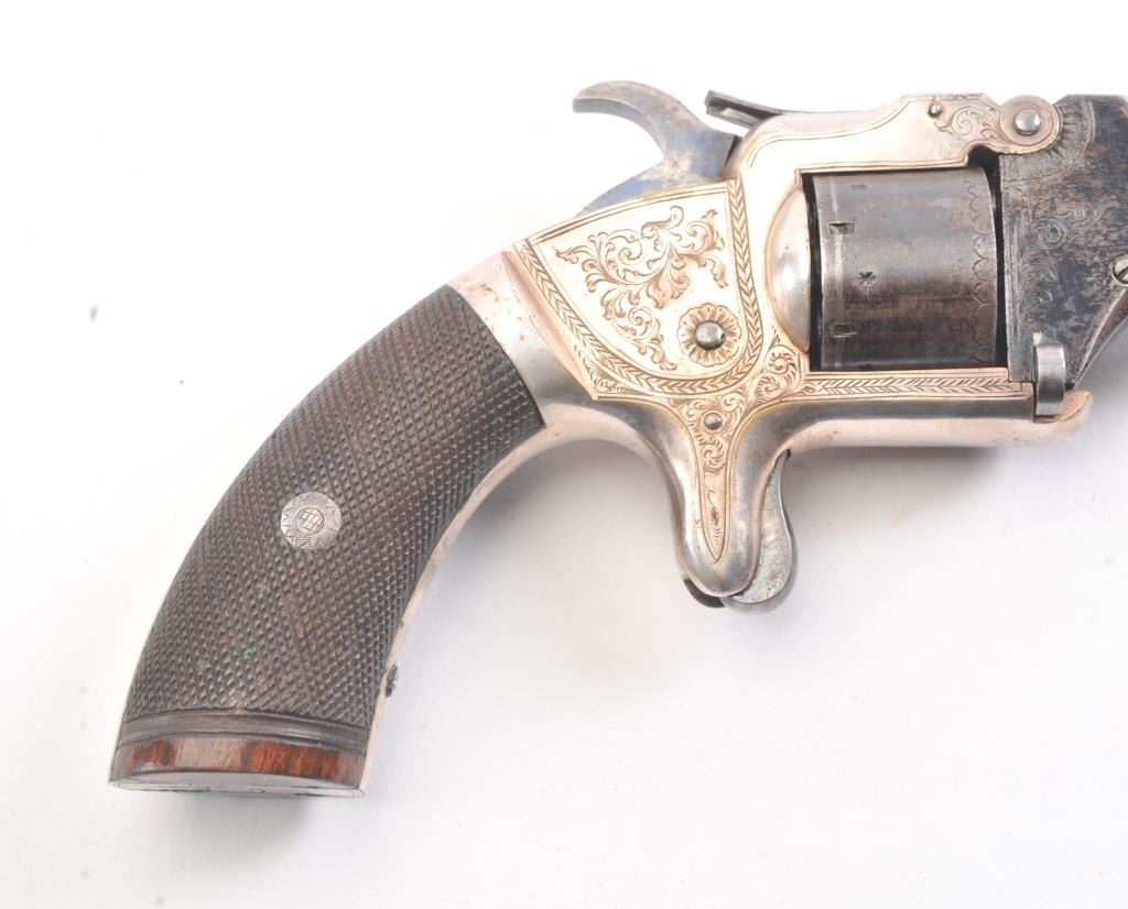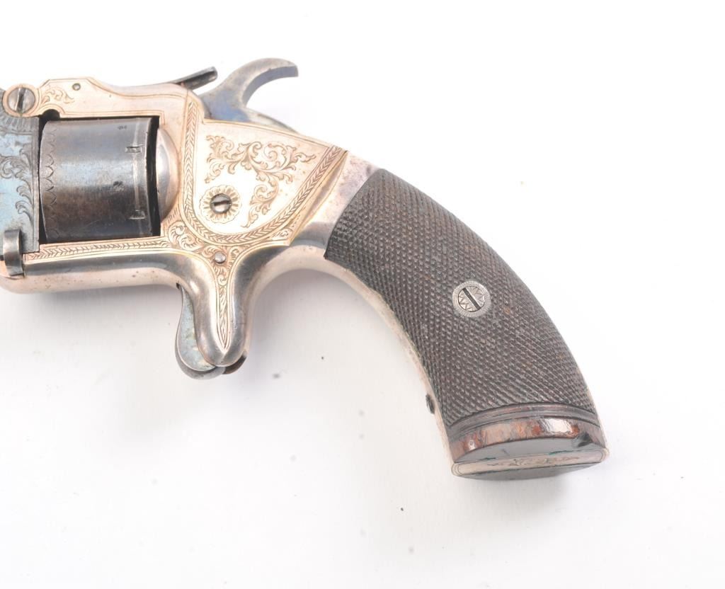 English infringement on Smith & Wesson #2 Army design marked "Patent No. 323" on the barrel in .32 Rimfire caliber with tip up barrel and S&W style latching. Scroll engraved with blue and silver finish andcheckered wood grips. British proofs. 75%-85% original bright blue and silver with near fine grips. The case is also very good plus with some minor fraying and aging. Oiler, screwdriver, rod and key included. Measures9" overall with a 4" barrel. Veneer wood exterior to case in almost fine condition. (Antique) Est.: $800-$1600