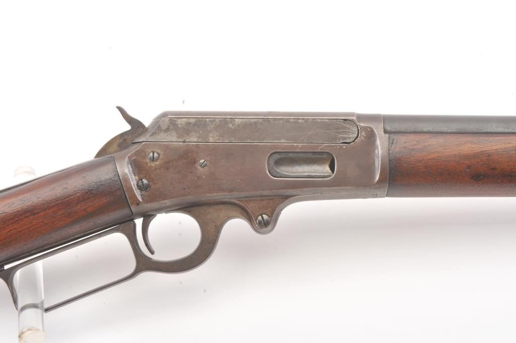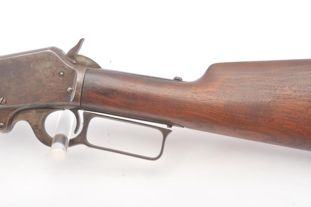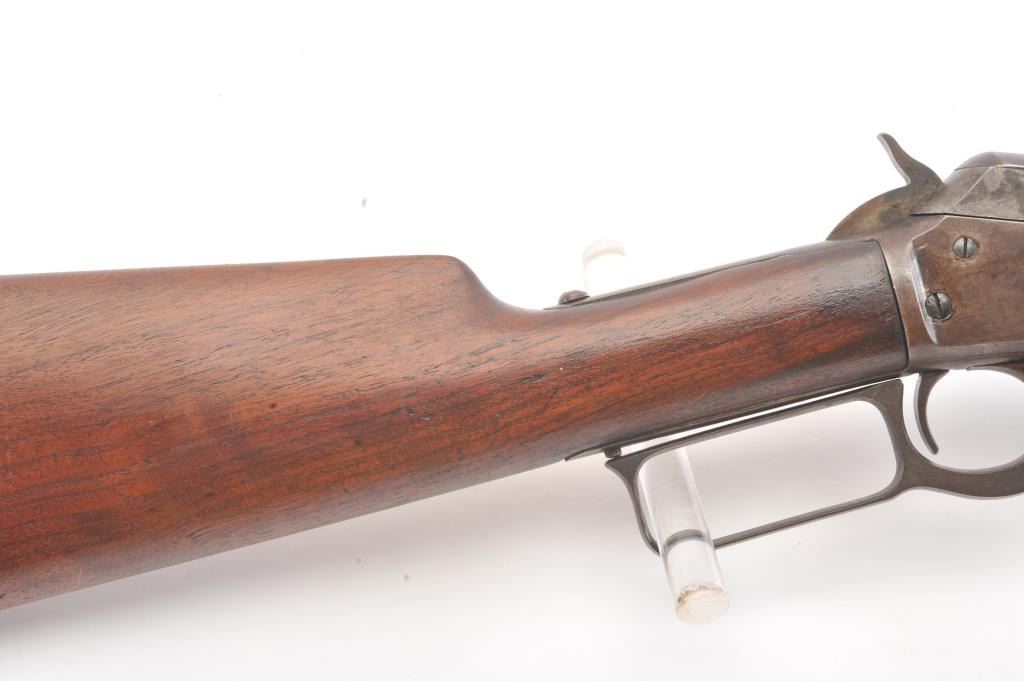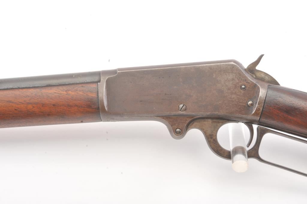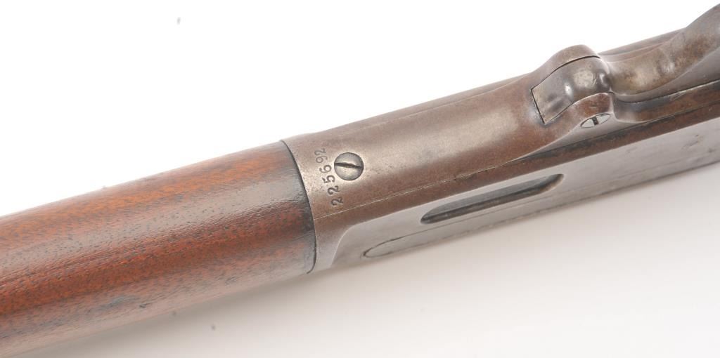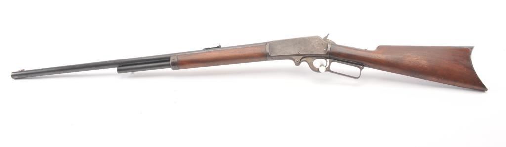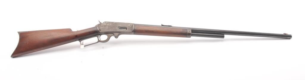 Marlin Model 1893 lever action rifle, .38-55 caliber, Serial #225692. The rifle is in good overall condition with a 26” round barrel with a half-magazine. The barrel and magazine have gone to a dark brown patinawith a knife blade front and two-leaf folding rear sights. The magazine has been period altered to a half-magazine. The smooth wood stocks are in very good condition with small mars, pressure dents and a smooth steelcrescent butt plate. The bore is fair, the action is crisp and the markings are sharp on this desirable Marlin in the venerable .38-55 chambering. Est.: $750-$1,500. (Antique).