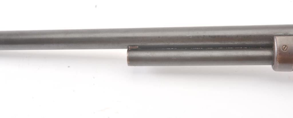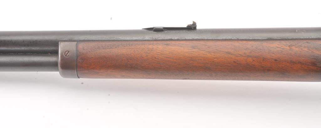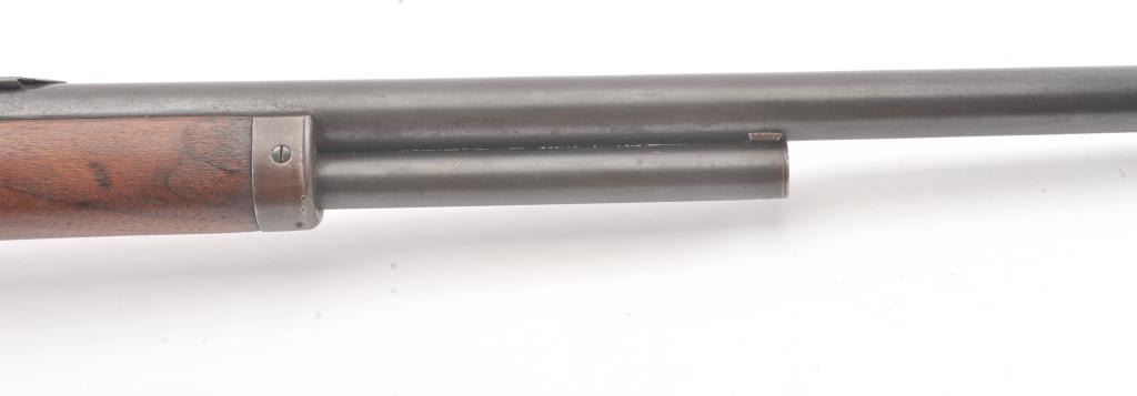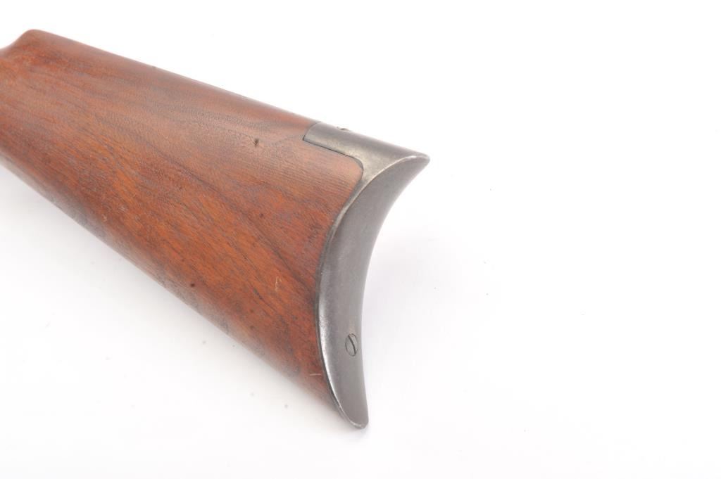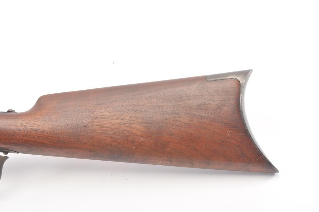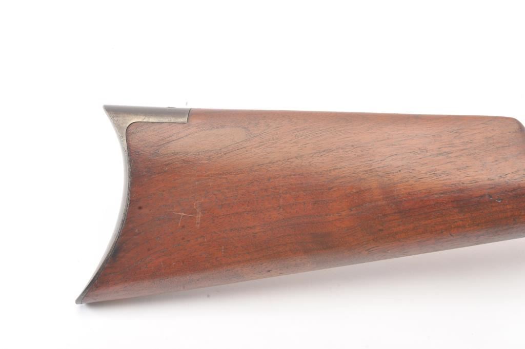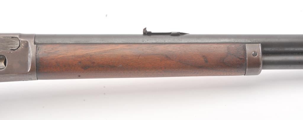 Marlin Model 1893 lever action rifle, .38-55 caliber, Serial #225692. The rifle is in good overall condition with a 26” round barrel with a half-magazine. The barrel and magazine have gone to a dark brown patinawith a knife blade front and two-leaf folding rear sights. The magazine has been period altered to a half-magazine. The smooth wood stocks are in very good condition with small mars, pressure dents and a smooth steelcrescent butt plate. The bore is fair, the action is crisp and the markings are sharp on this desirable Marlin in the venerable .38-55 chambering. Est.: $750-$1,500. (Antique).