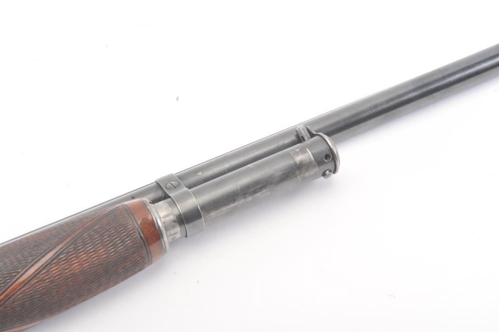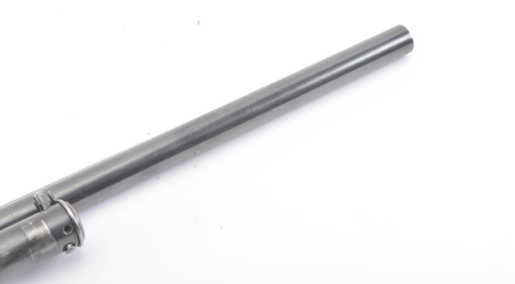 Winchester Model 12 12 GA barrel with fore end Simmons ribbed and refinished. Measures 29 ¾” and was choked full with some choke left (About Mod.). Good as refinished, S/N 758565. Odd rework. Marks on the barrel nearchoke marks. Est.: $100-$200